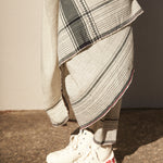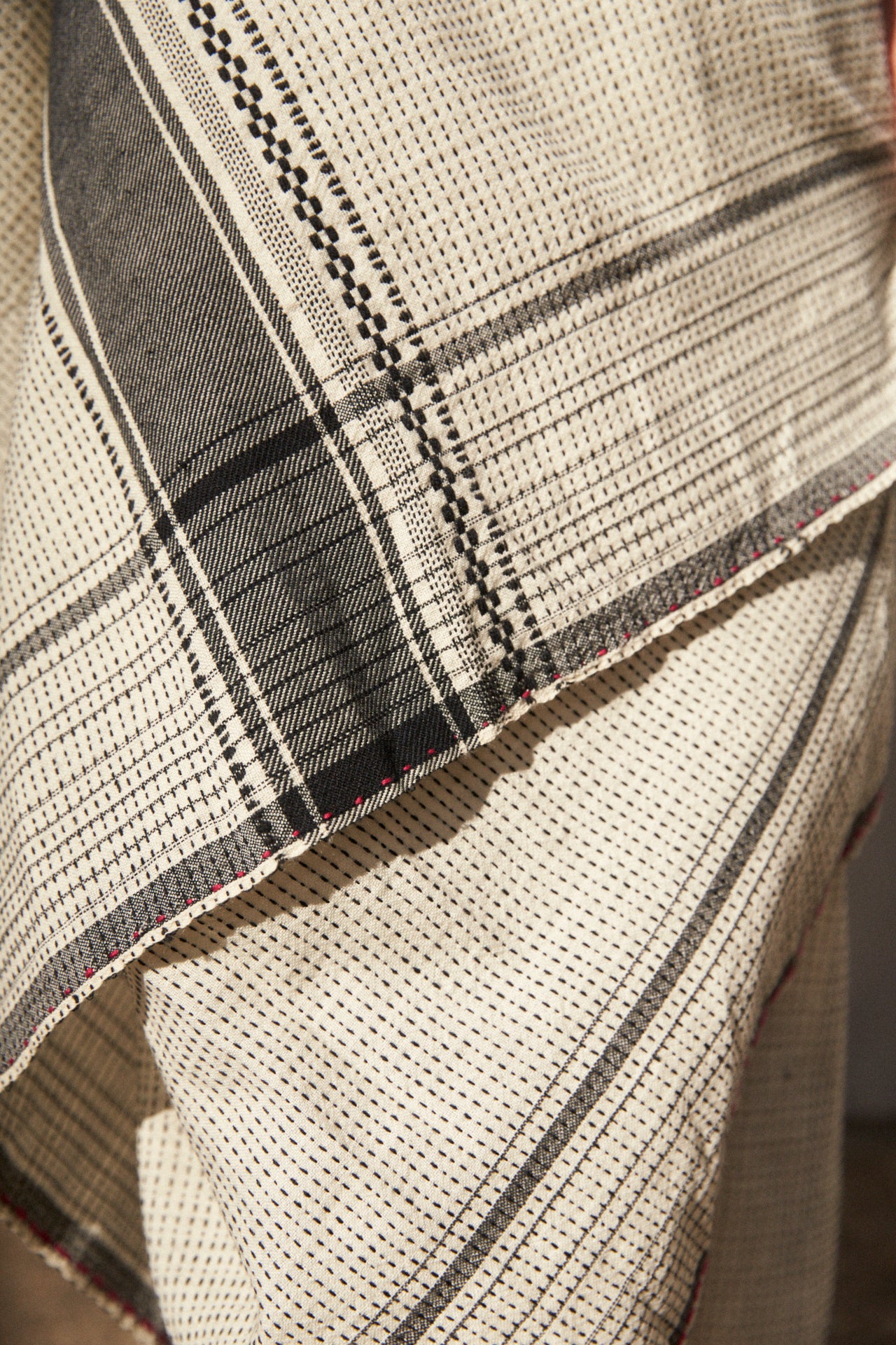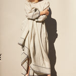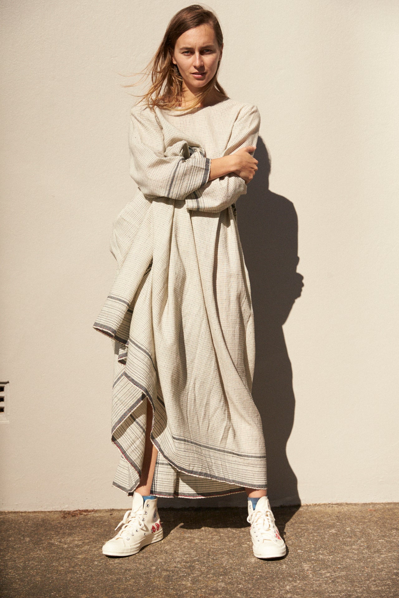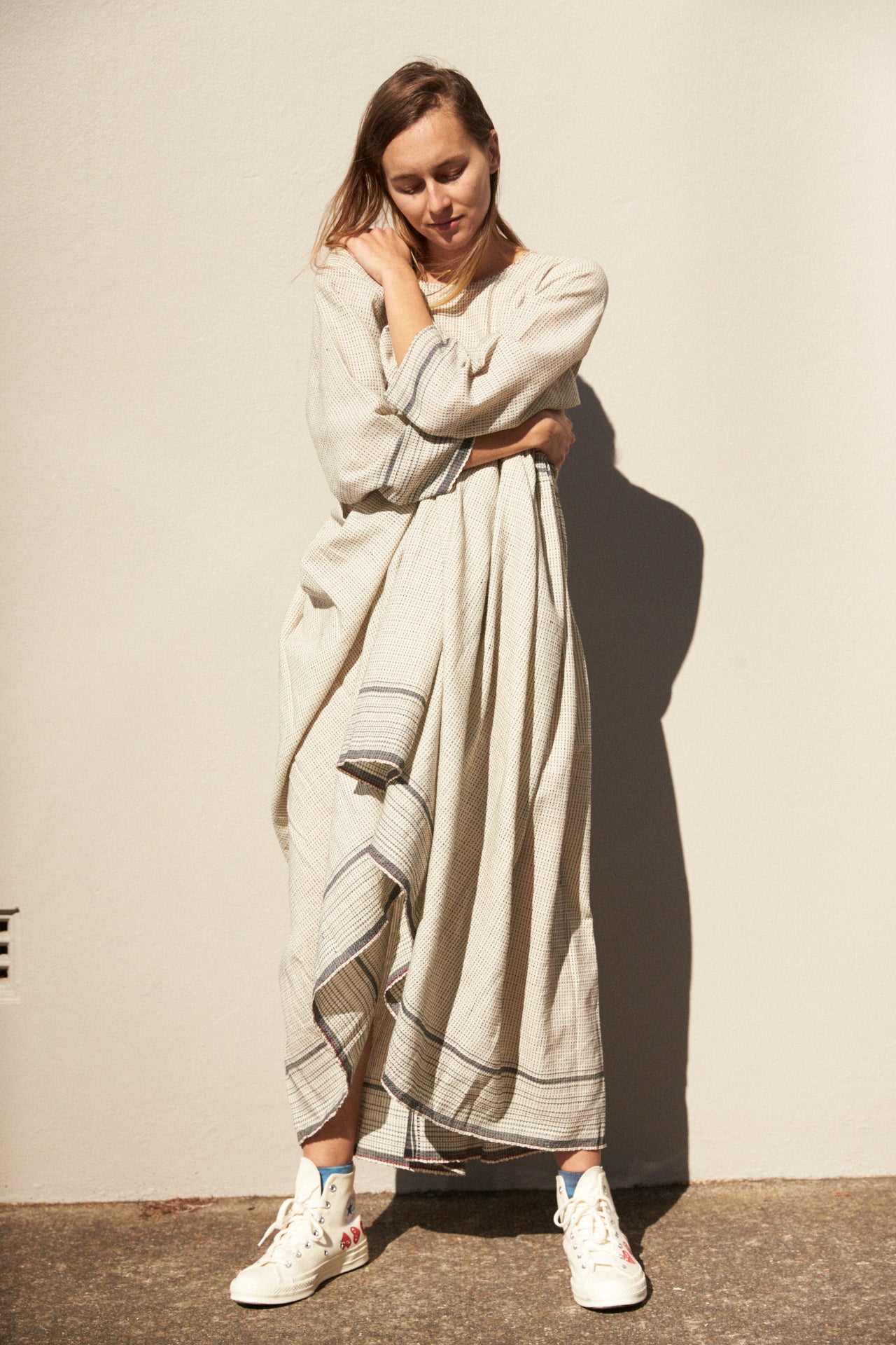 A luxury handloom wool babydoll style dress. Featuring a front round neck and button up back. Contrast pink hand stitch along neckline. Long sleeved with side slit pockets. Slightly oversized with drop shoulders. Horizontal and vertical woven stripes through the dress.