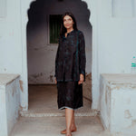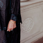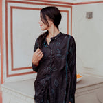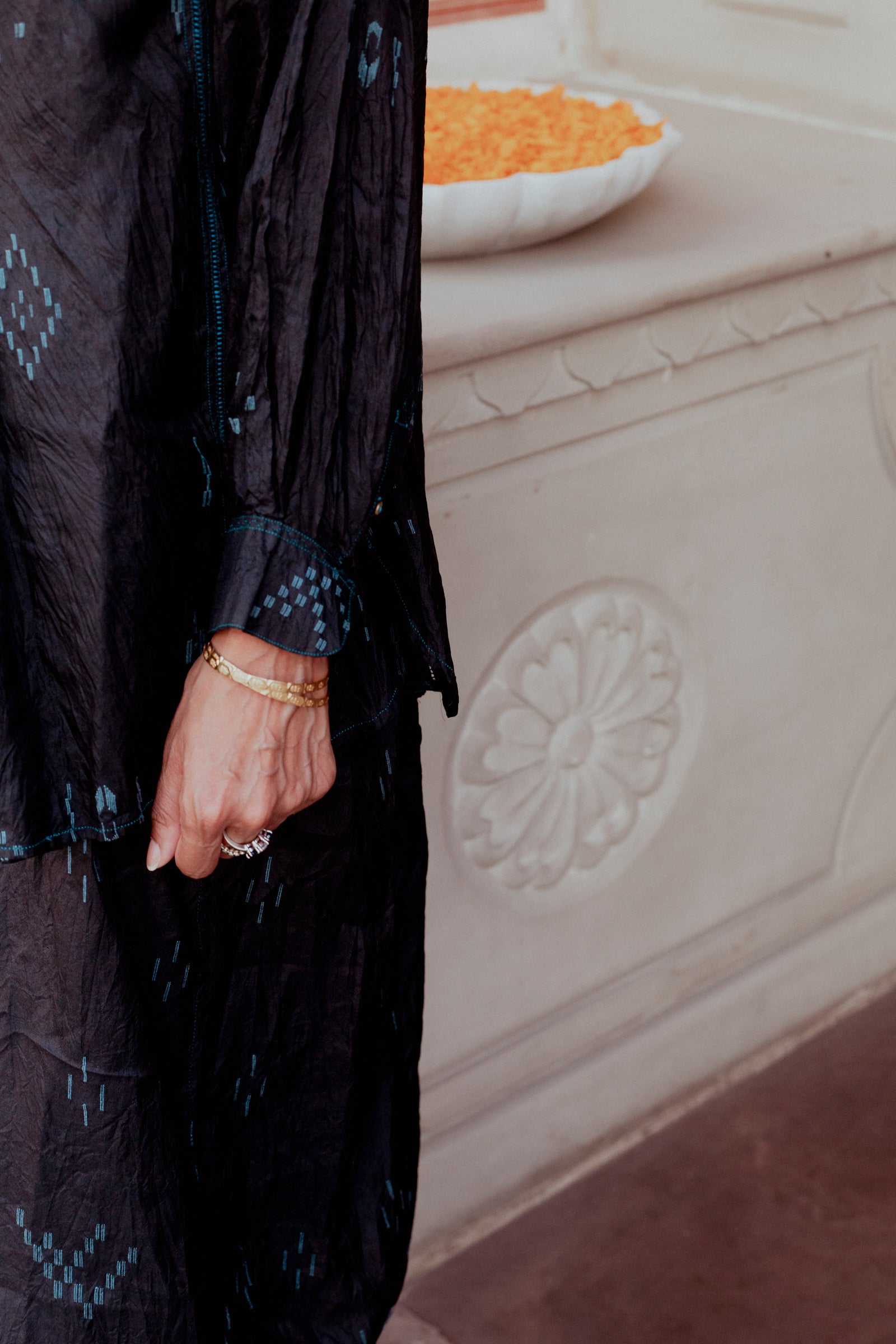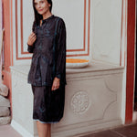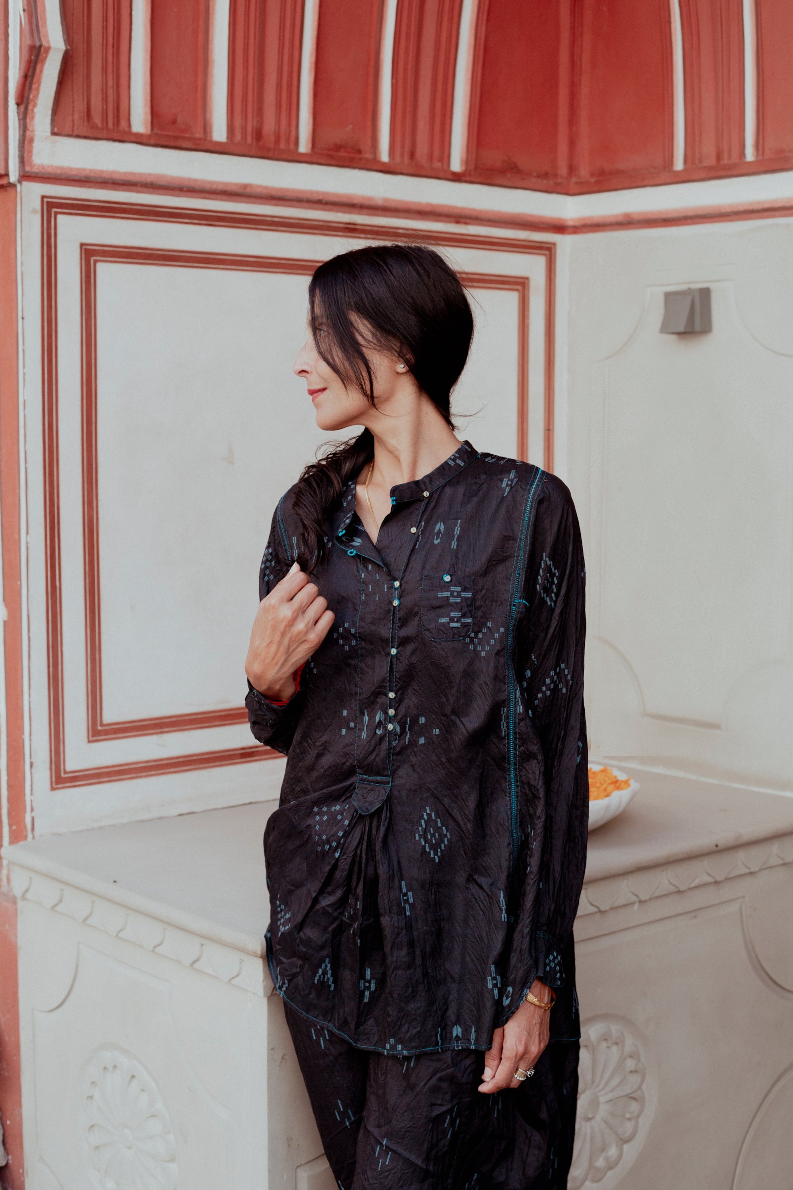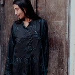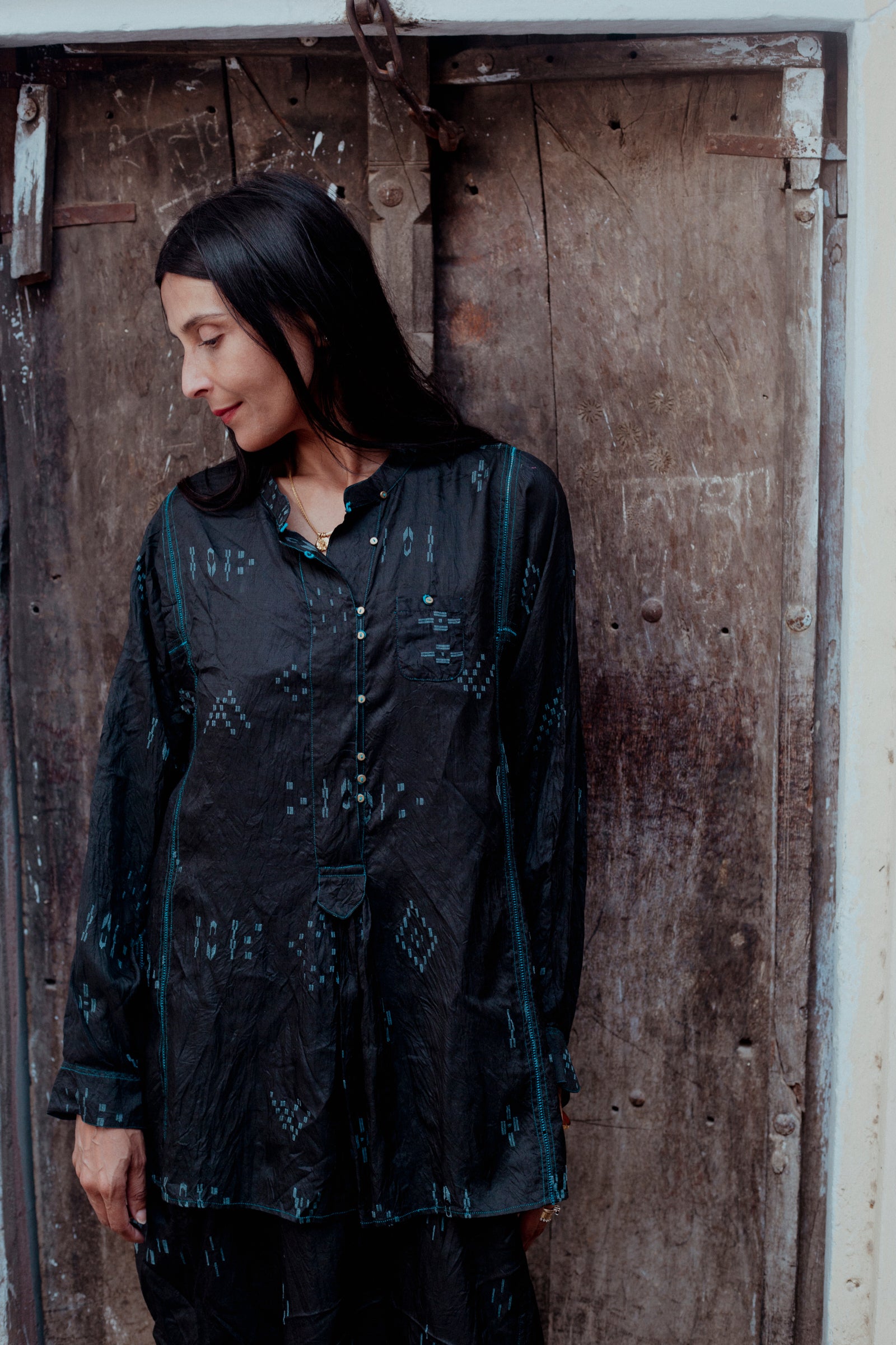A beautiful handloom silk shirt. Features a high collared neck with metal button down closure. Small front pocket with metal button detail. Contrast bright blue jamdani woven geometric patterns throughout garment. Long sleeved with single button closure on cuffs. Blue interlock detail along shoulder panels.