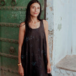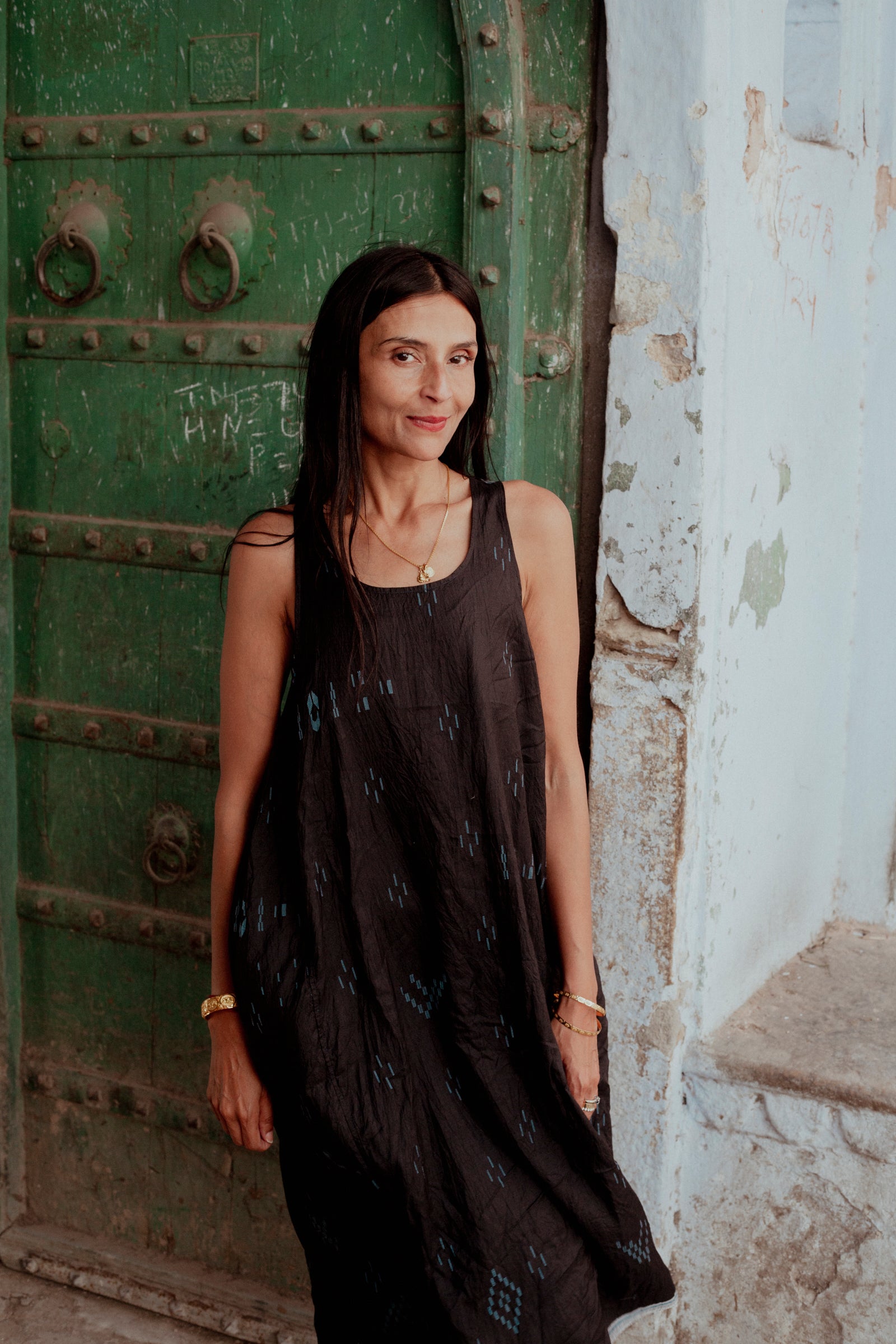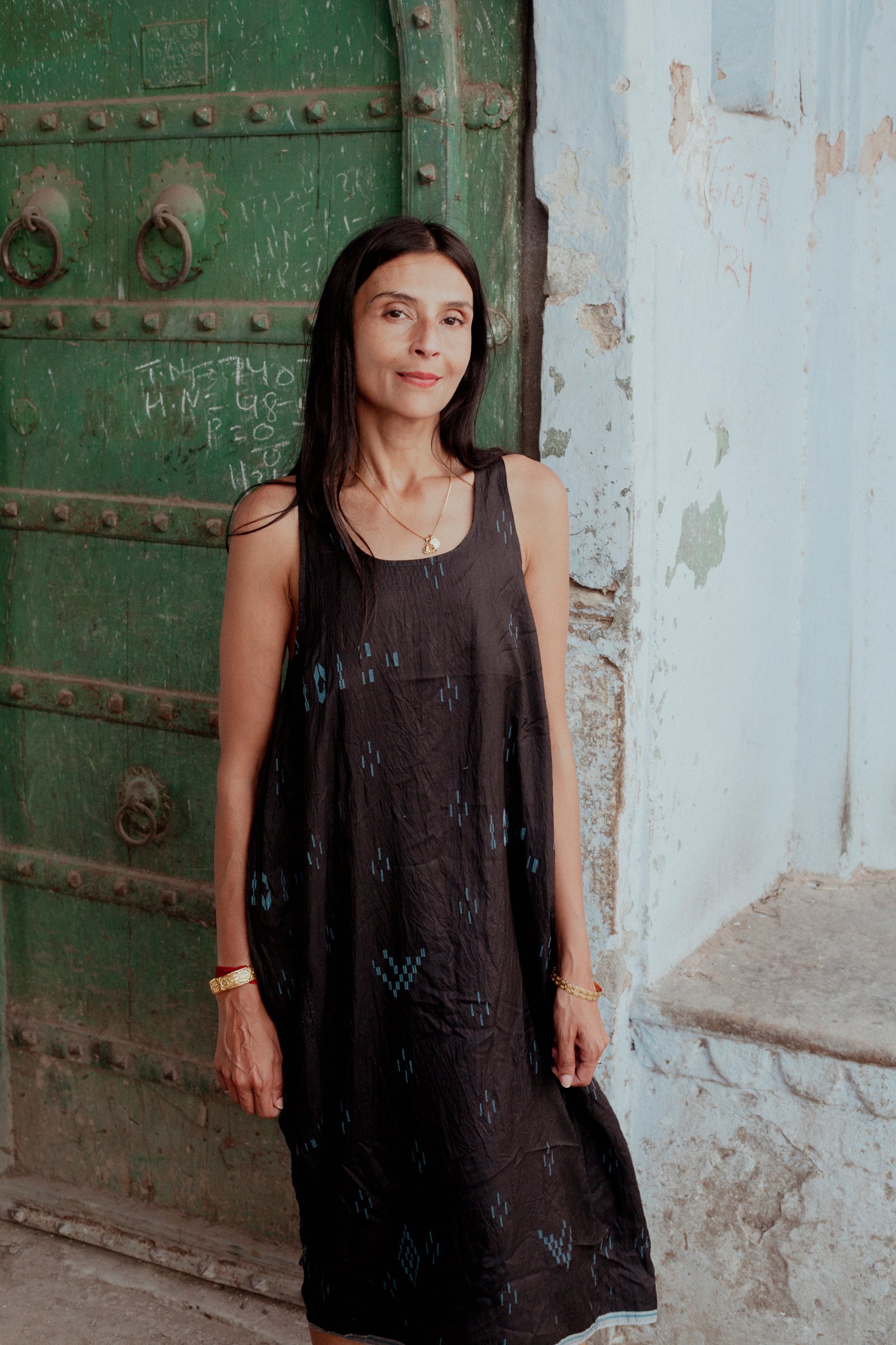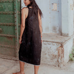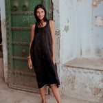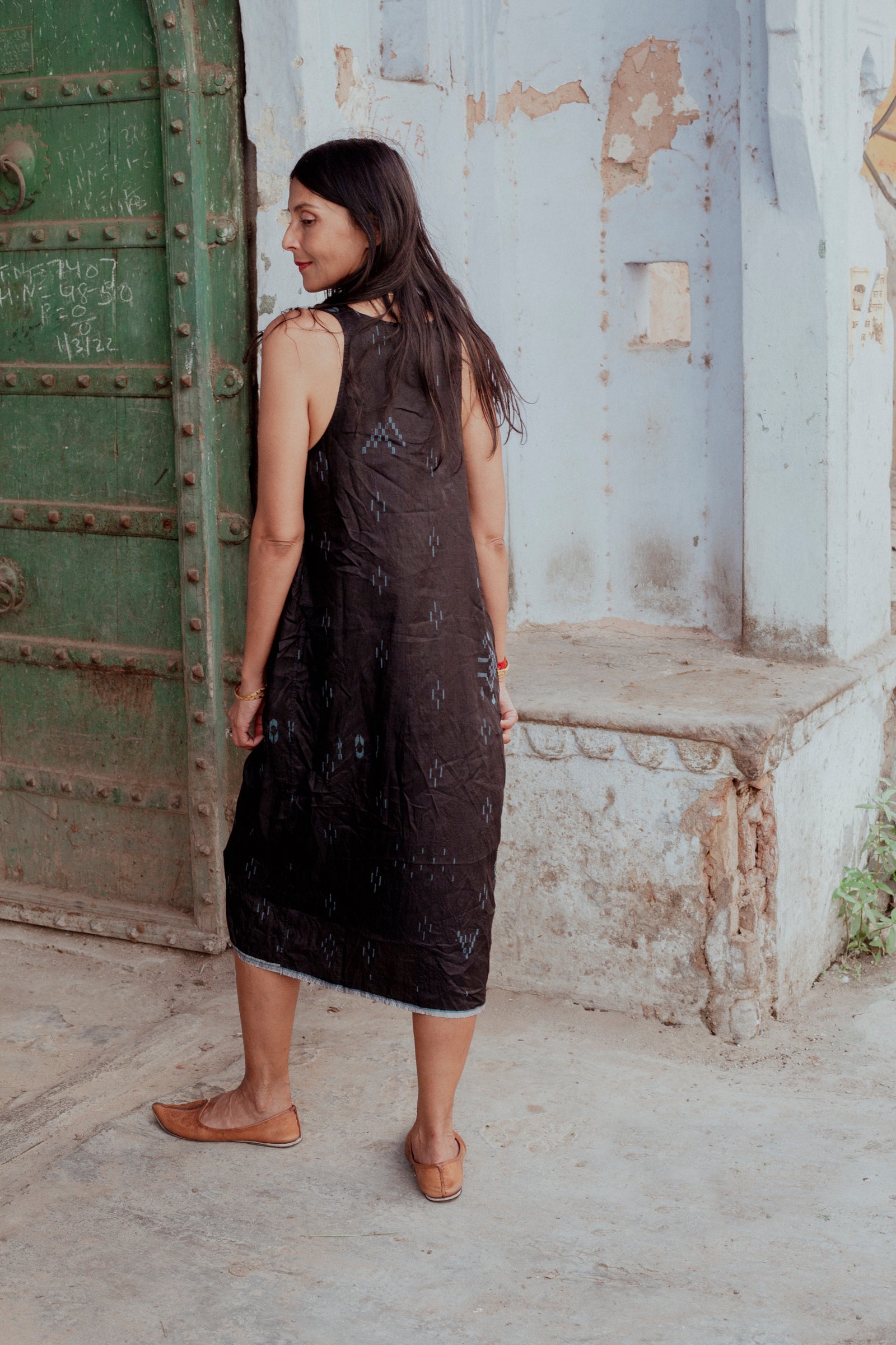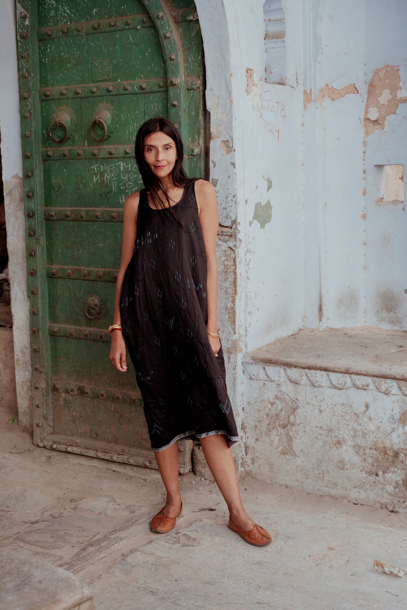 A delicately handwoven 100% silk sleeveless slip dress. A low round neck, slightly A line style. Features intricate contrast blue jamdani geometric patterns throughout the dress. Blue selvedge along hemline. Side slit pockets.
