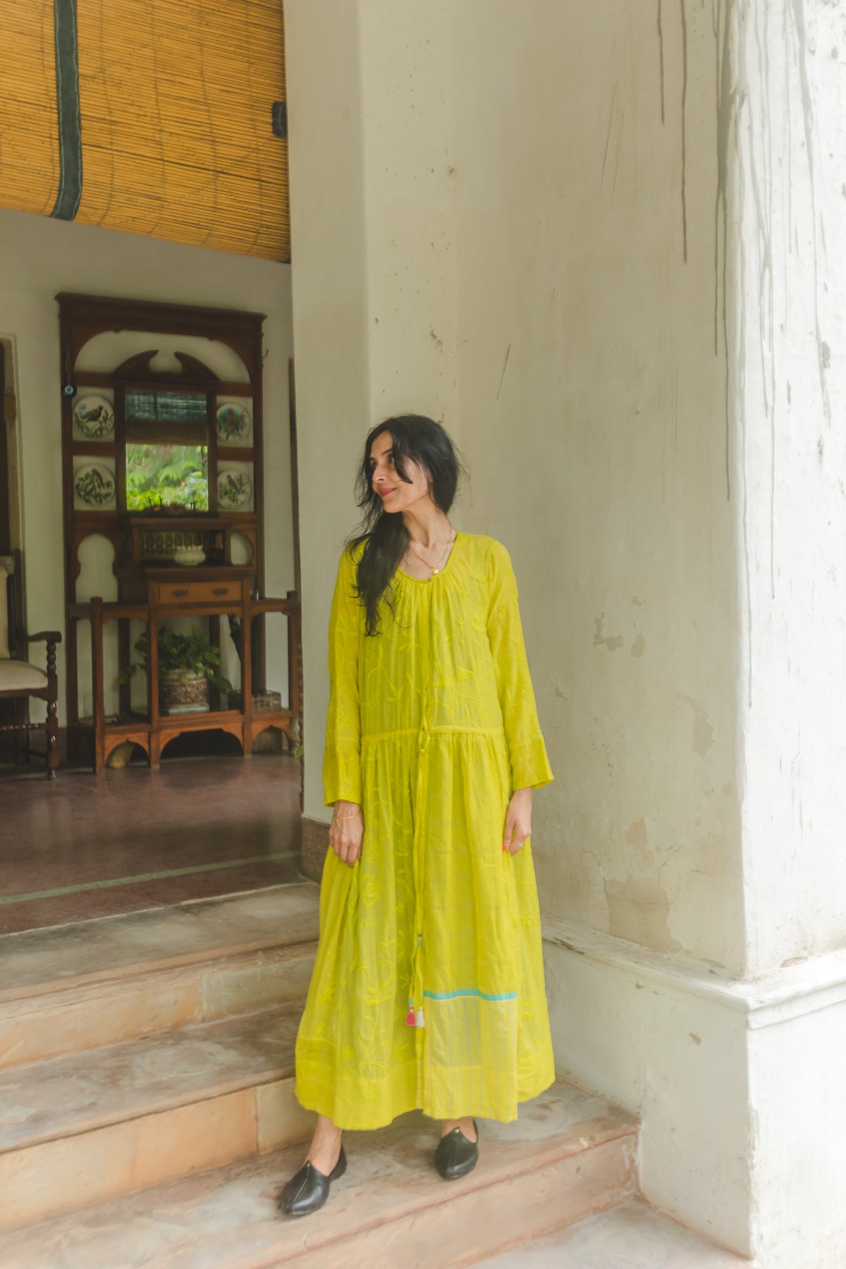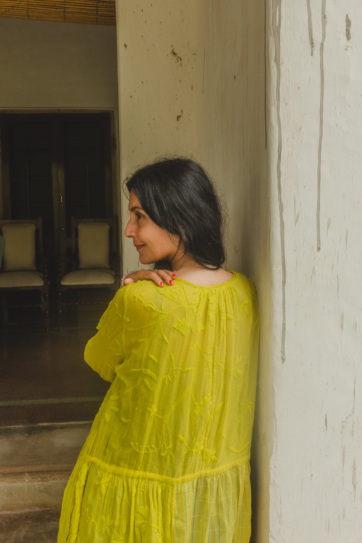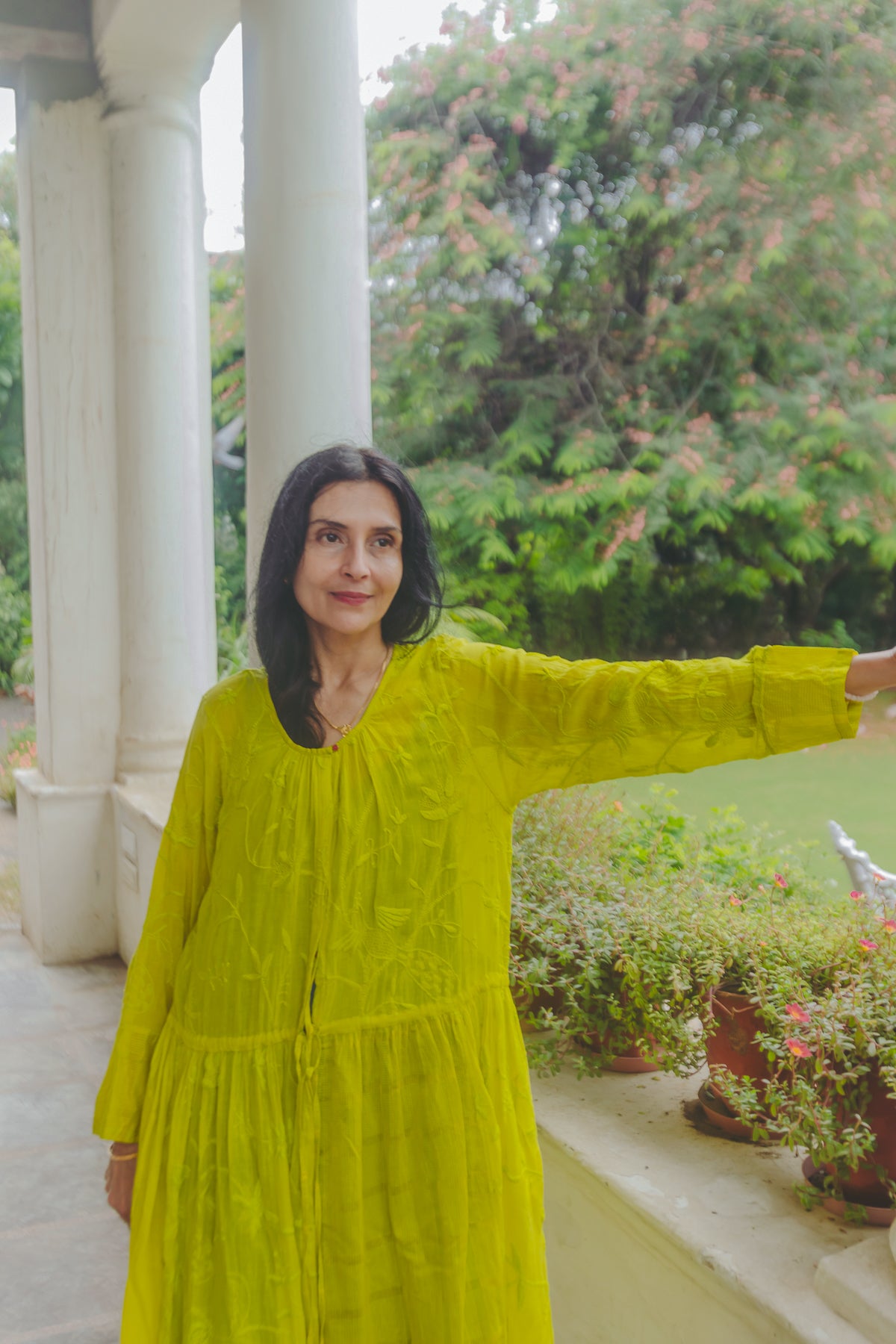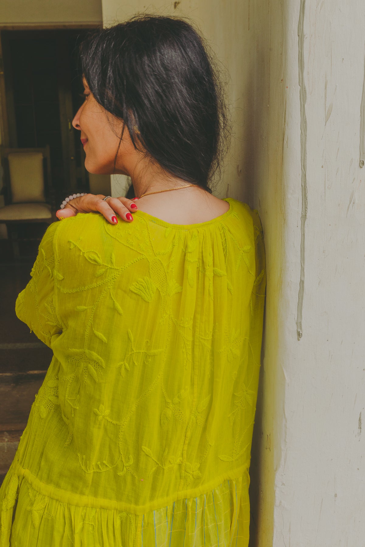 KEYA DRESS, LIME CHIKAN EMBROIDERY