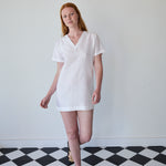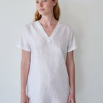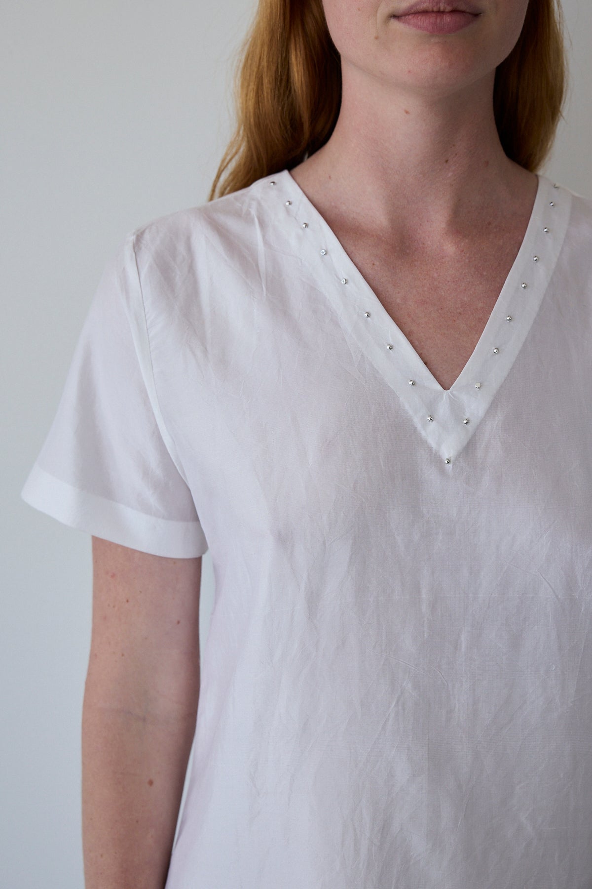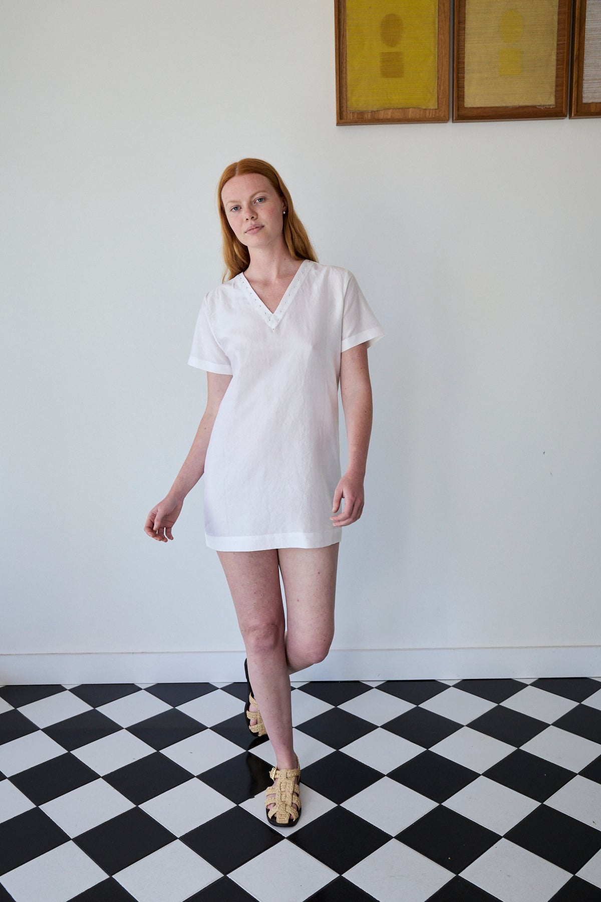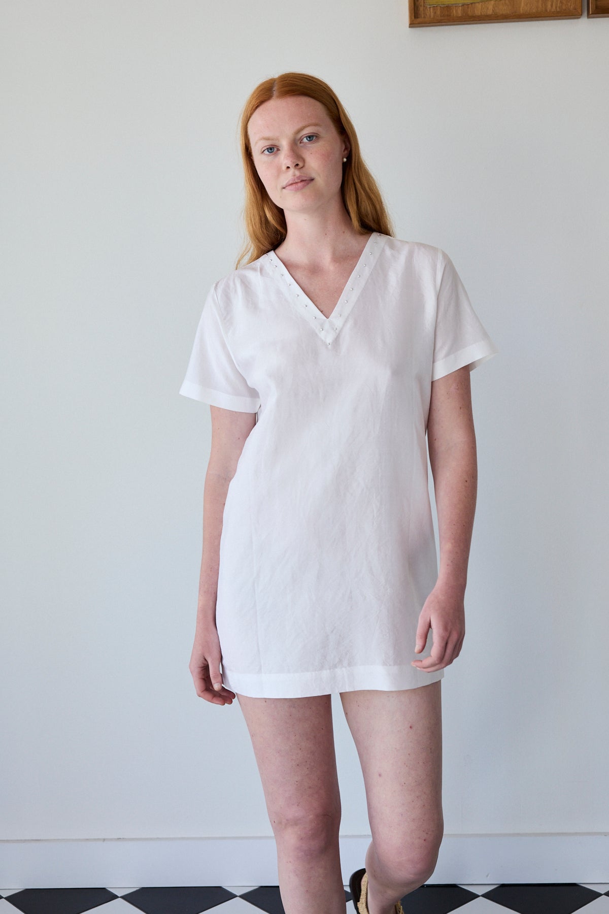 A short sleeved raw silk swing dress. A-line. Features a front V neck and open back V neck with ties for fastening. Hand embroidery studs along neckline. Can be worn over pants.