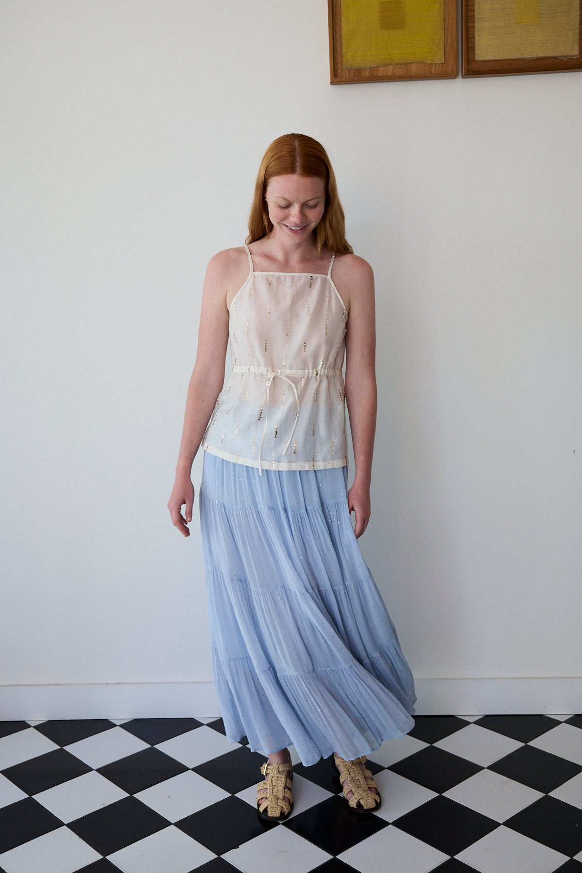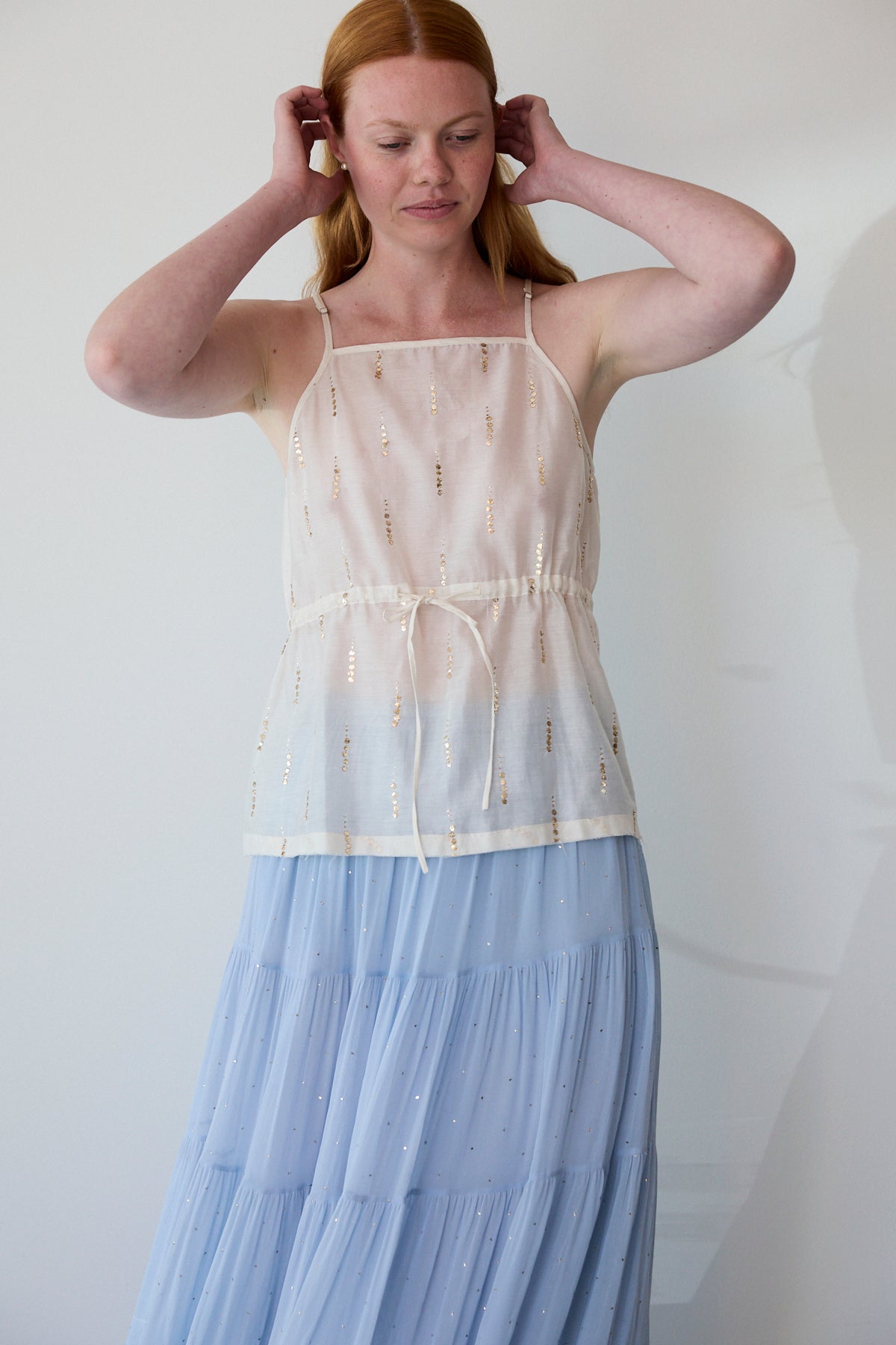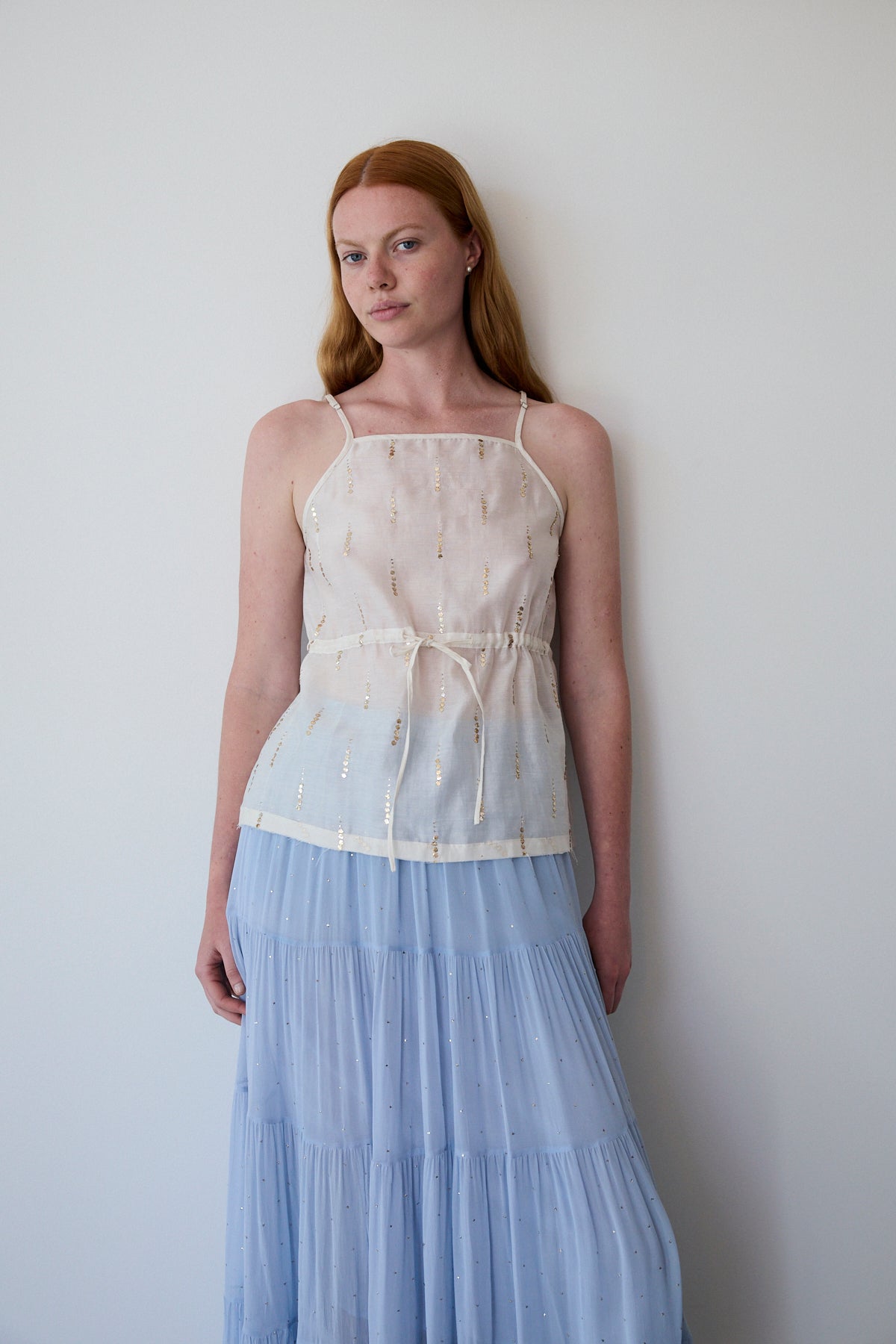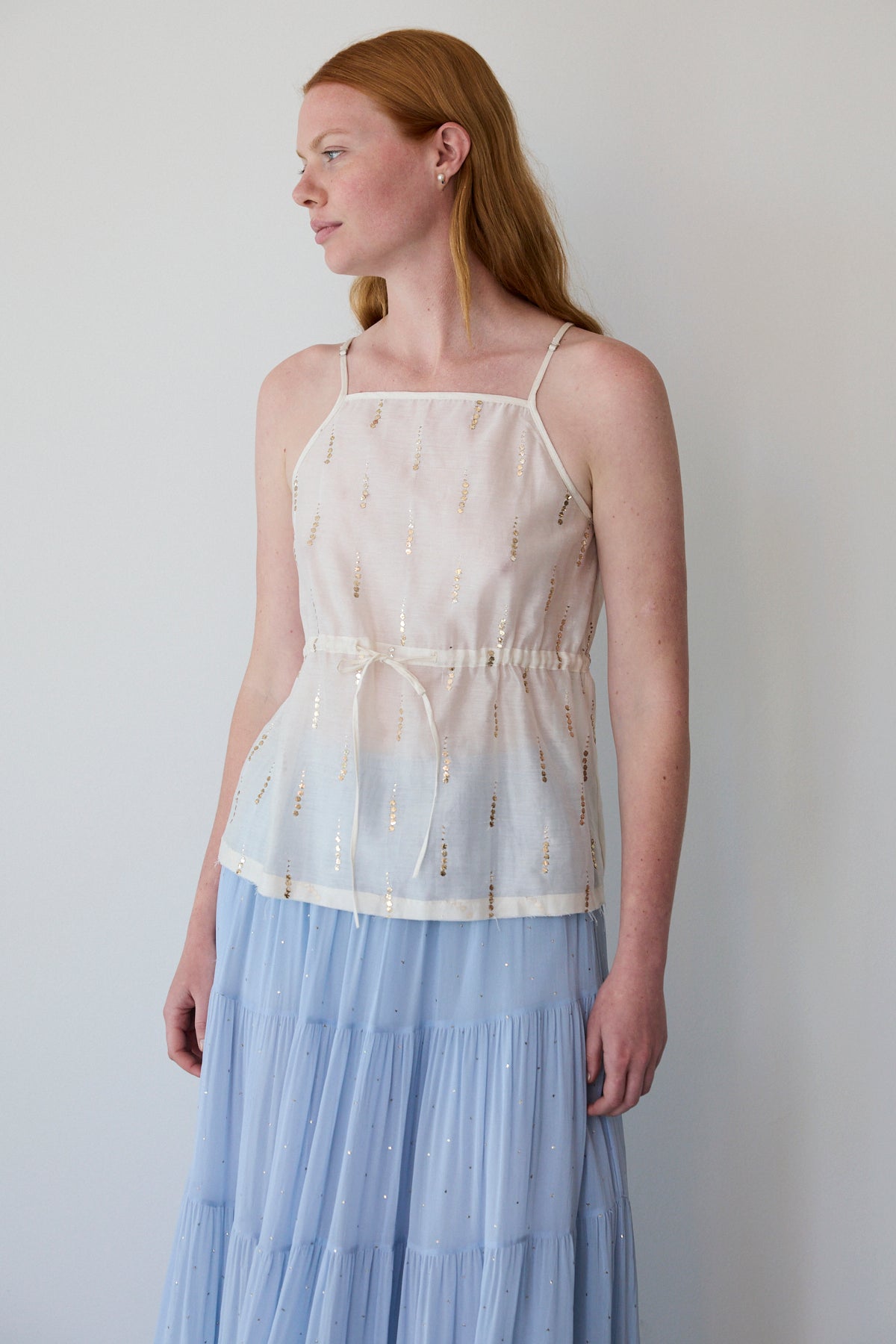 A cami top featuring silver mukeish star hand-embroidery through. Adjustable straps with straight front and back neck. Slightly A -line with tunnel and drawstring at waist for cinching in. Double raw edge detail along hemline. A sheer finish.