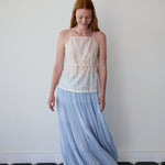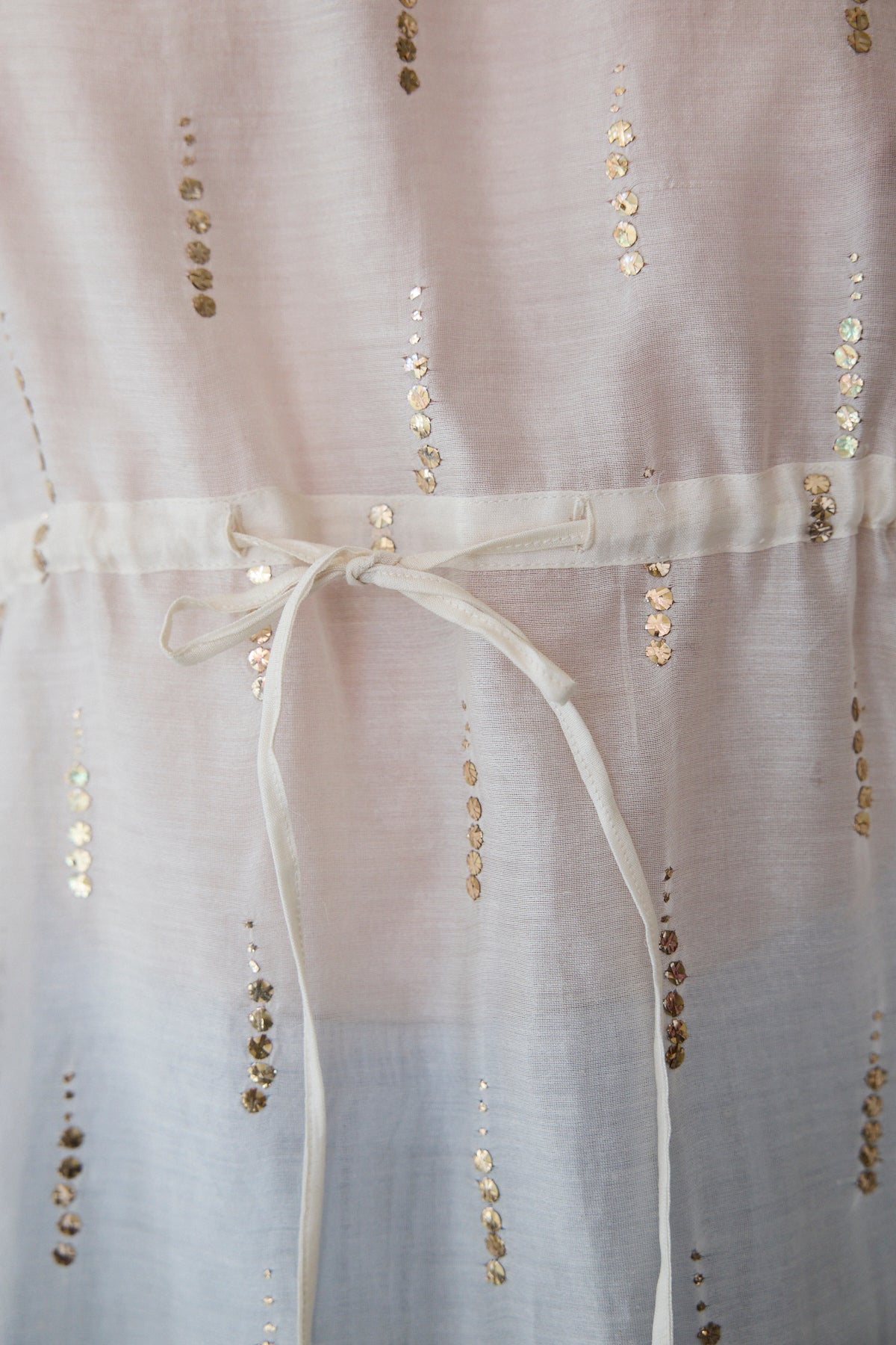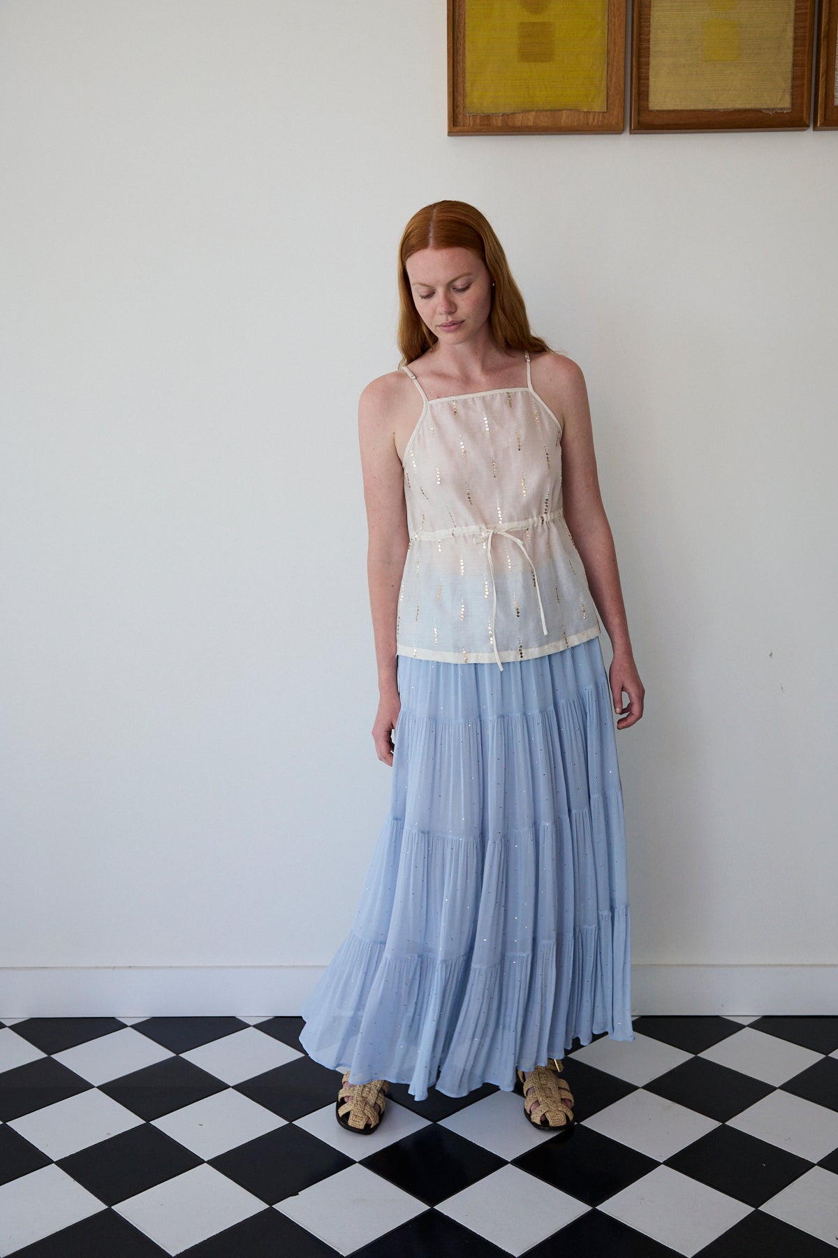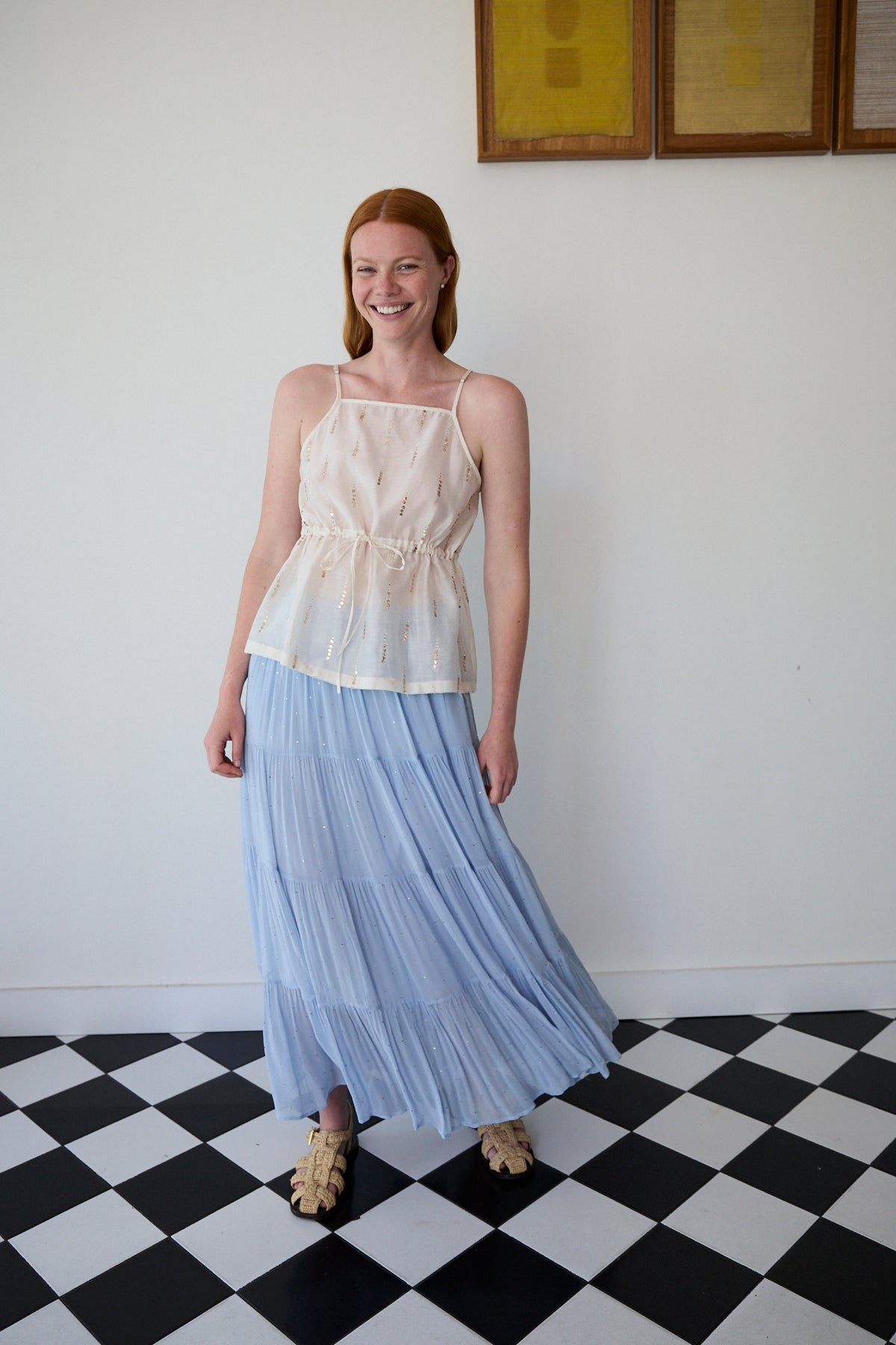 A cami top featuring silver mukeish star hand-embroidery through. Adjustable straps with straight front and back neck. Slightly A -line with tunnel and drawstring at waist for cinching in. Double raw edge detail along hemline. A sheer finish.