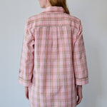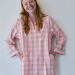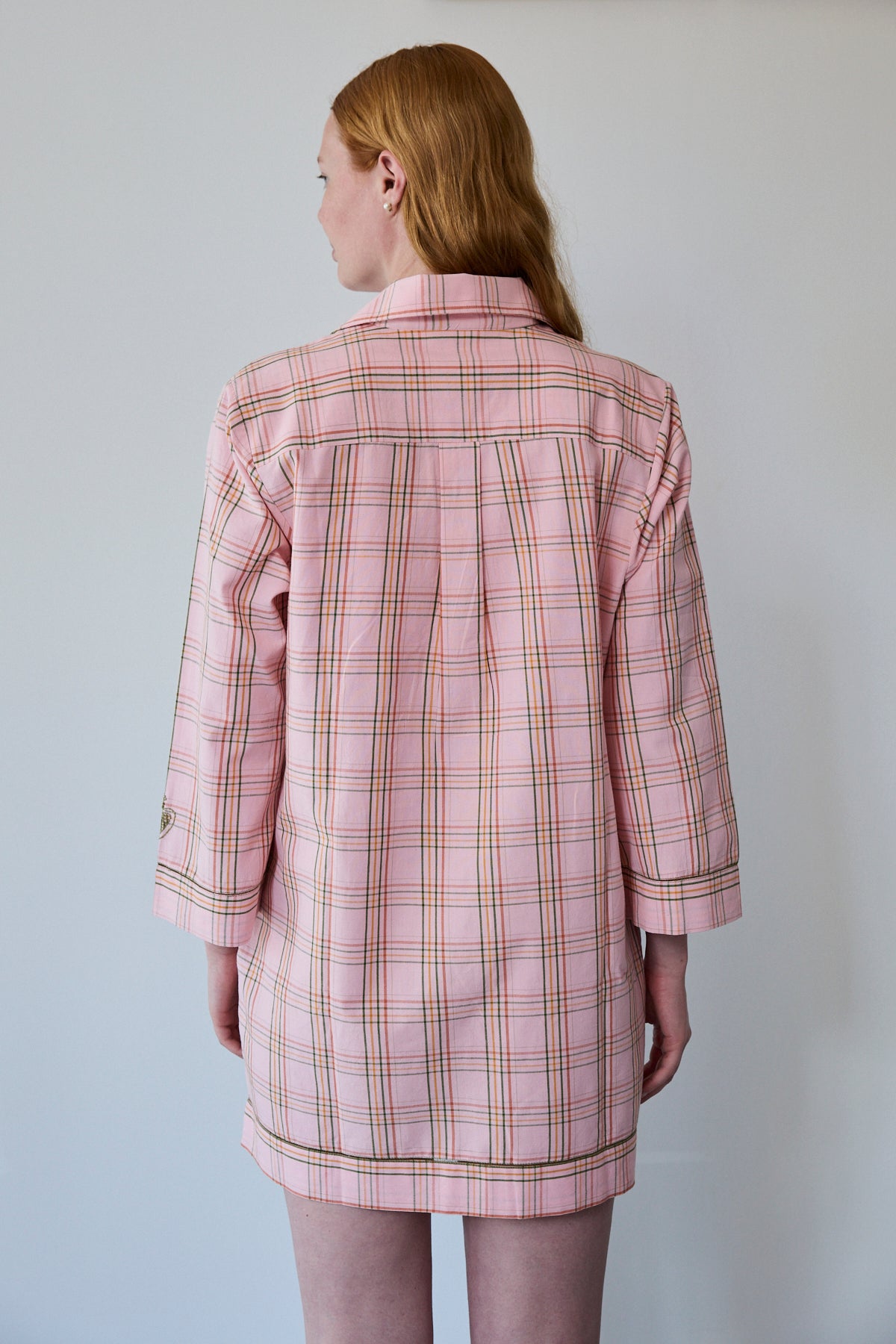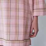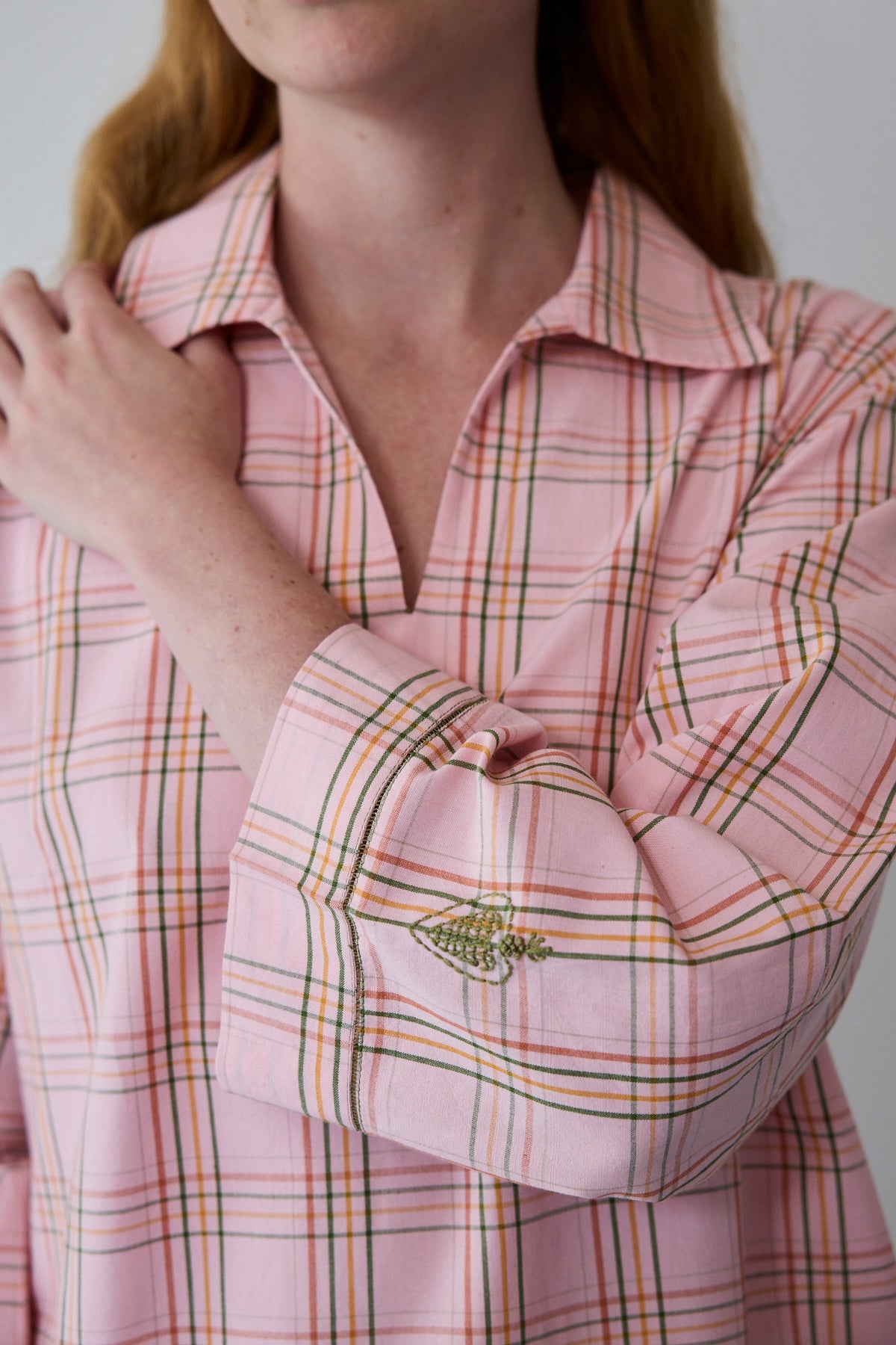 A mini tunic crafted from handloom cotton. Features front collar with pink check detail through. A straight cut with side slits and side pockets. Our signature heart embroidery detail on cuff. Olive interlock embroidery along cuffs and hemline.