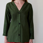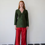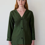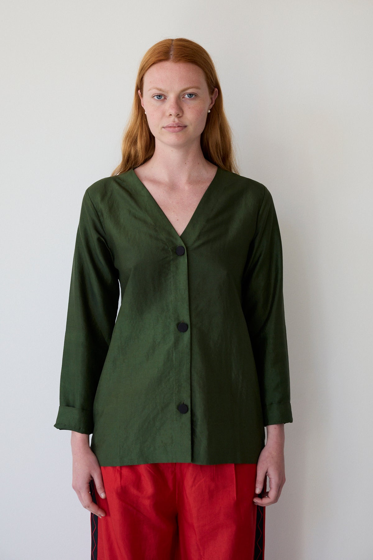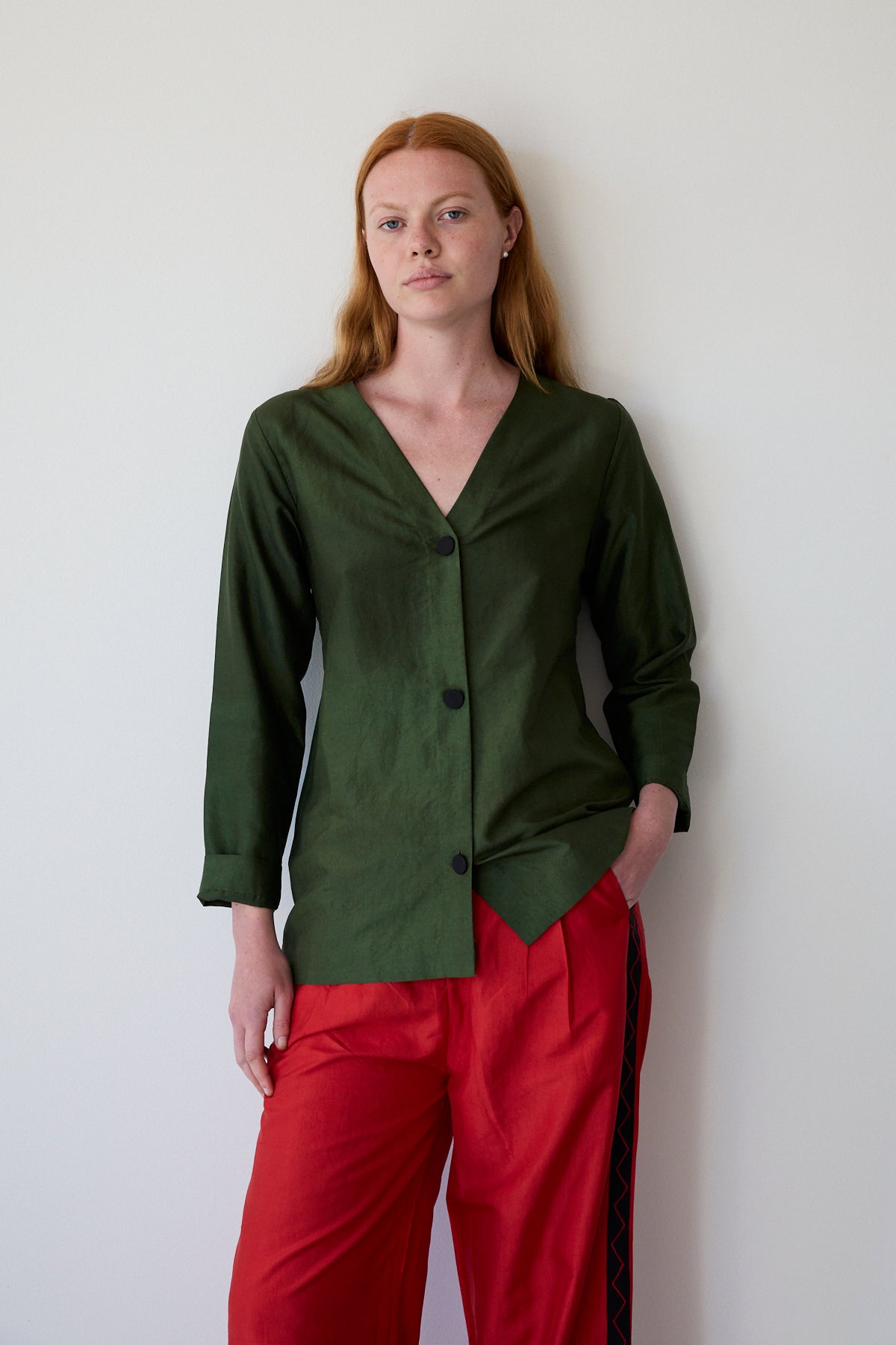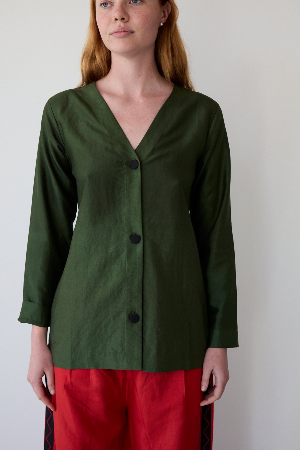 A long sleeved jacket. Features a button up front V neck with contrast fabric black button closure. Slightly A line.