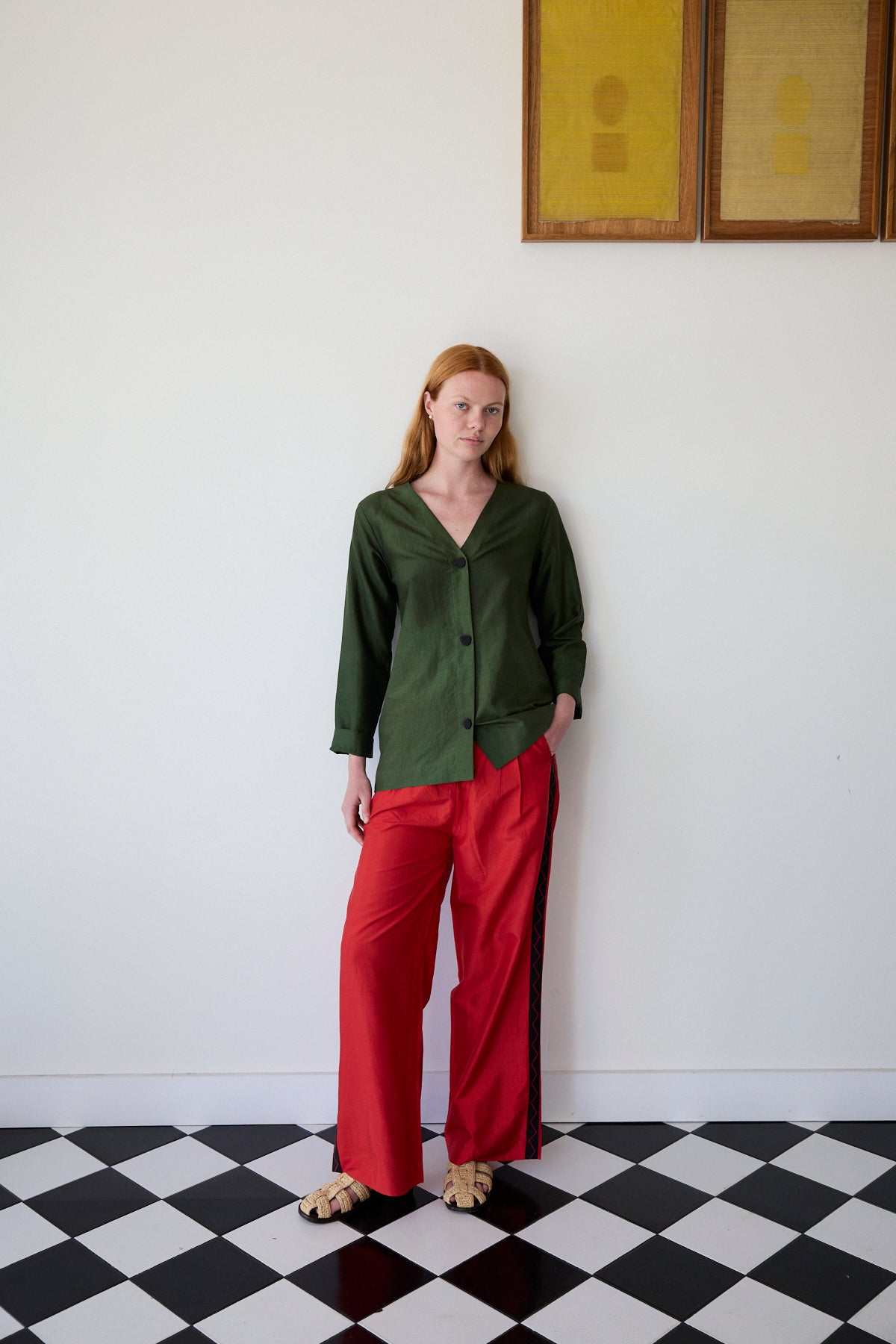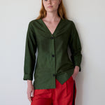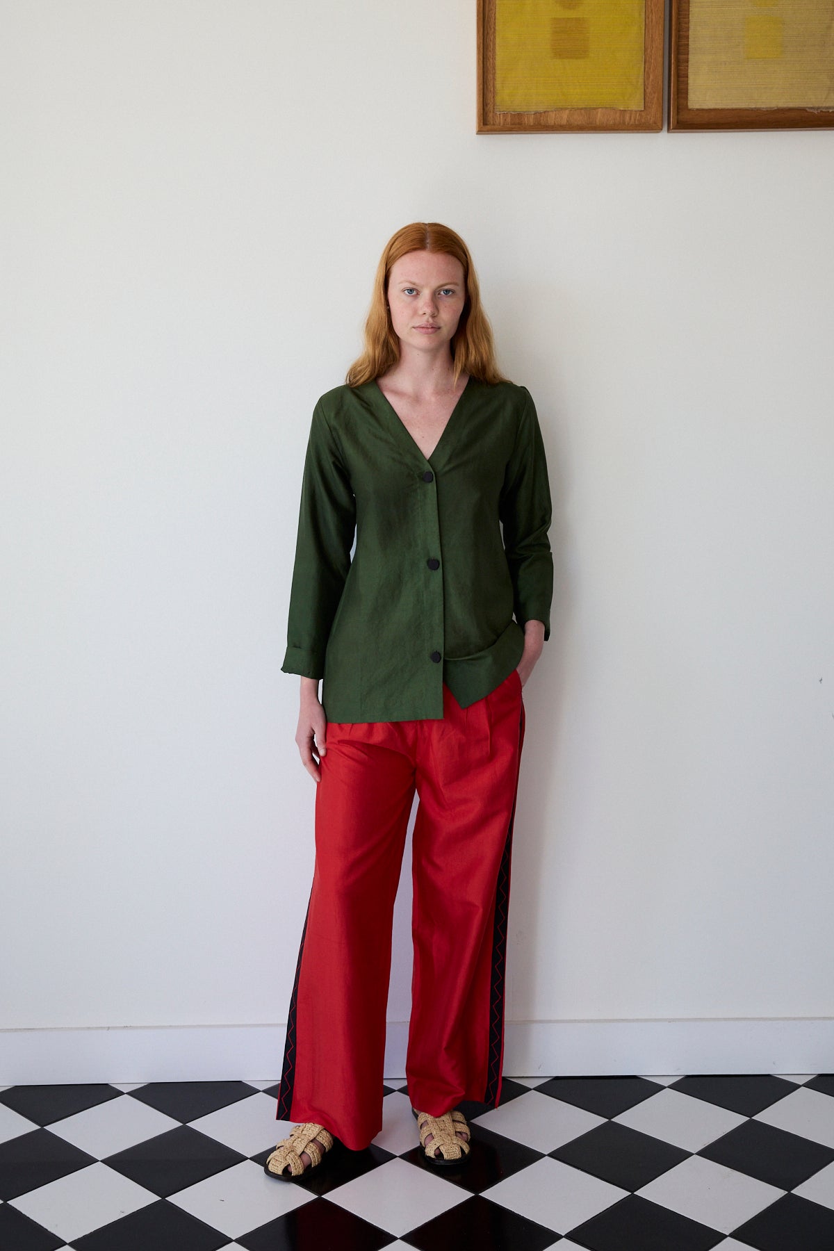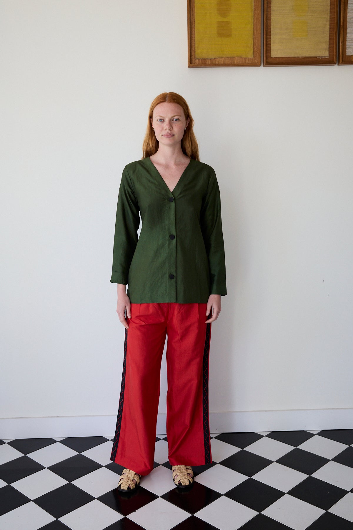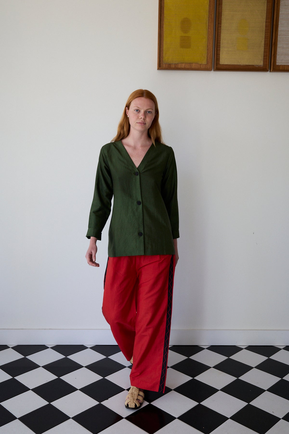 A long sleeved jacket. Features a button up front V neck with contrast fabric black button closure. Slightly A line.