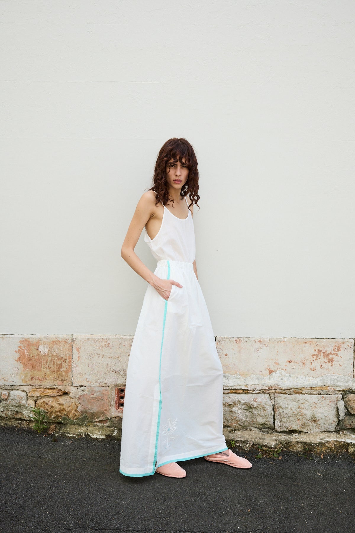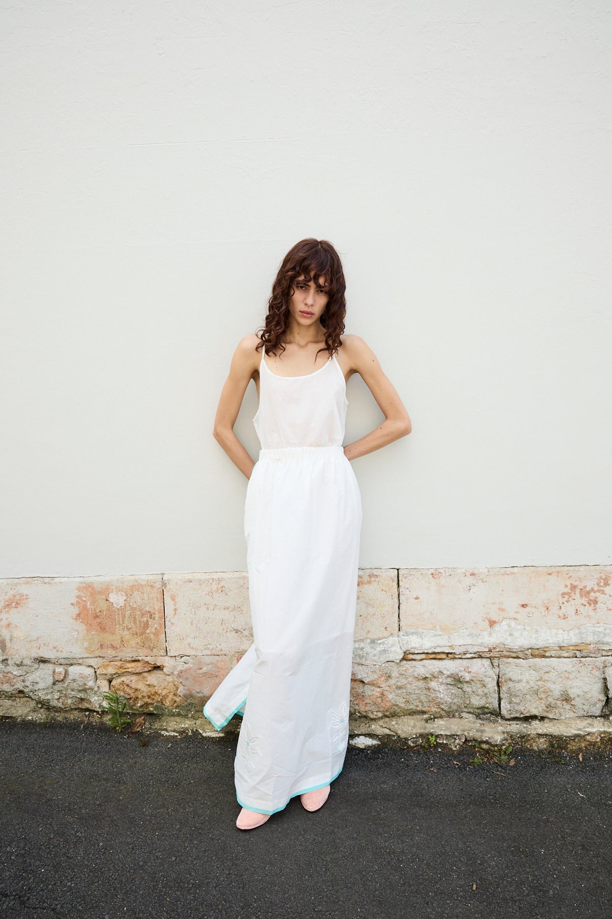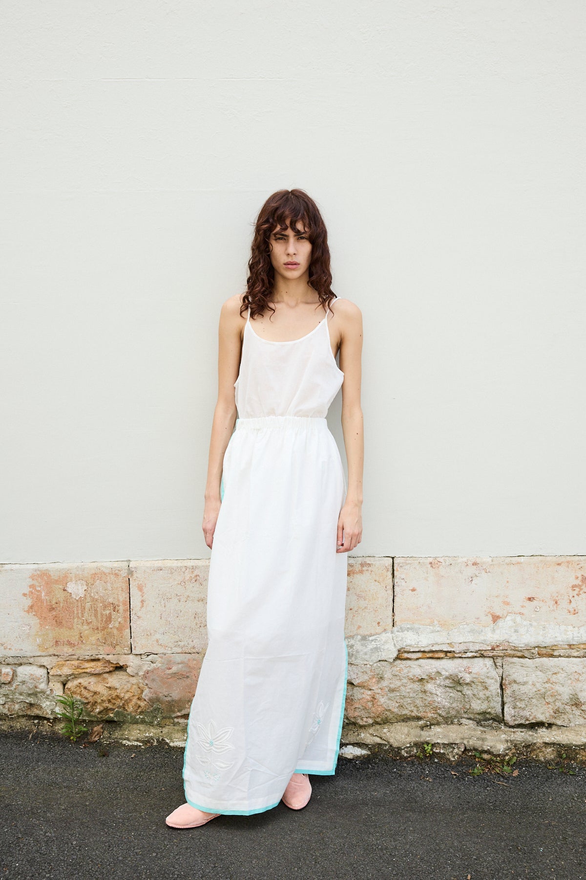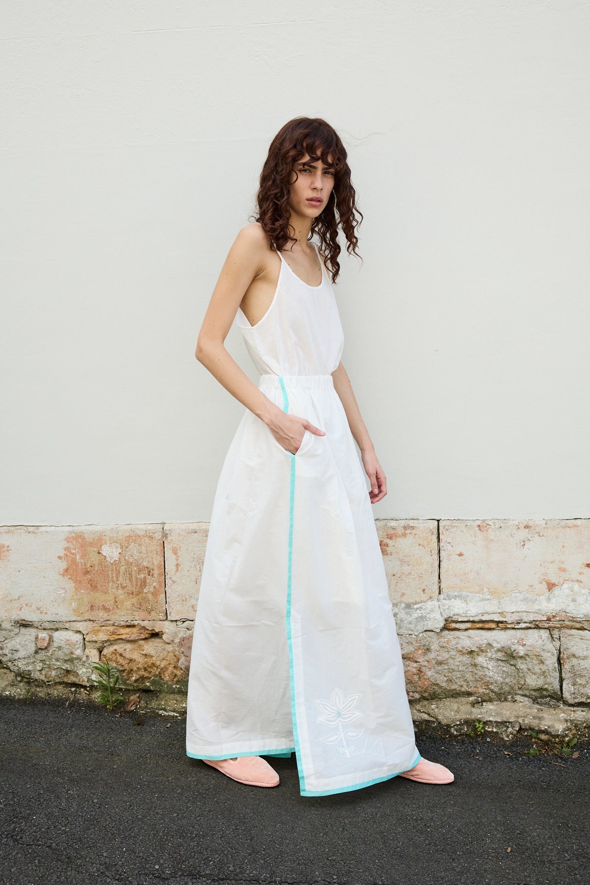 This high waisted maxi skirt featuring double hand-stitched needle floral lotus artwork motif at bottom hem of skirt. Elasticated waistband, side seam splits and internal skirt lining in a delicate light weight silk cotton blend. A classic and timeless skirt in ivory with aqua contrast seam panel border.