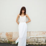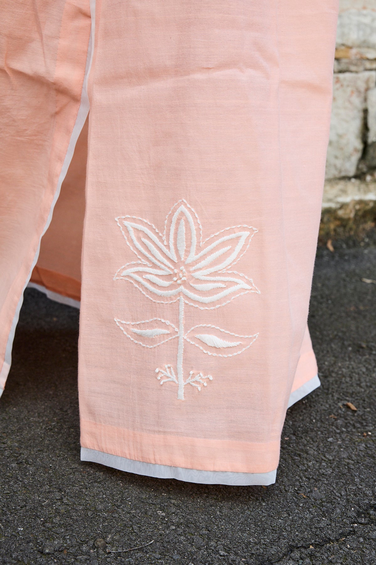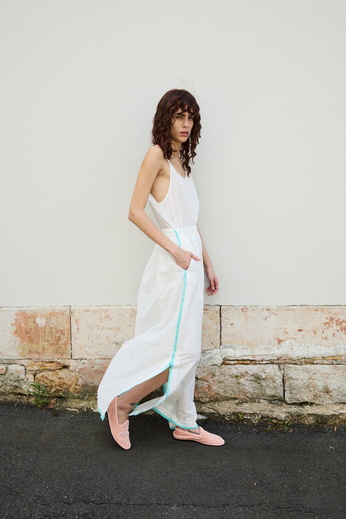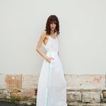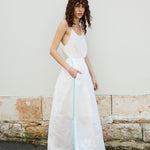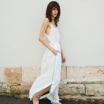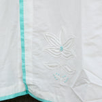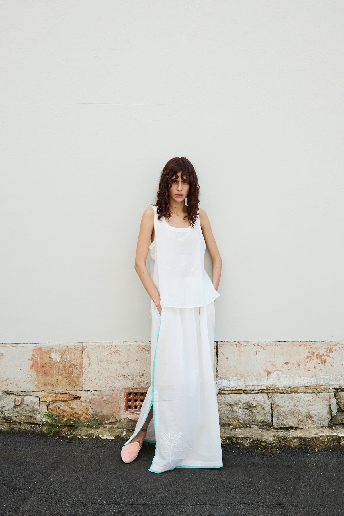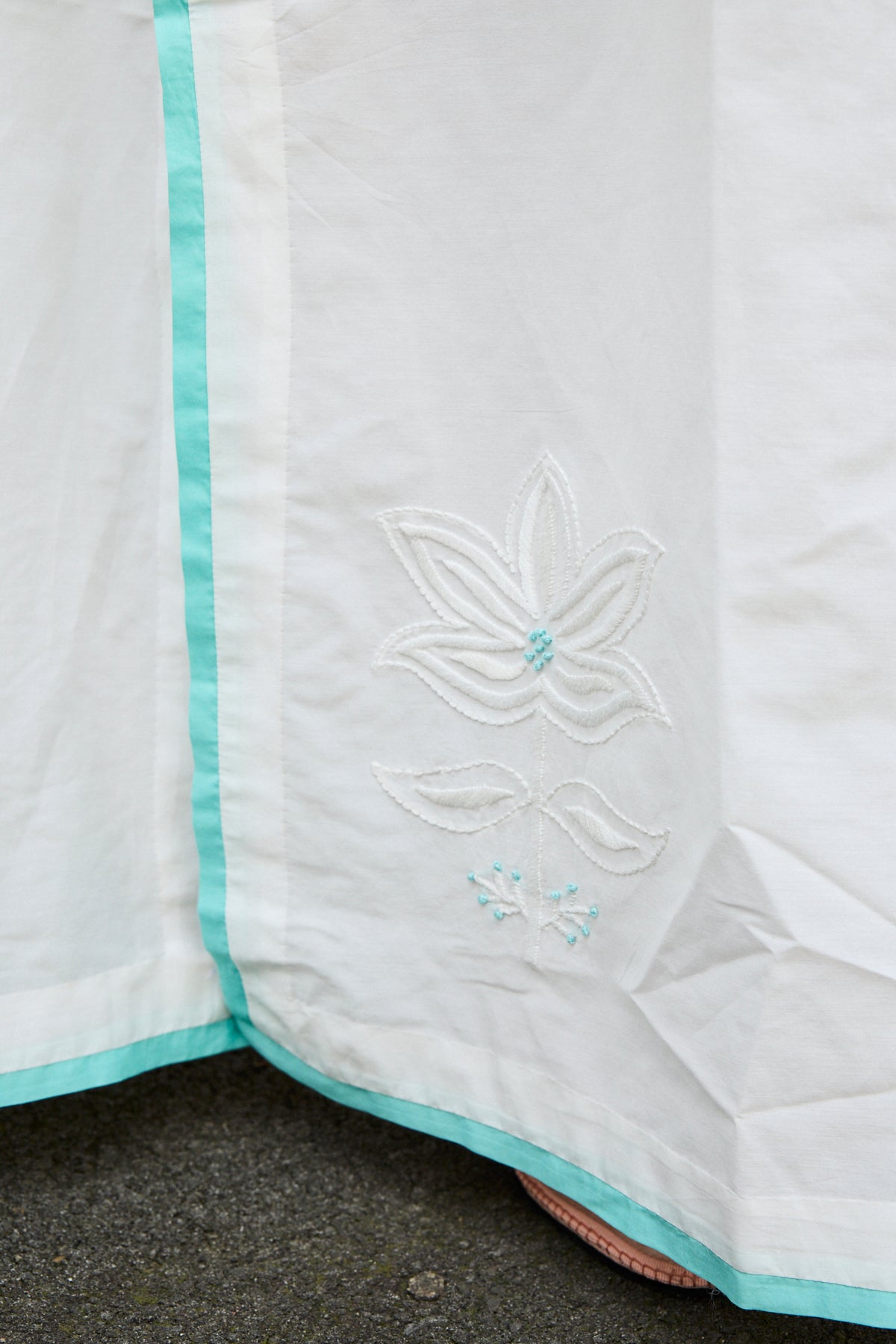This high waisted maxi skirt featuring double hand-stitched needle floral lotus artwork motif at bottom hem of skirt. Elasticated waistband, side seam splits and internal skirt lining in a delicate light weight silk cotton blend. A classic and timeless skirt in ivory with aqua contrast seam panel border.