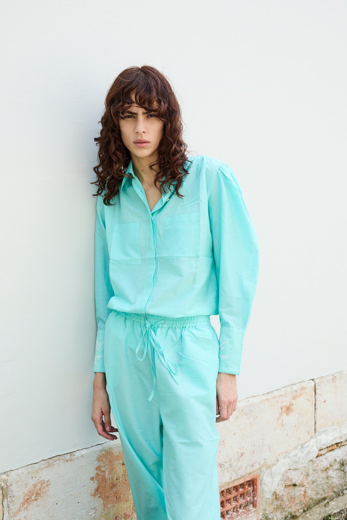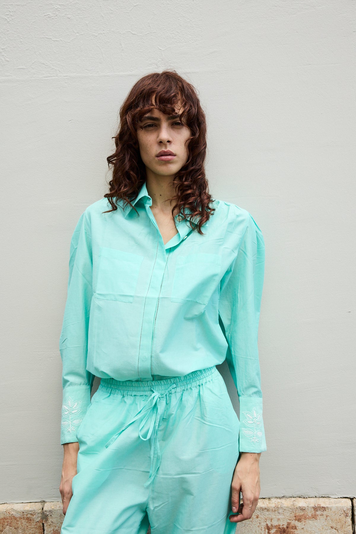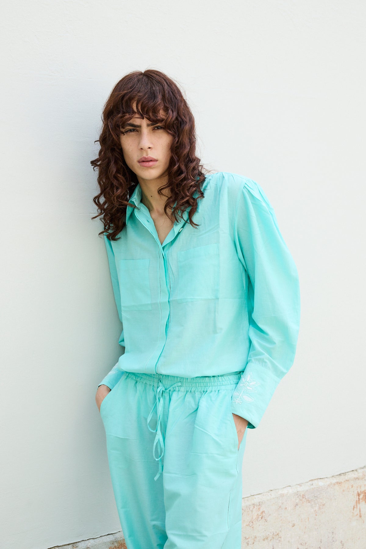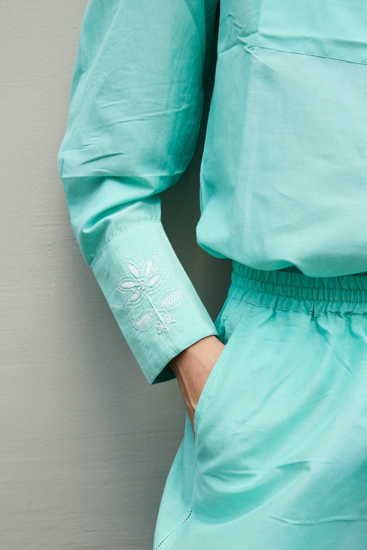 A long sleeved shirt in cotton silk. Features a front collar with button up concealed placket. White interlock embroidery on either side of the placket. Ruching detail on shoulders with long sleeves and wide cuffs. Cuffs features intricate Lotus embroidery with double buttons. Pearl button finish.