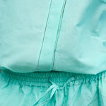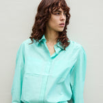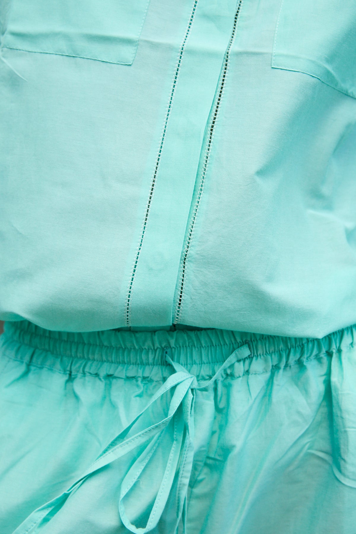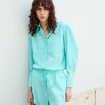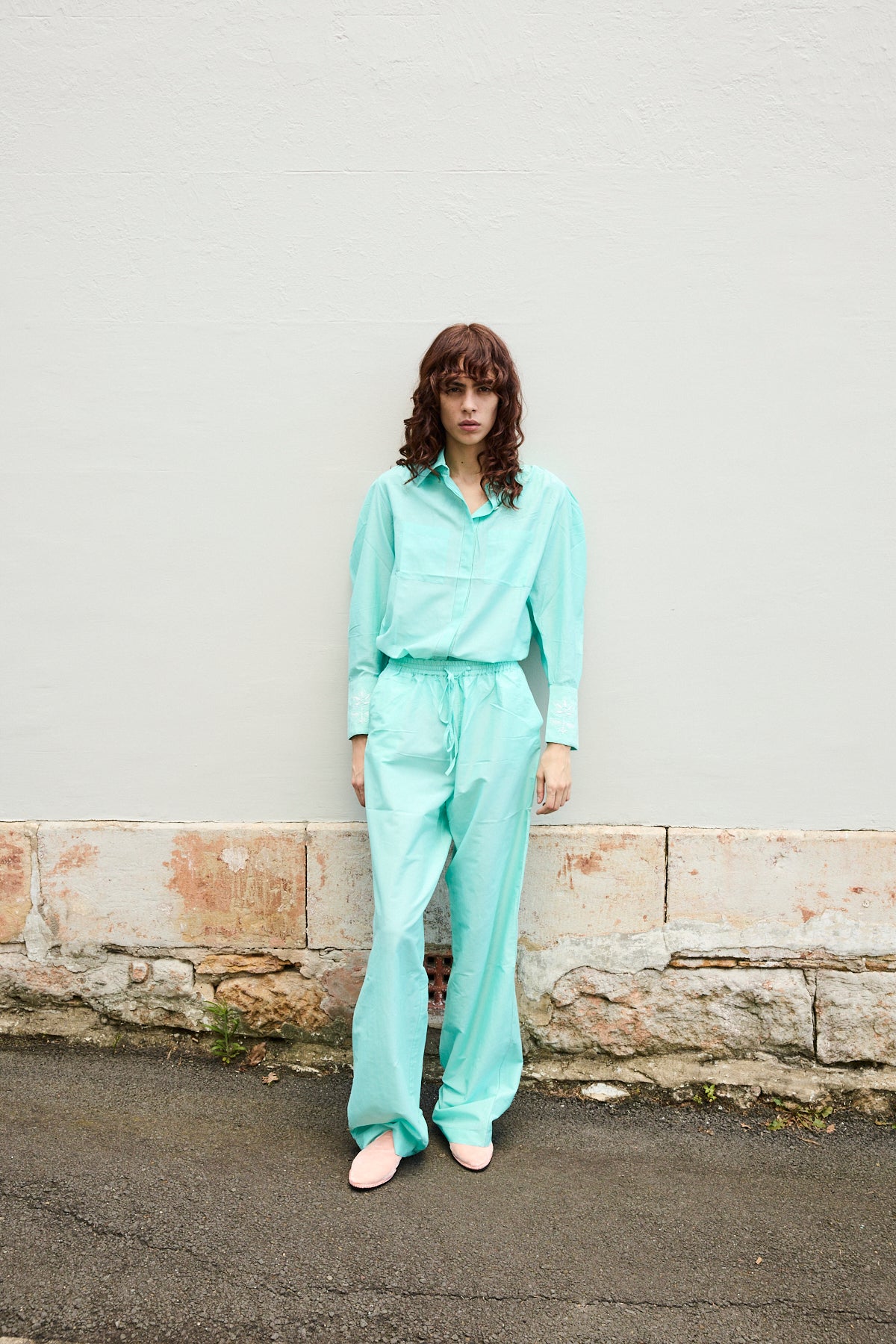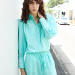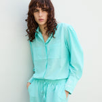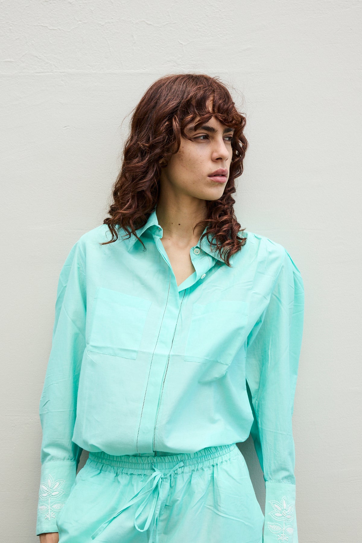 A long sleeved shirt in cotton silk. Features a front collar with button up concealed placket. White interlock embroidery on either side of the placket. Ruching detail on shoulders with long sleeves and wide cuffs. Cuffs features intricate Lotus embroidery with double buttons. Pearl button finish.