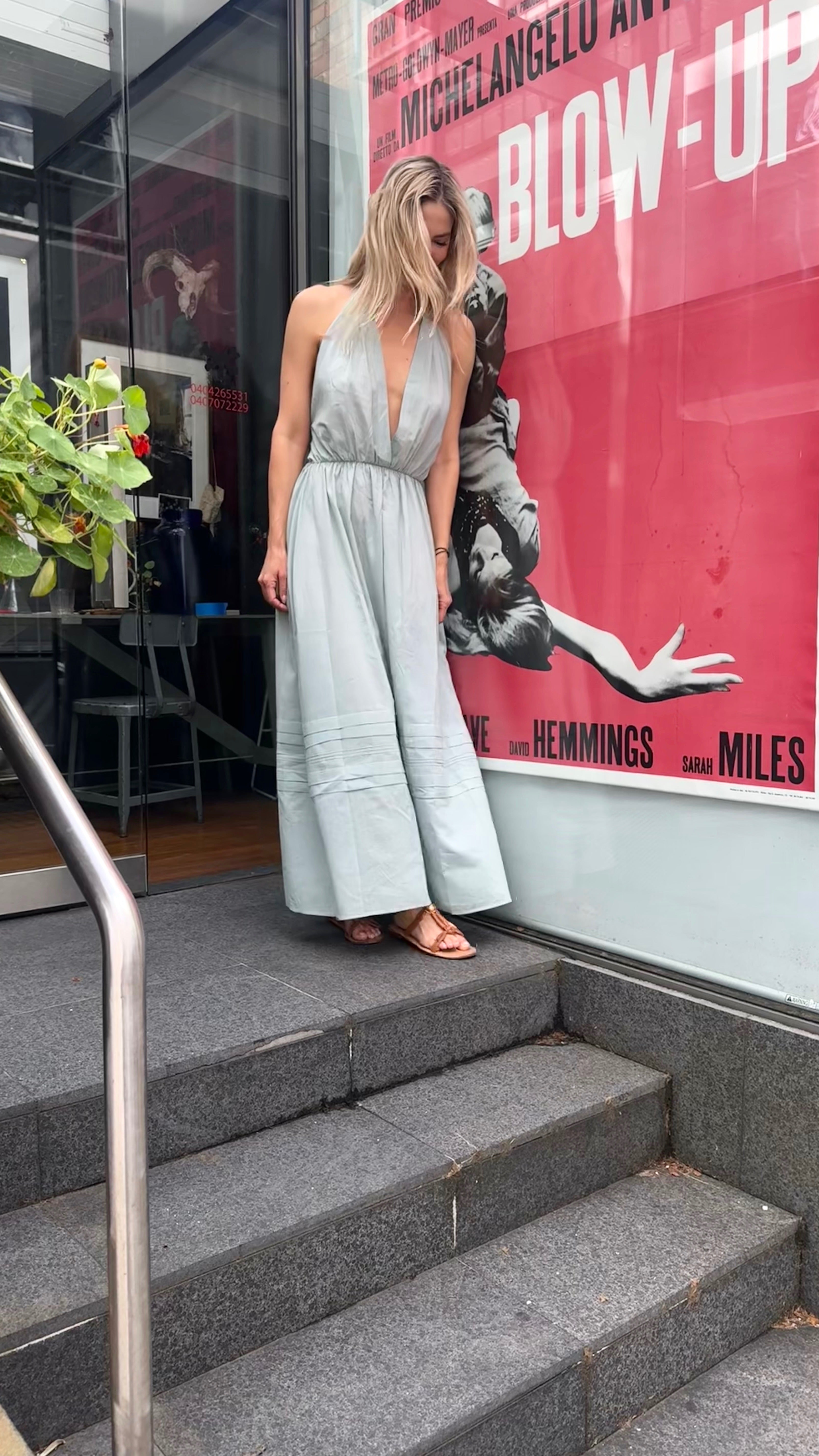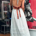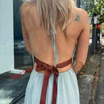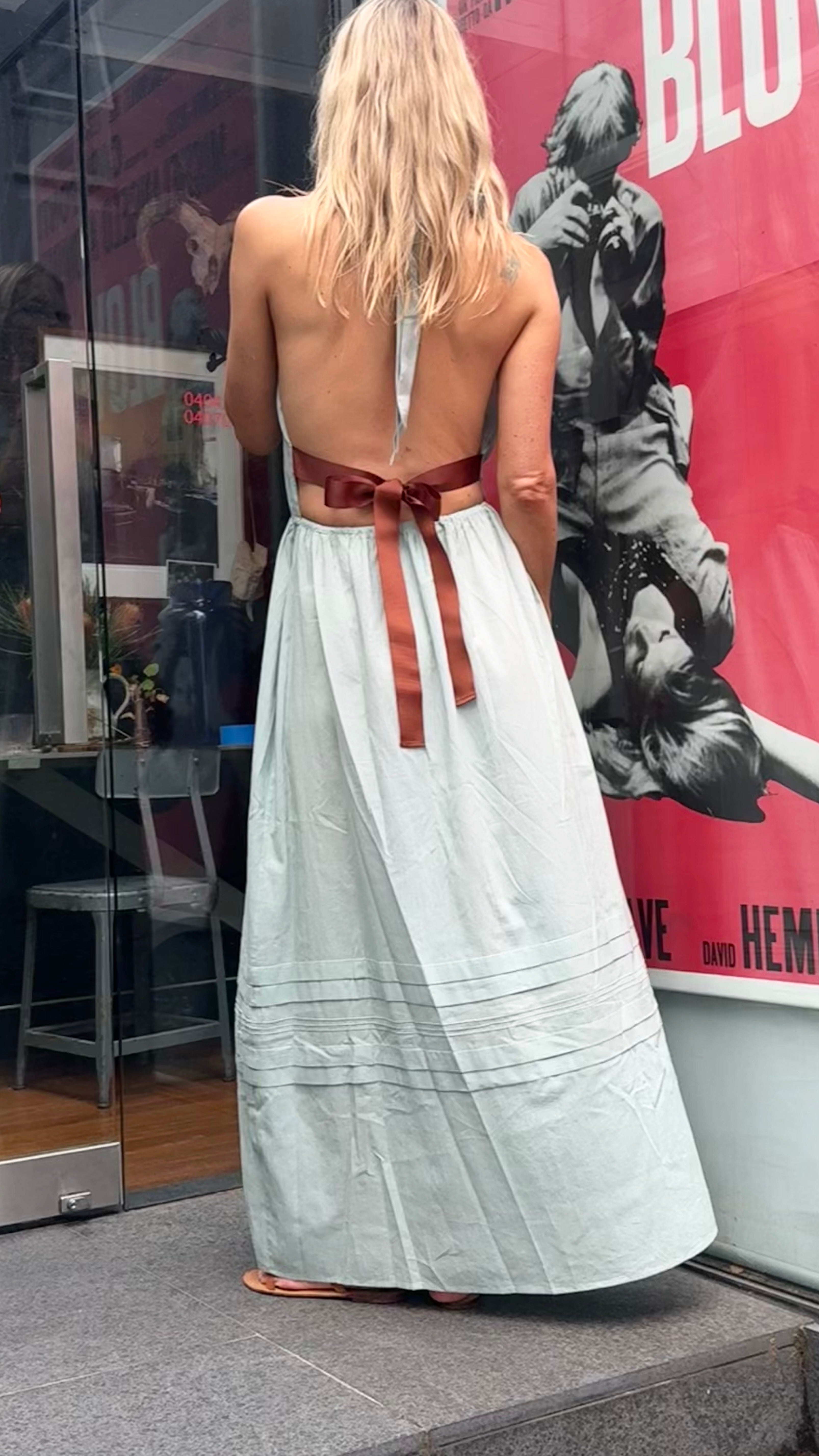 A halter neck open-back dress featuring a double bow detail in voile and grosgrain ribbon. Elastic waist with adjustable front V neck. Hand pleat and pintuck detail above hemline. Maxi length. A soft and lightweight finish.