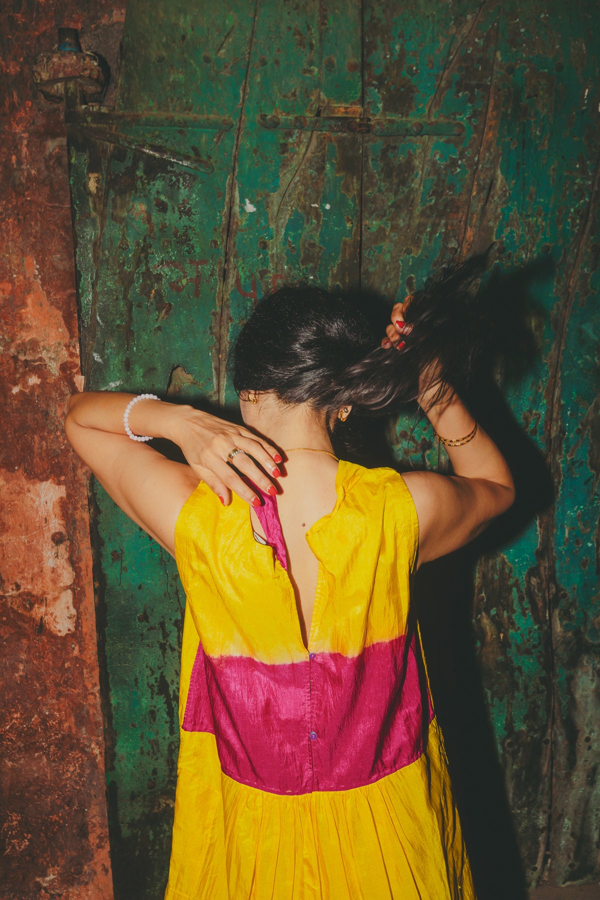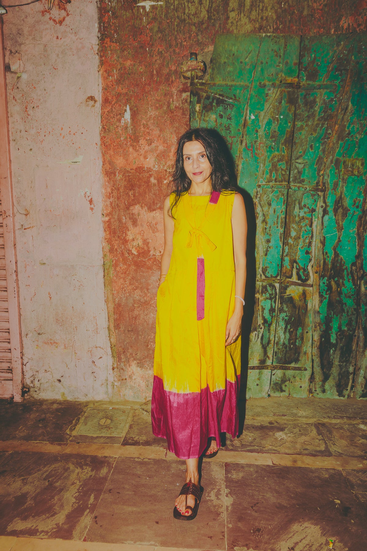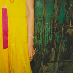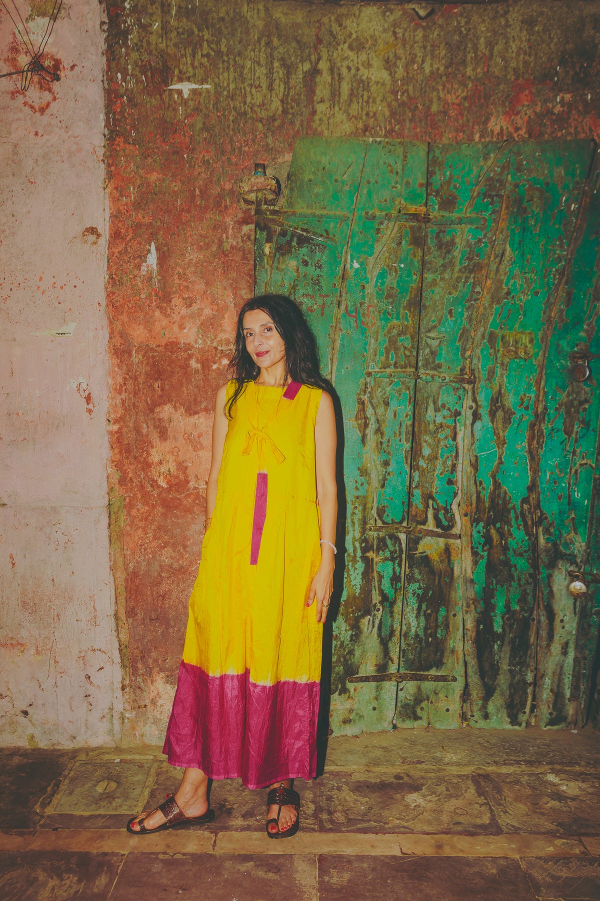 A delicately handwoven 100% silk sleeveless dress. Features a drop waist seam with pleat detail. Contrast fuchsia ombre tie&dye along back and hemline. A high round neck, slightly A line style. Back ties with double button detail. Side slit pockets. Midlength.