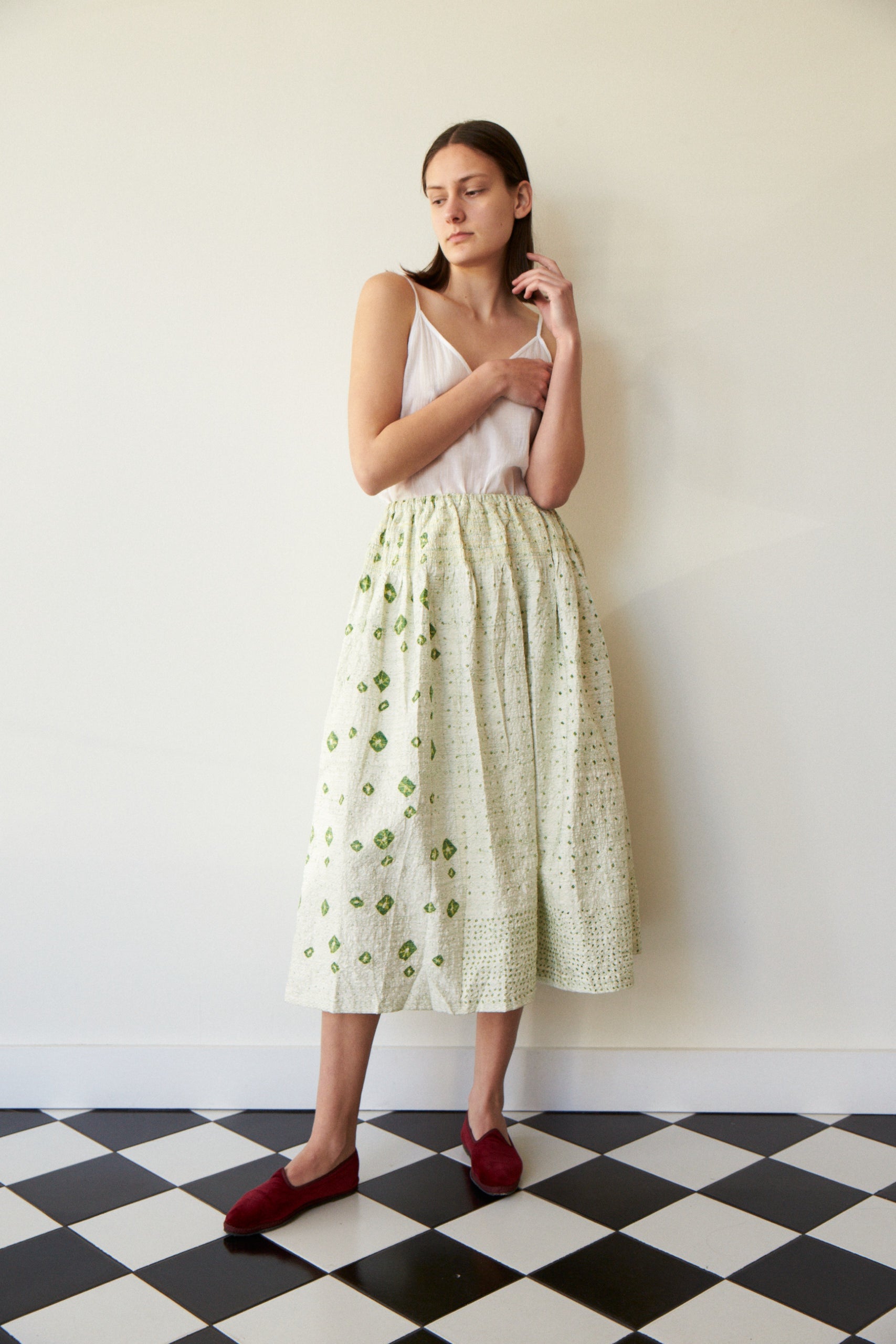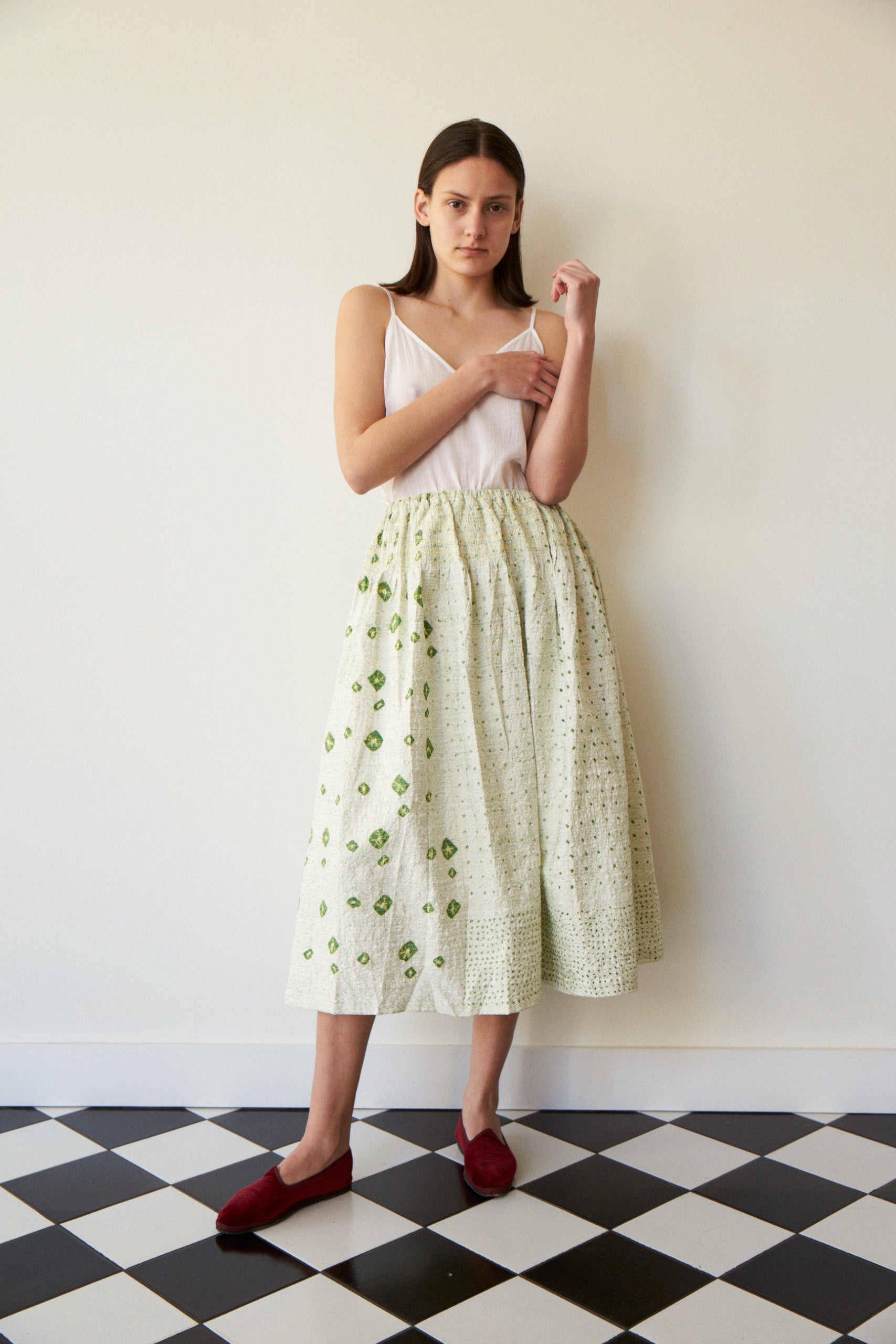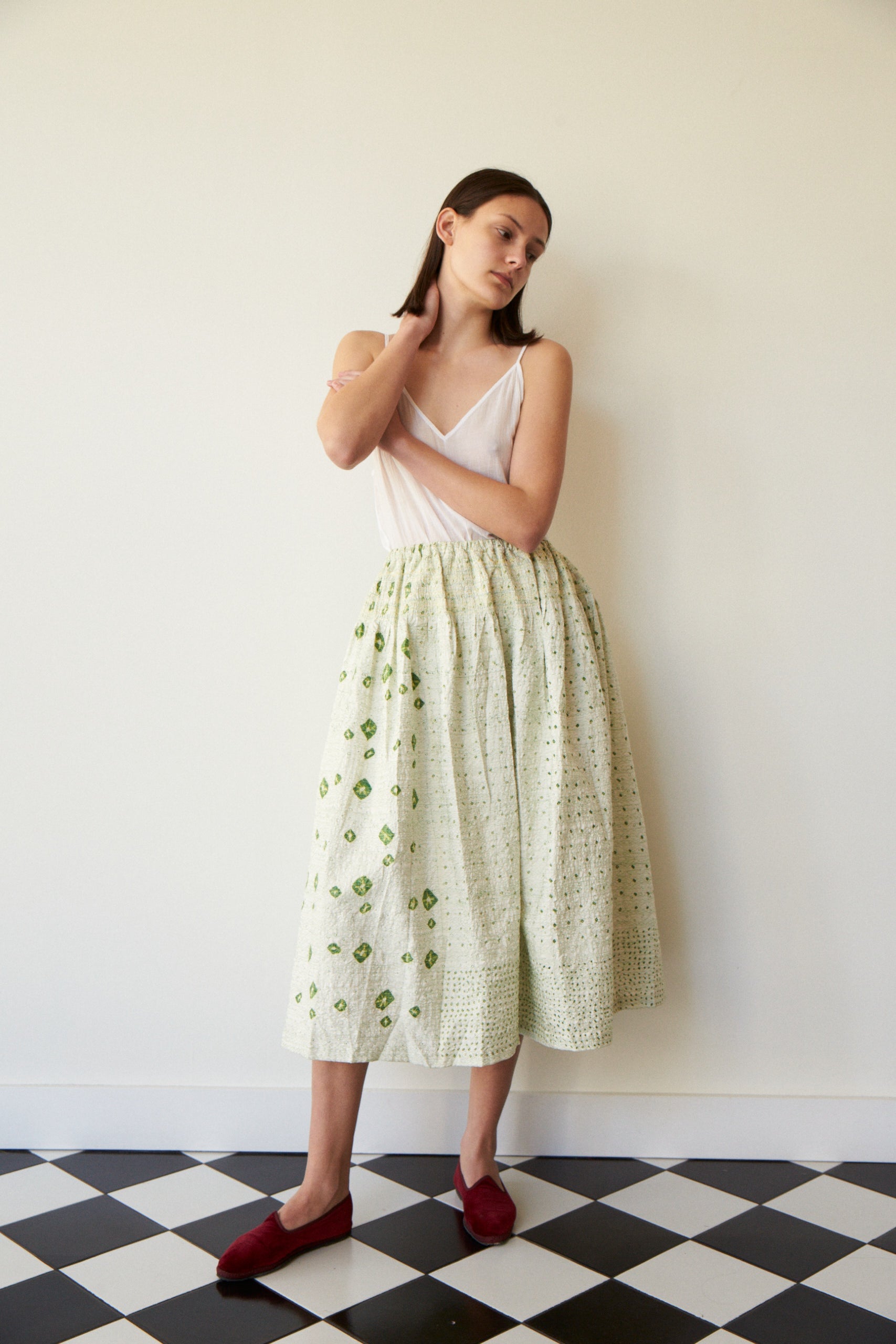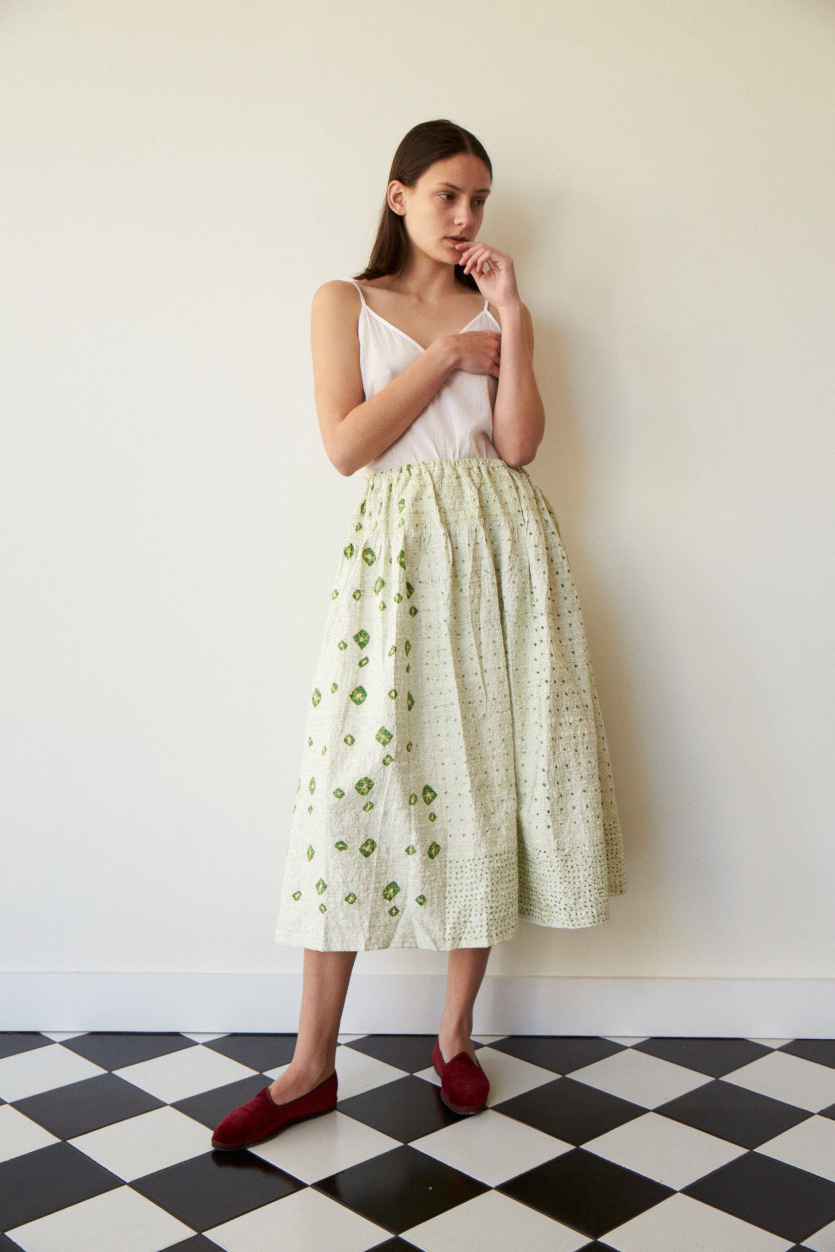 A mid length skirt delicately handwoven in 50% Cotton & 50% Silk. Elasticised waistband with ruching. Embroidery and hand tie & dye detail with green and yellow stitching throughout the entire piece.  Fully lined in 100% cotton. Pintuck border detail along hemline. A-line style.