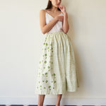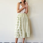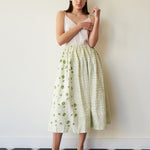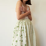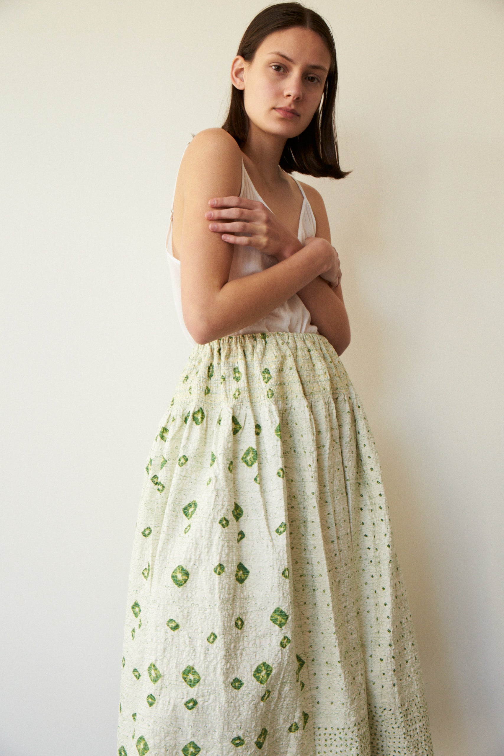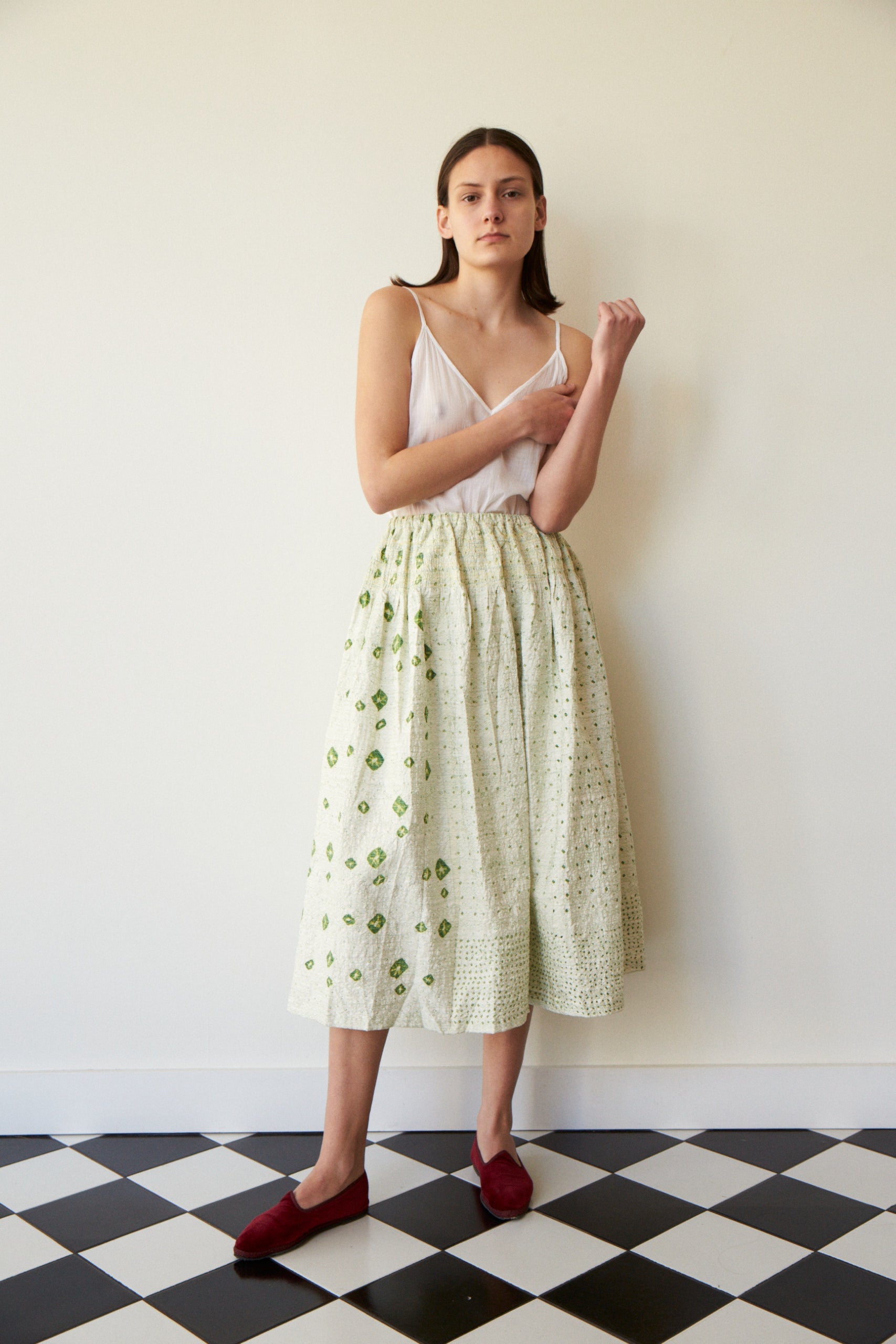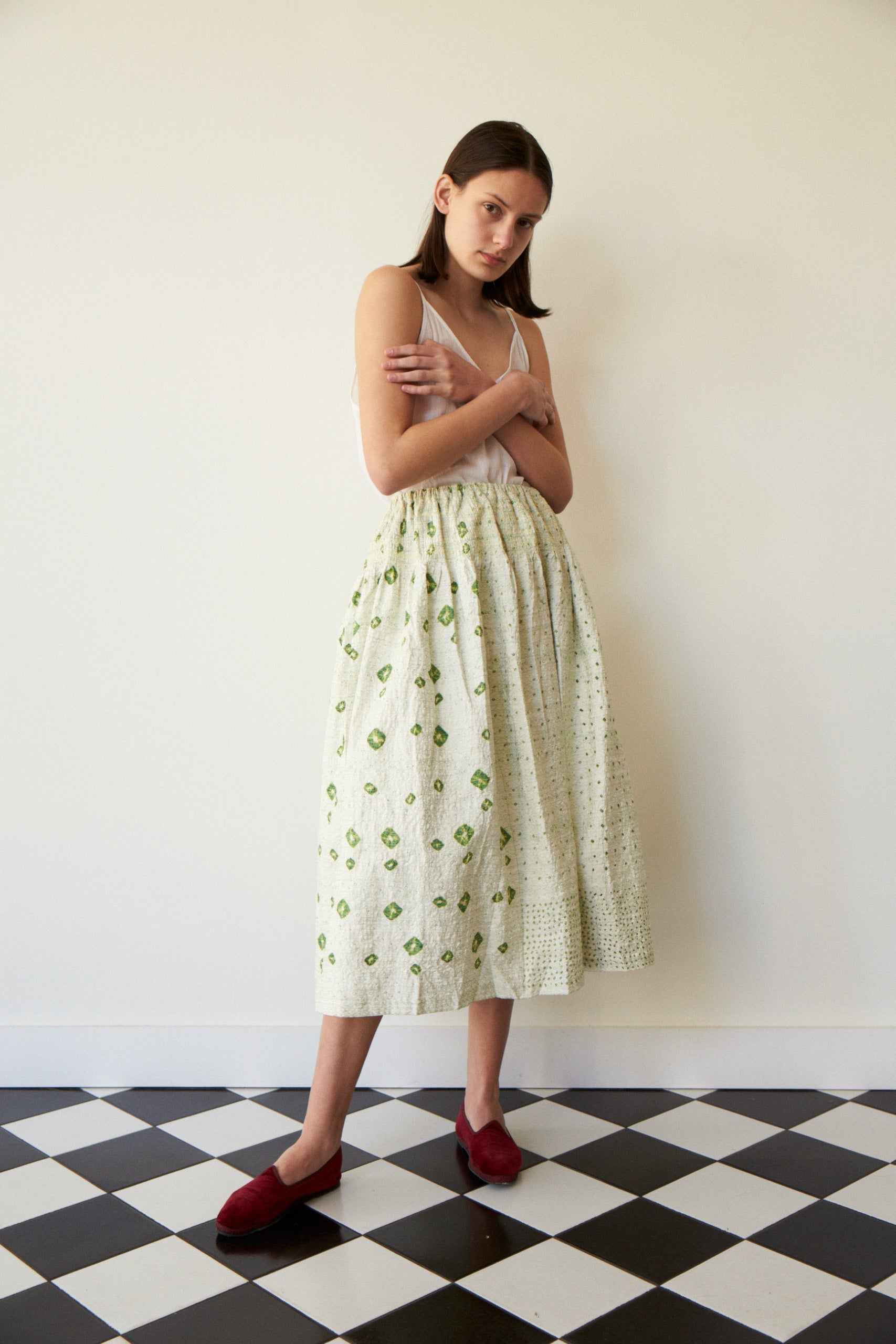 A mid length skirt delicately handwoven in 50% Cotton & 50% Silk. Elasticised waistband with ruching. Embroidery and hand tie & dye detail with green and yellow stitching throughout the entire piece.  Fully lined in 100% cotton. Pintuck border detail along hemline. A-line style.
