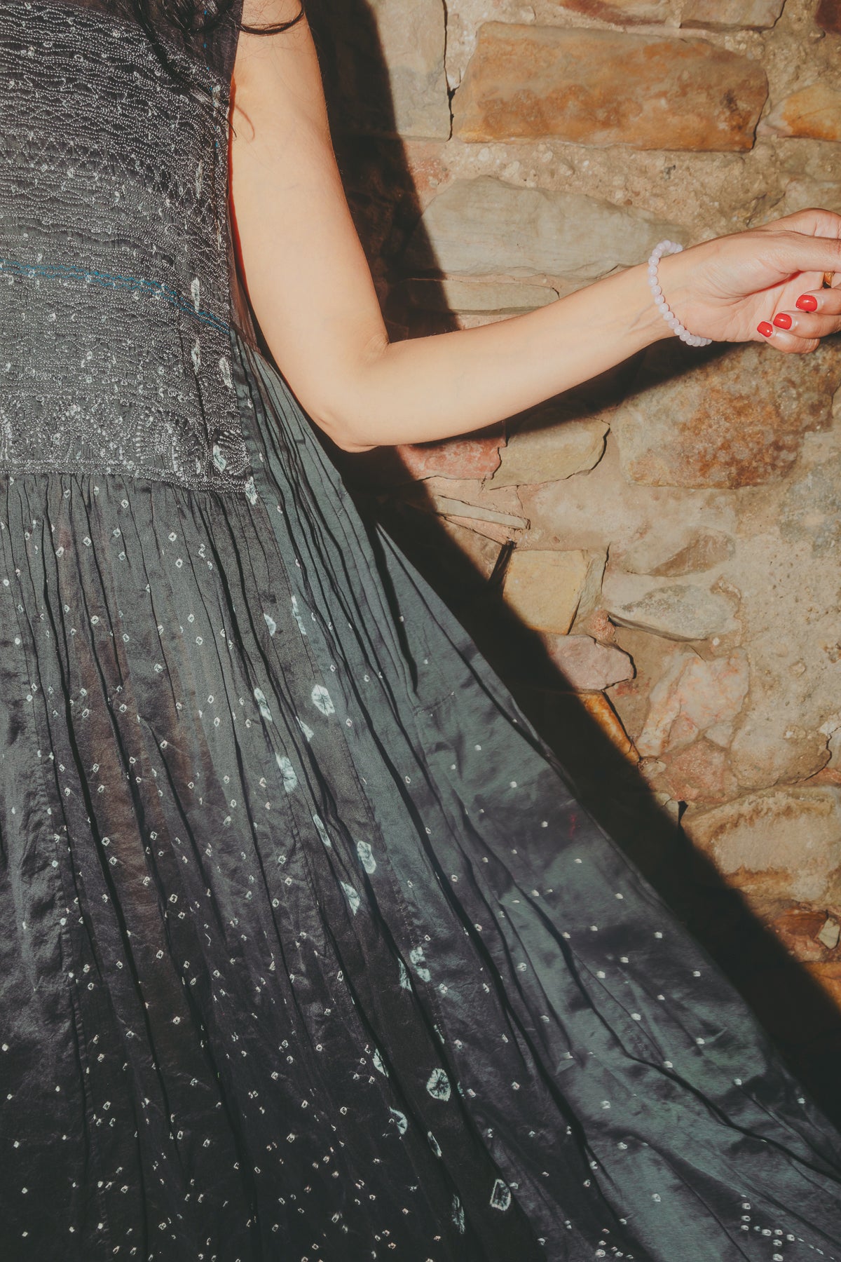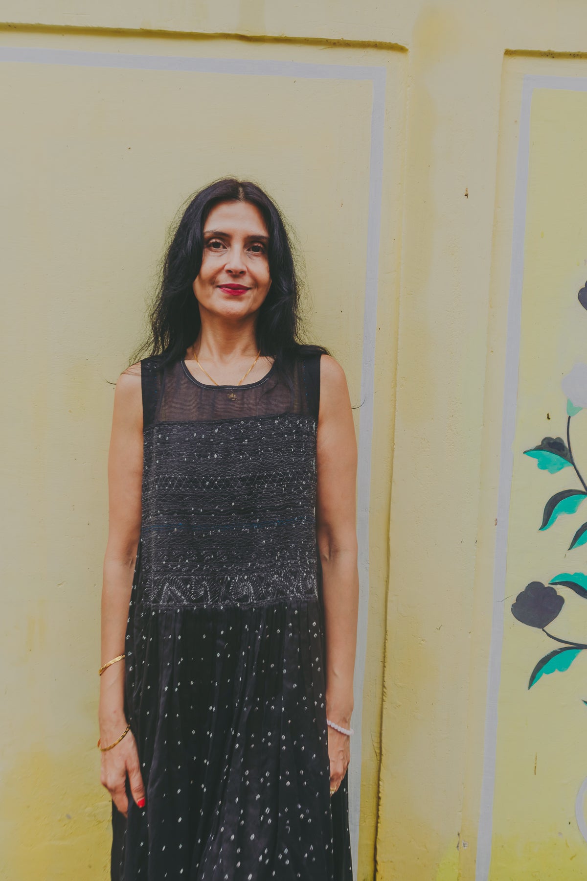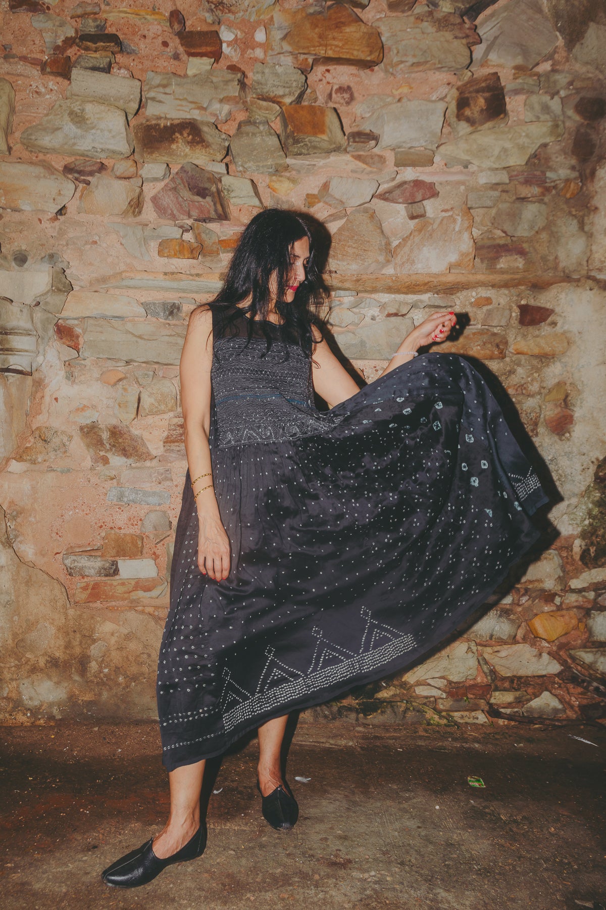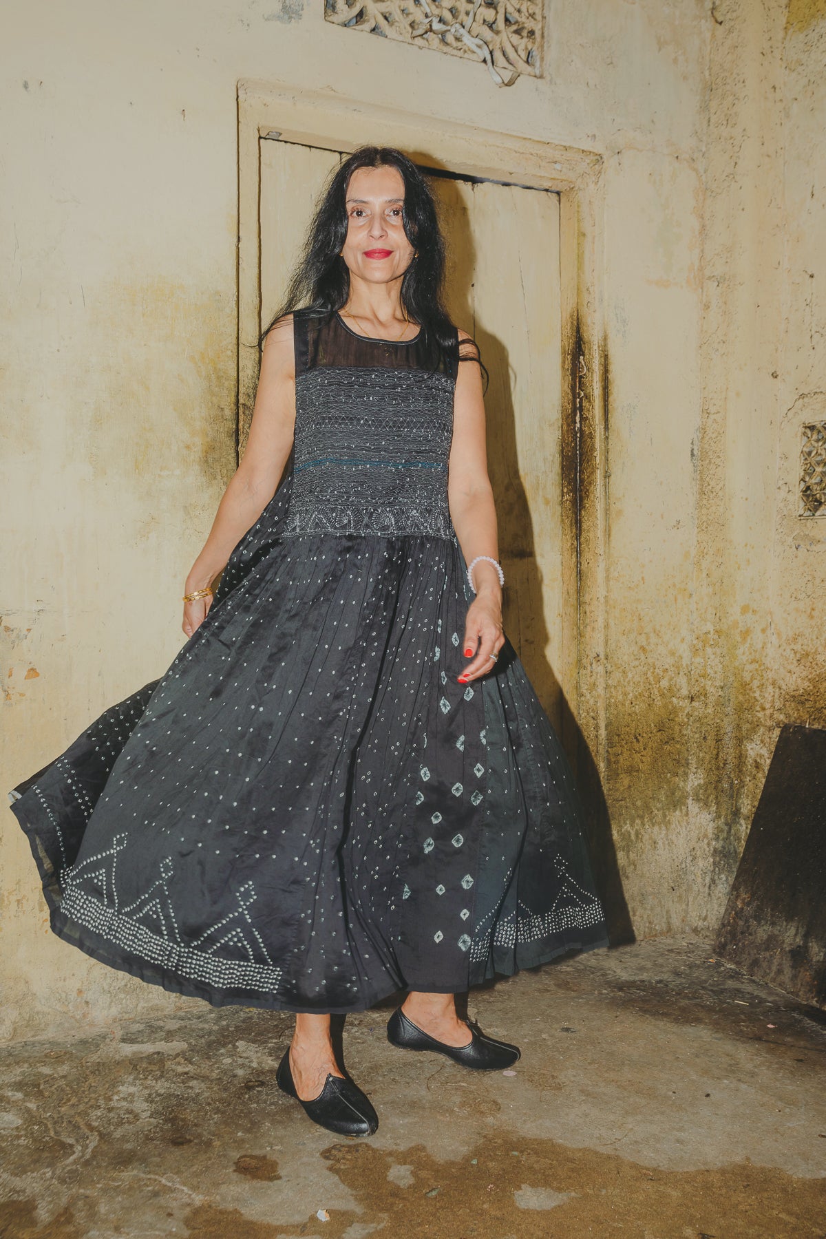 A sleeveless dress handwoven in 100% cotton silk. High round neck with intricate contrast white and blue embroidery and smocking detail all along the front and back yoke. Pleats below the waistline. Dress is exquisitely pieces together with multiple tie & dye bandhini patterned panels. Side pockets.