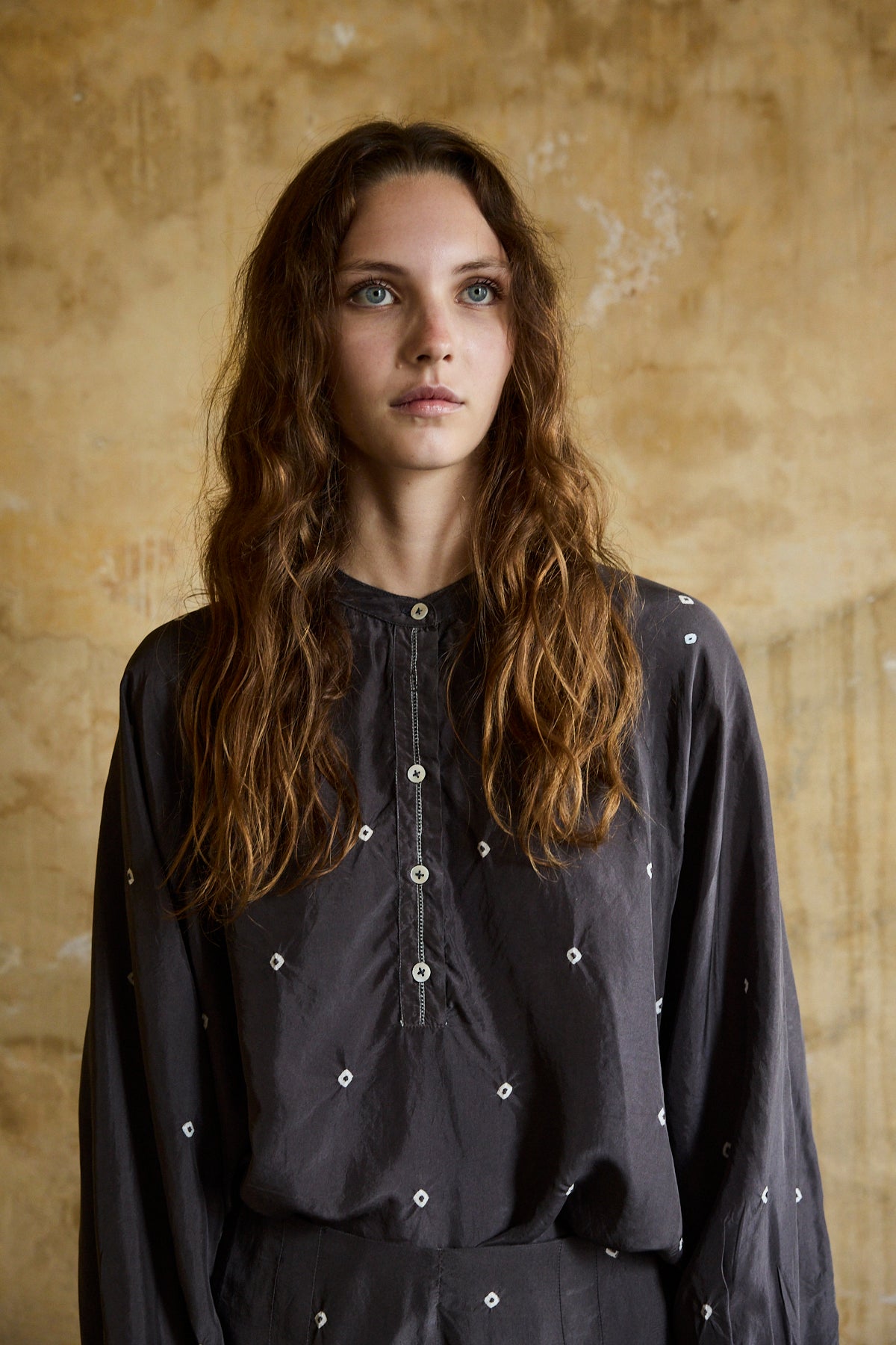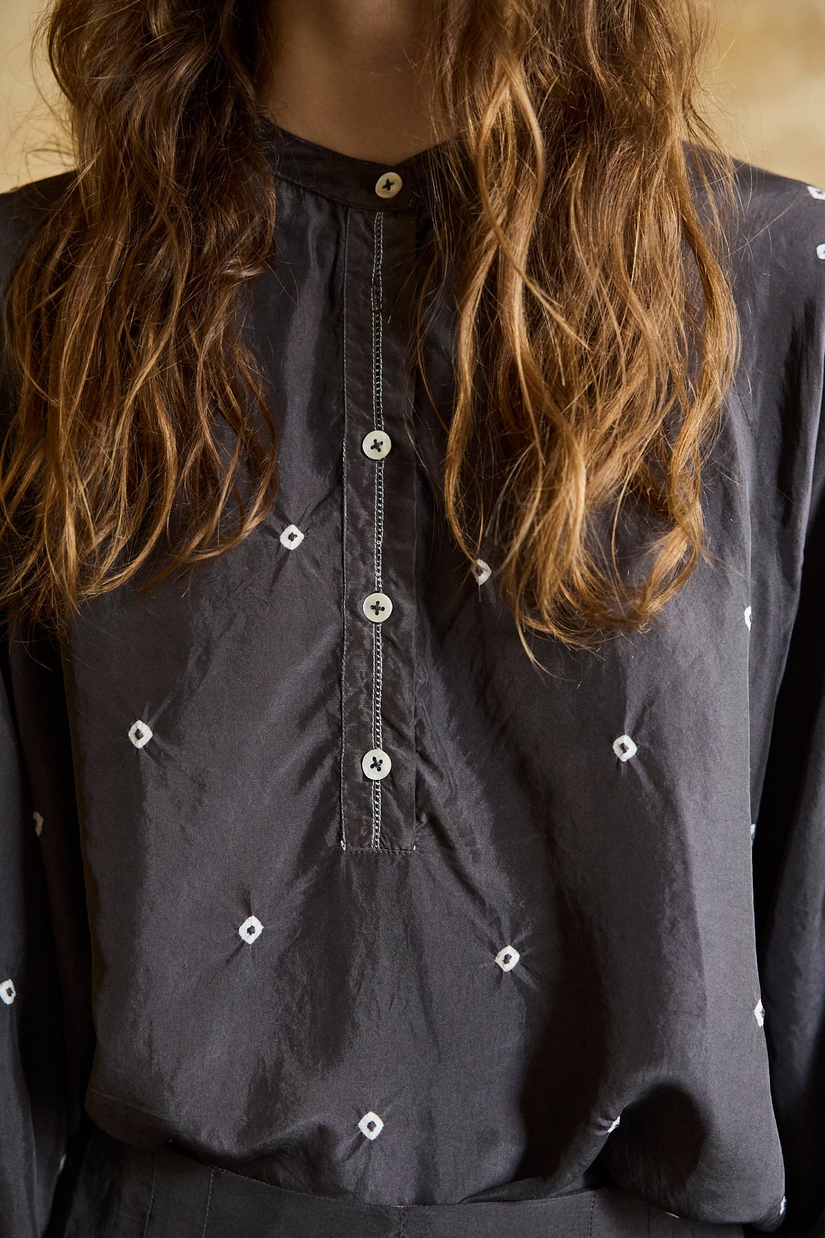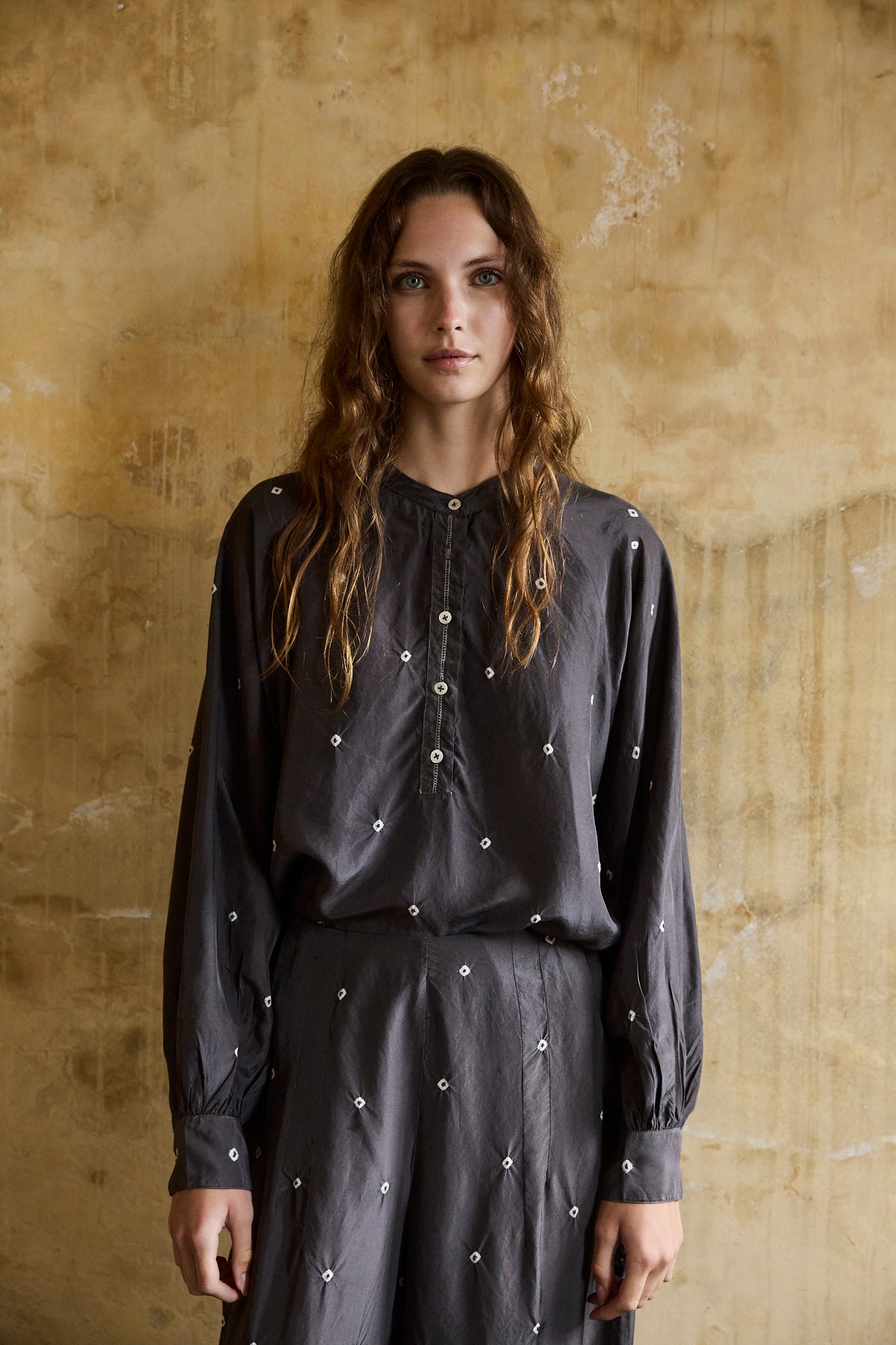 MIDNIGHT BLOUSE, CHARCOAL/IVORY BANDHINI TIE&DYE SILK