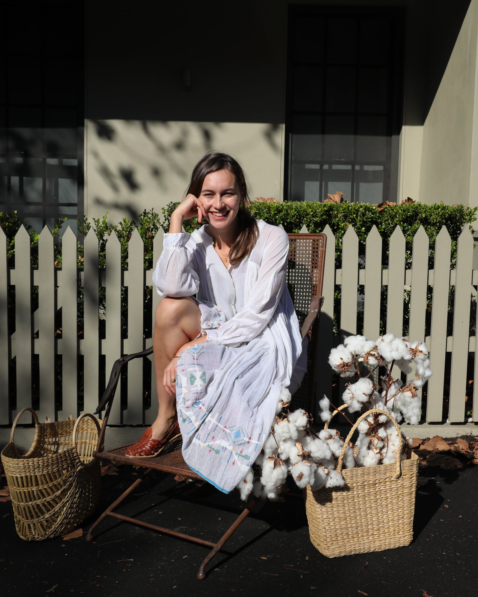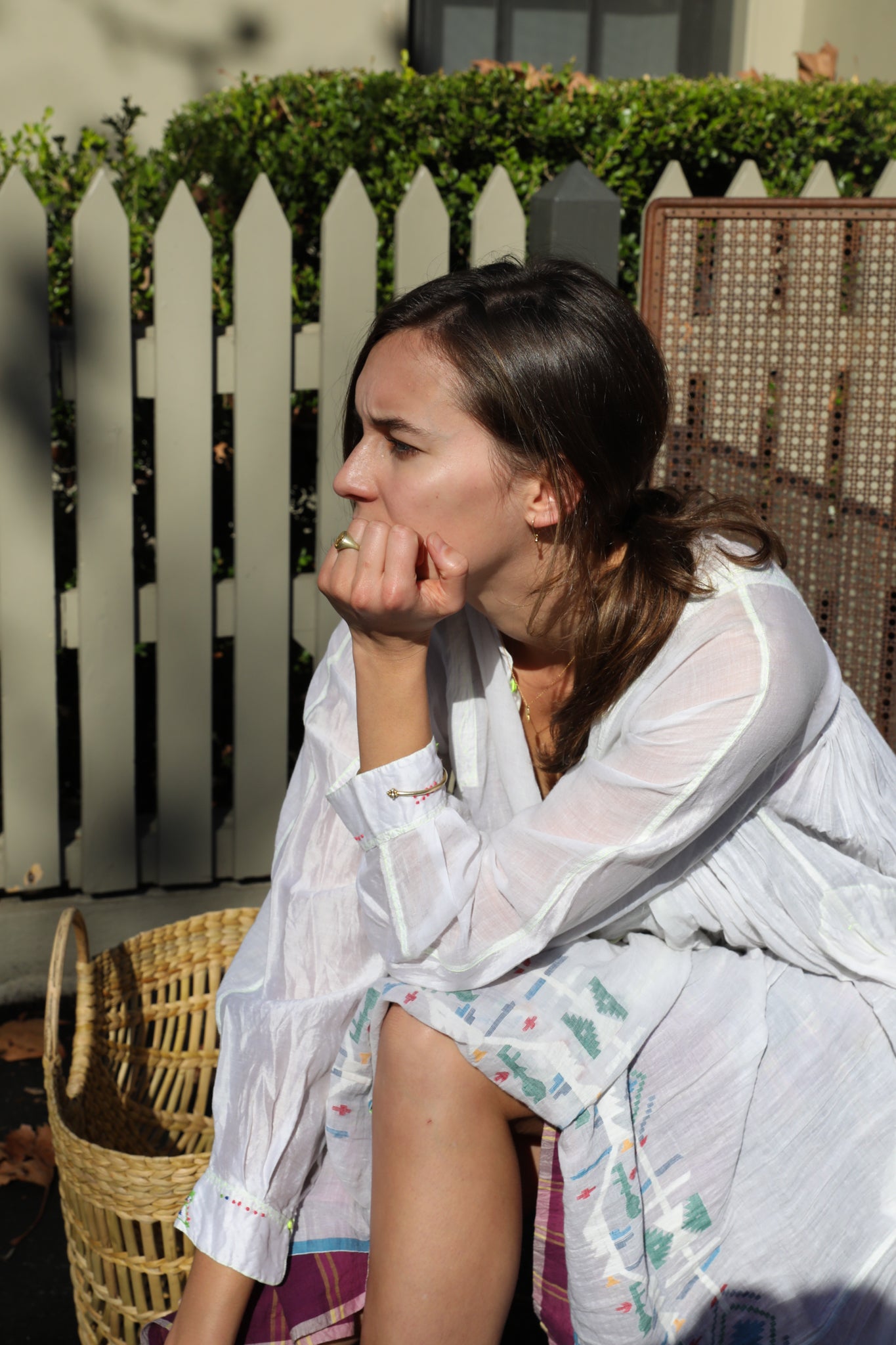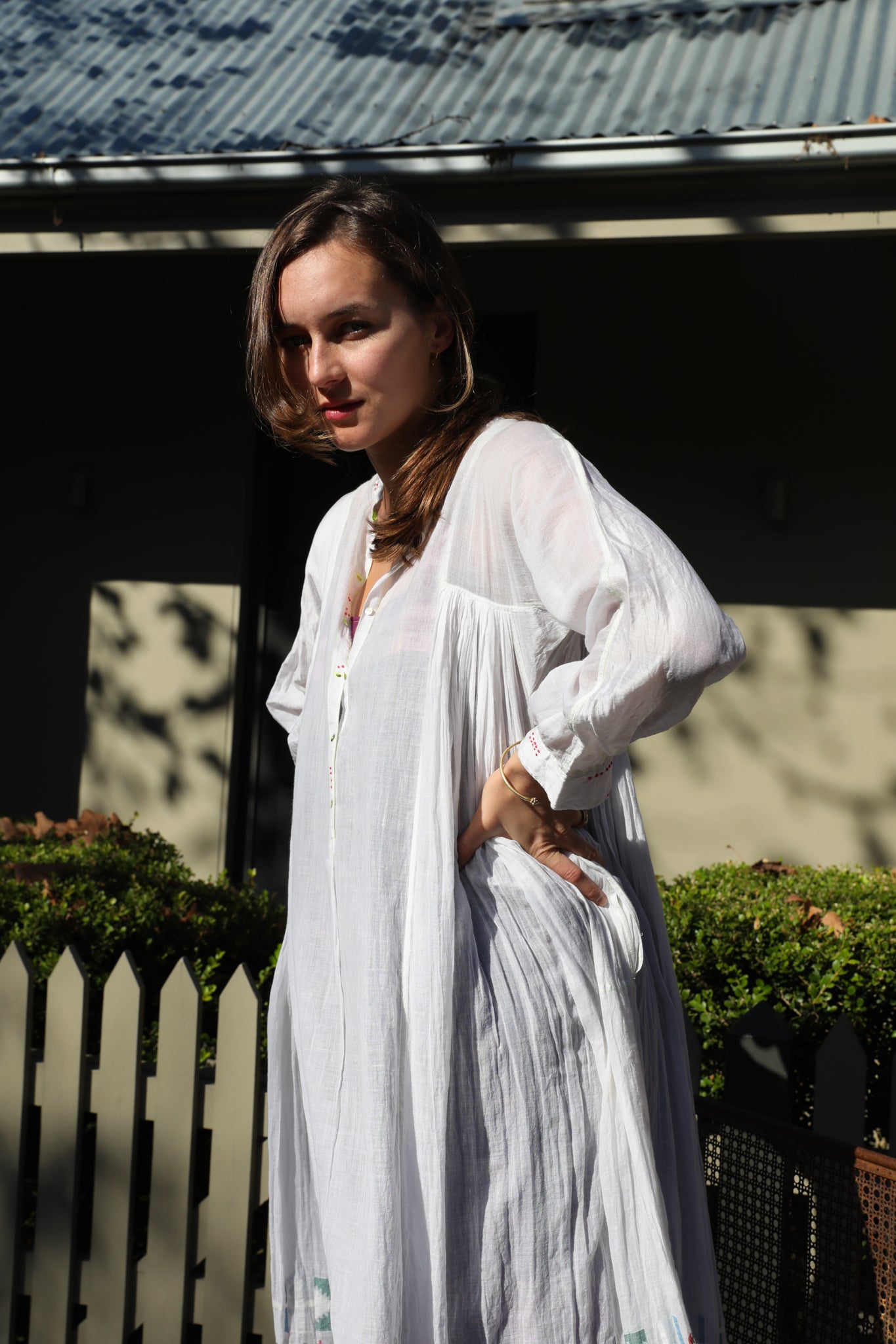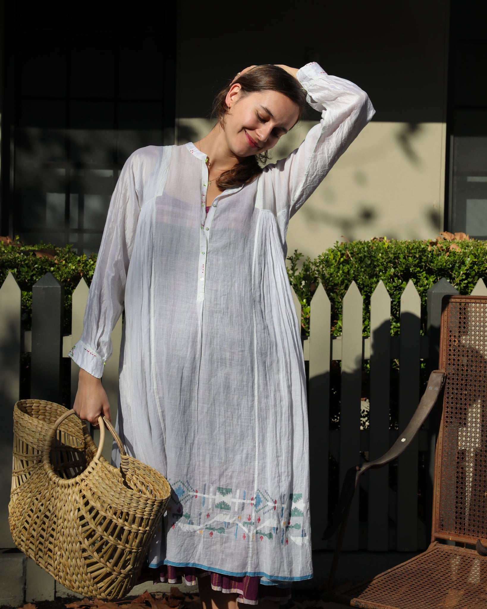 A delicate handwoven muslin cotton dress with a green/blue Jamdani embroidery bordering the base of the dress. The dress is midlength (to middle of shins) with hints of hand embroidered stitching lining the cuffs, collar and button up front. Side pleat detail.