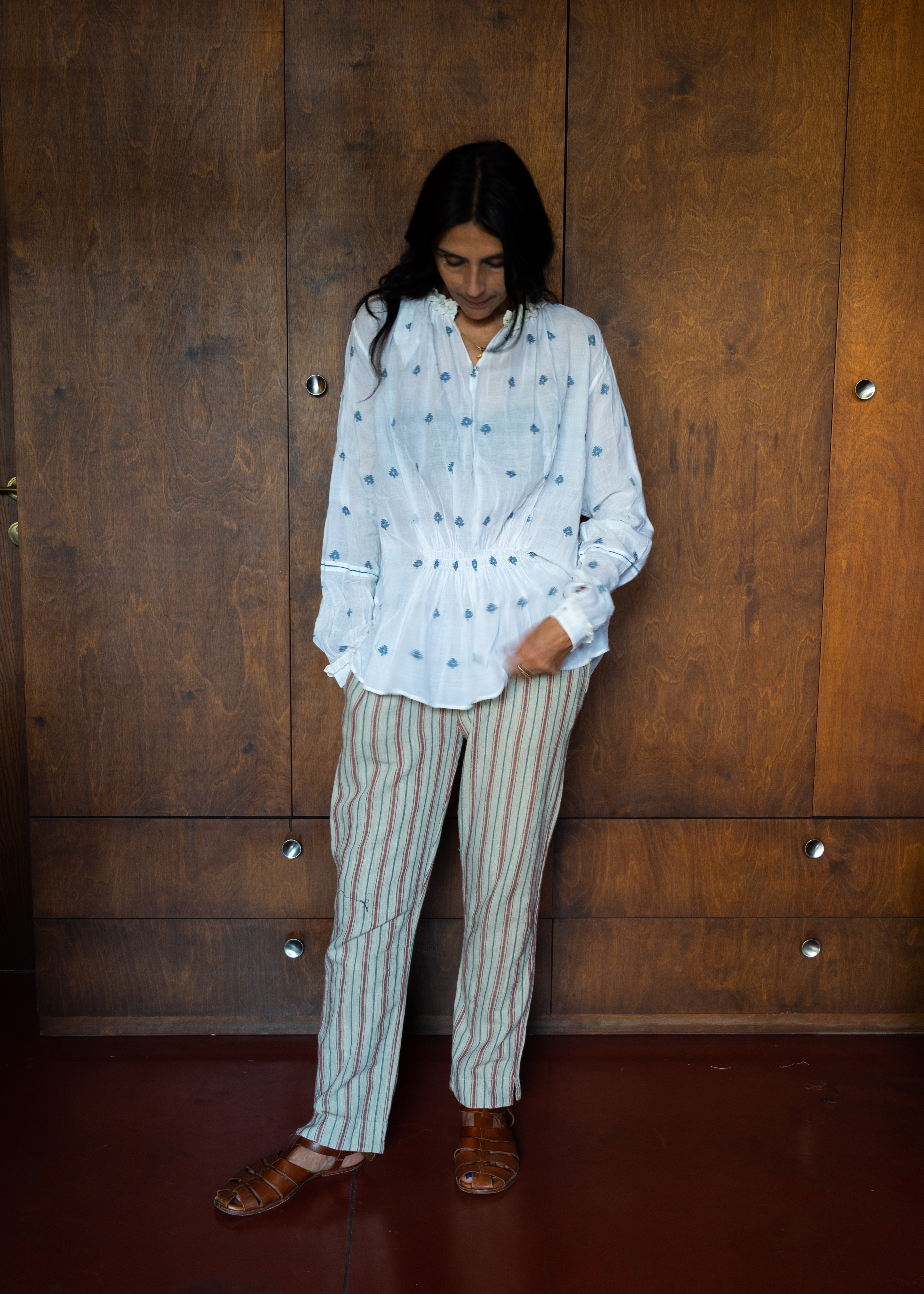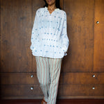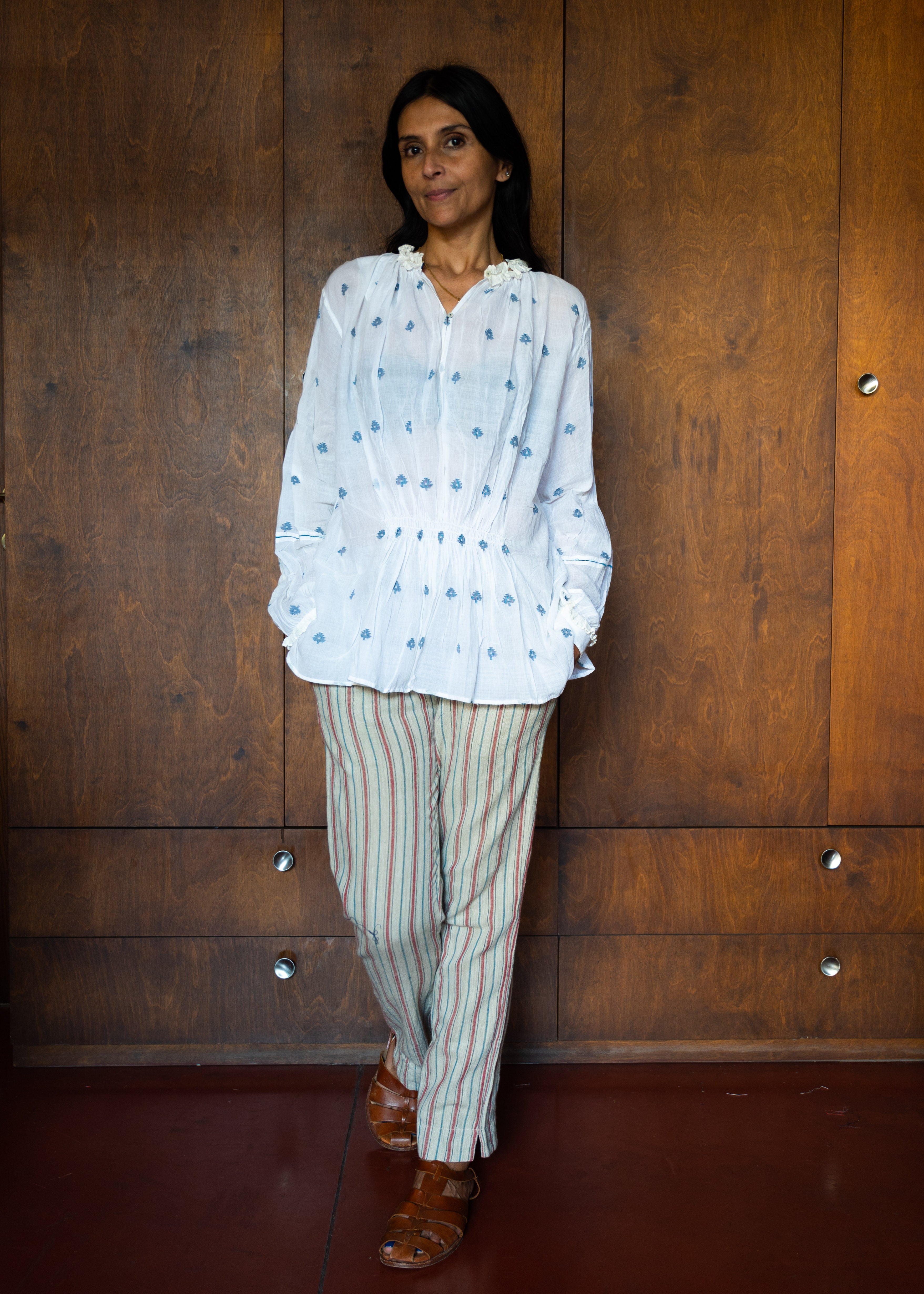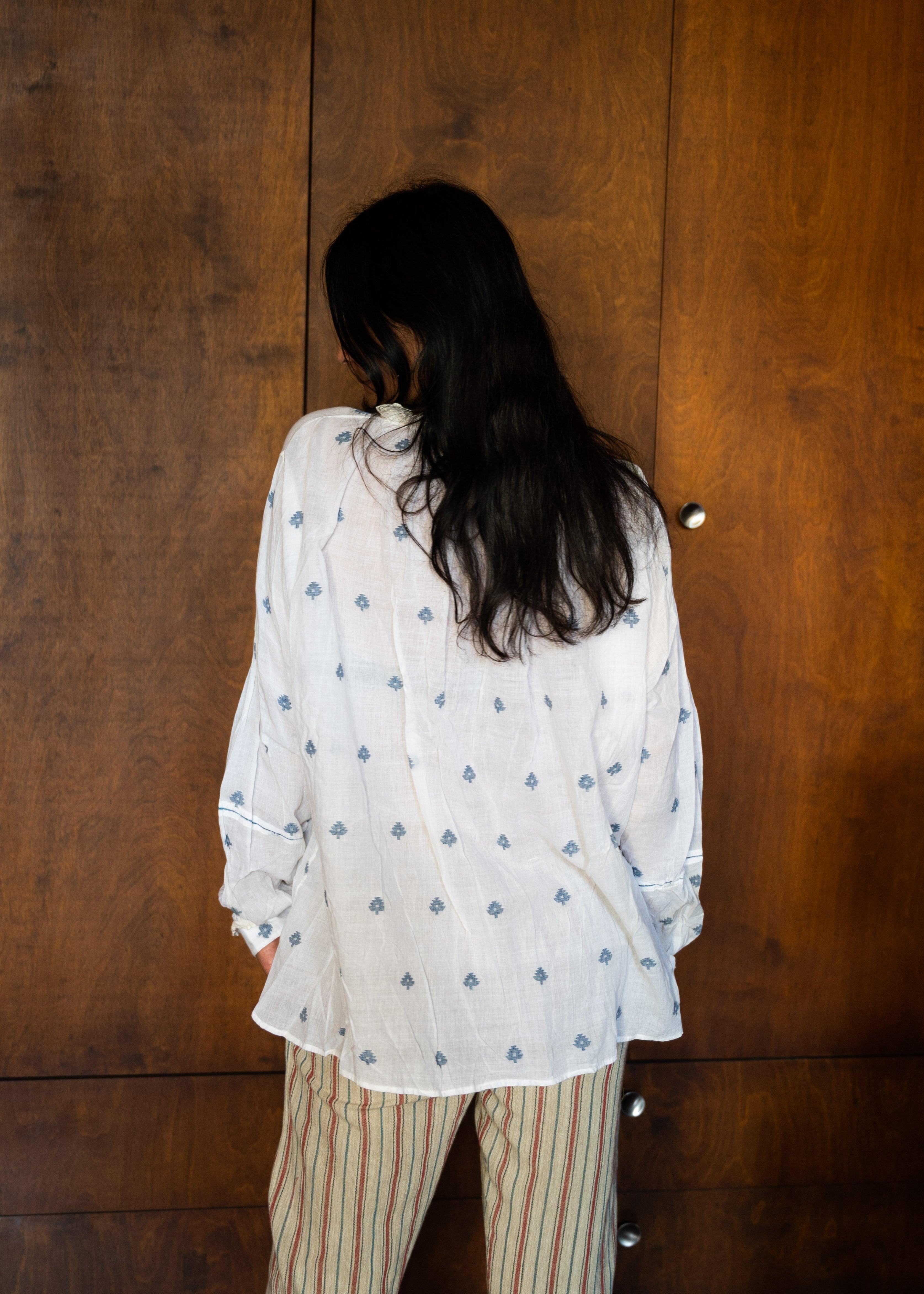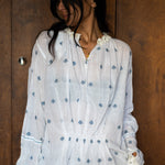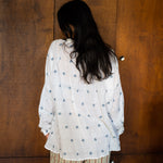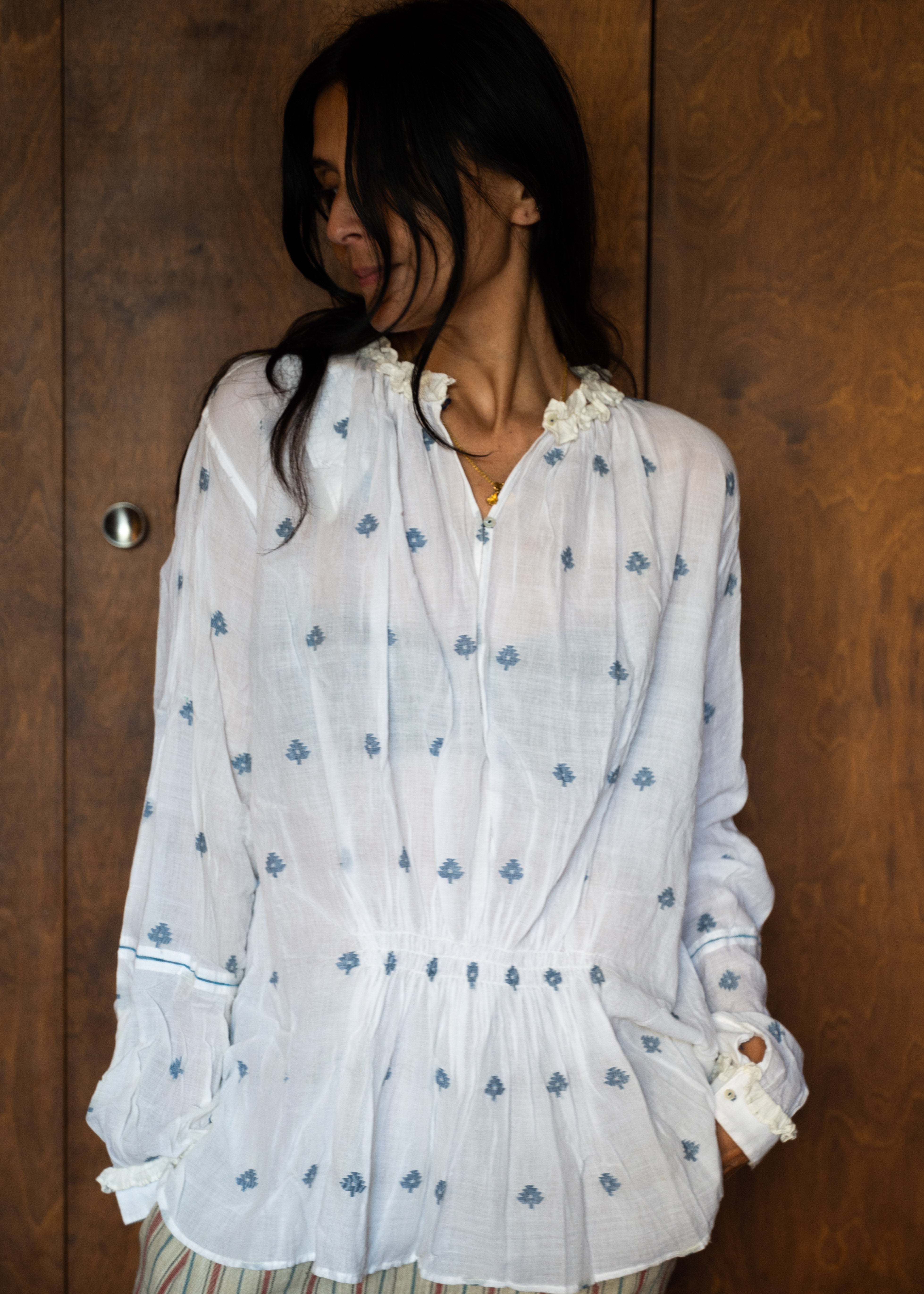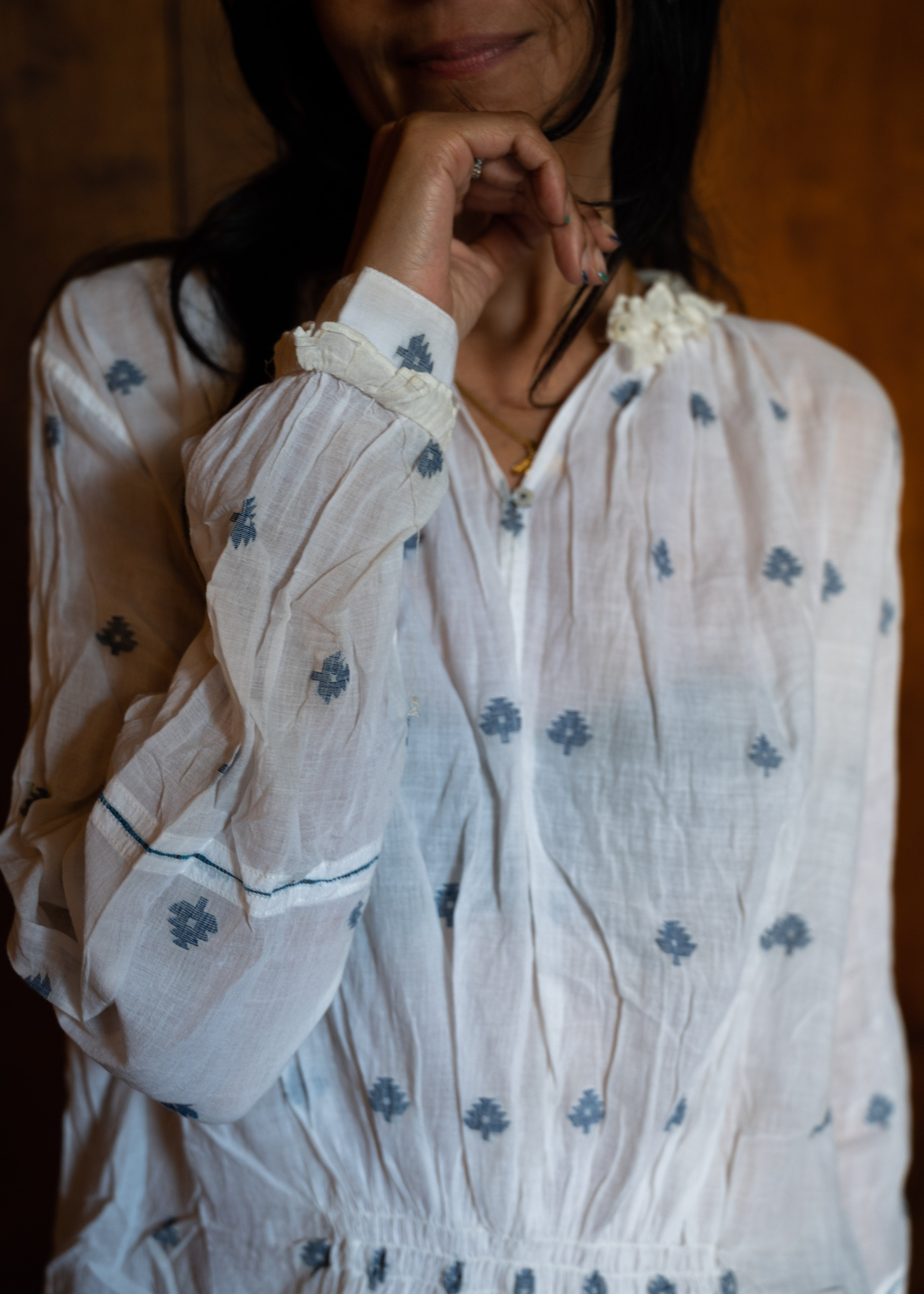 A handloom cotton long-sleeved shirt. Features a frill collared neck with front V and double pearl button closure. Jamdani geometric woven patterns in contrast blue through the garment. Front elasticised ruching detail. Cuff with frill and single button closure. Interlock blue embroidery on sleeves. A sheer, soft and light finish.