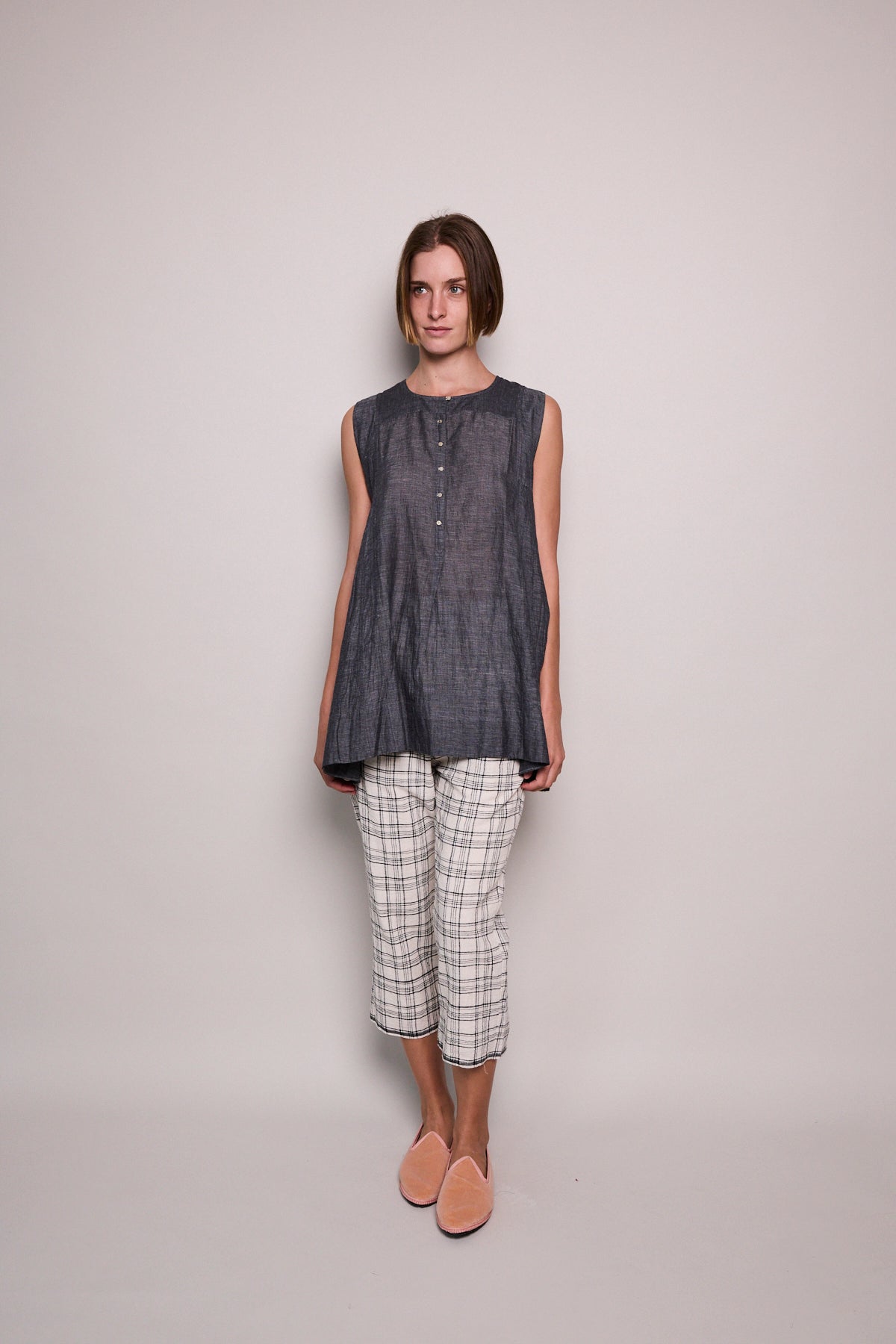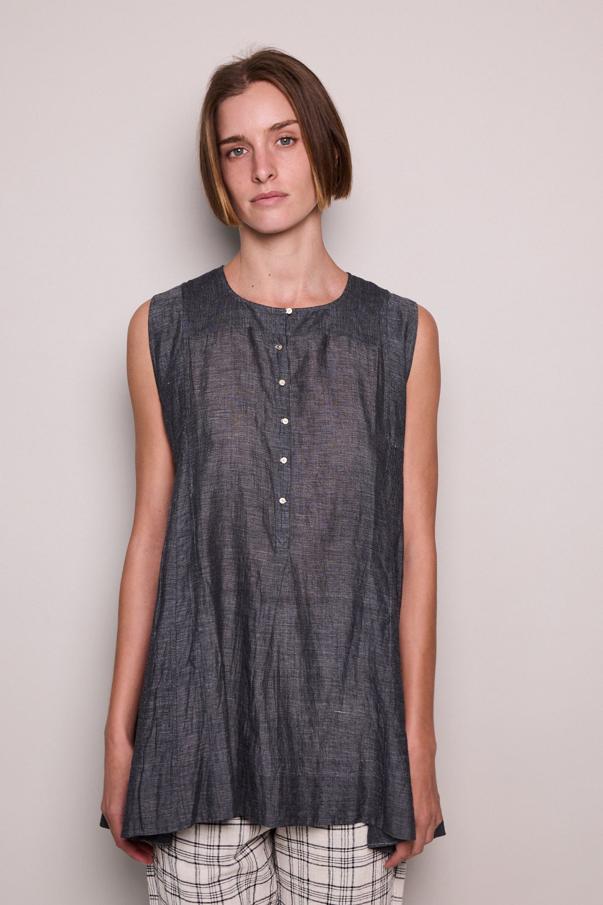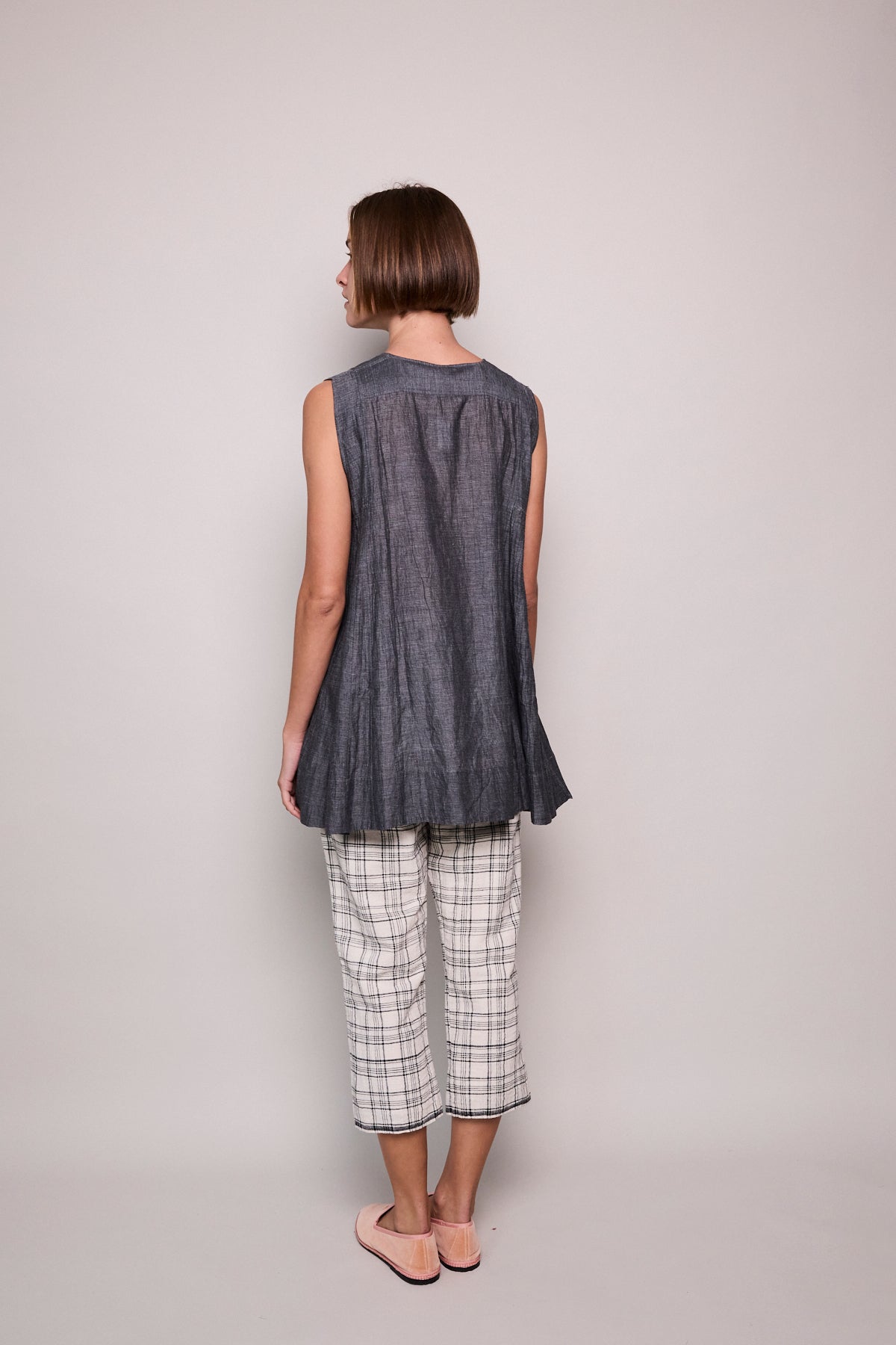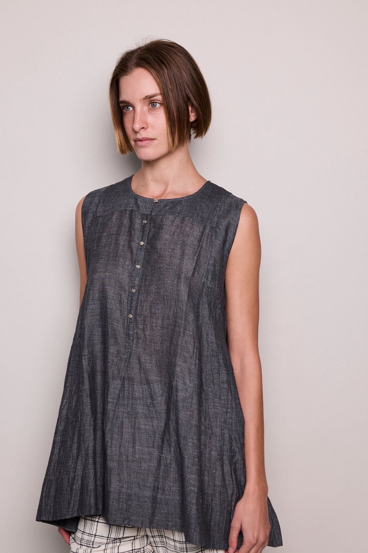 A sleeveless A-line blouse. A high round neck with button up front. Silver metal buttons with contrast white hand stitched button holes. Features pleated sides made from multiple panels pieced together. Box pleat on front.