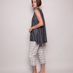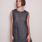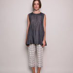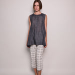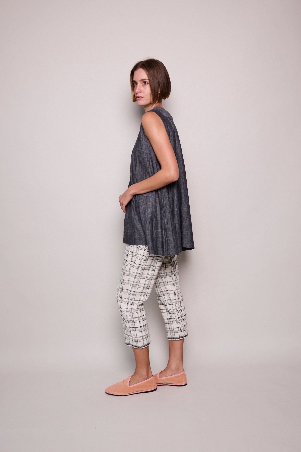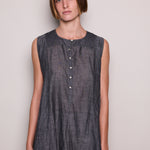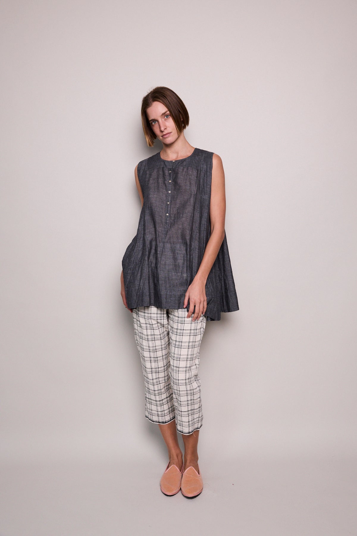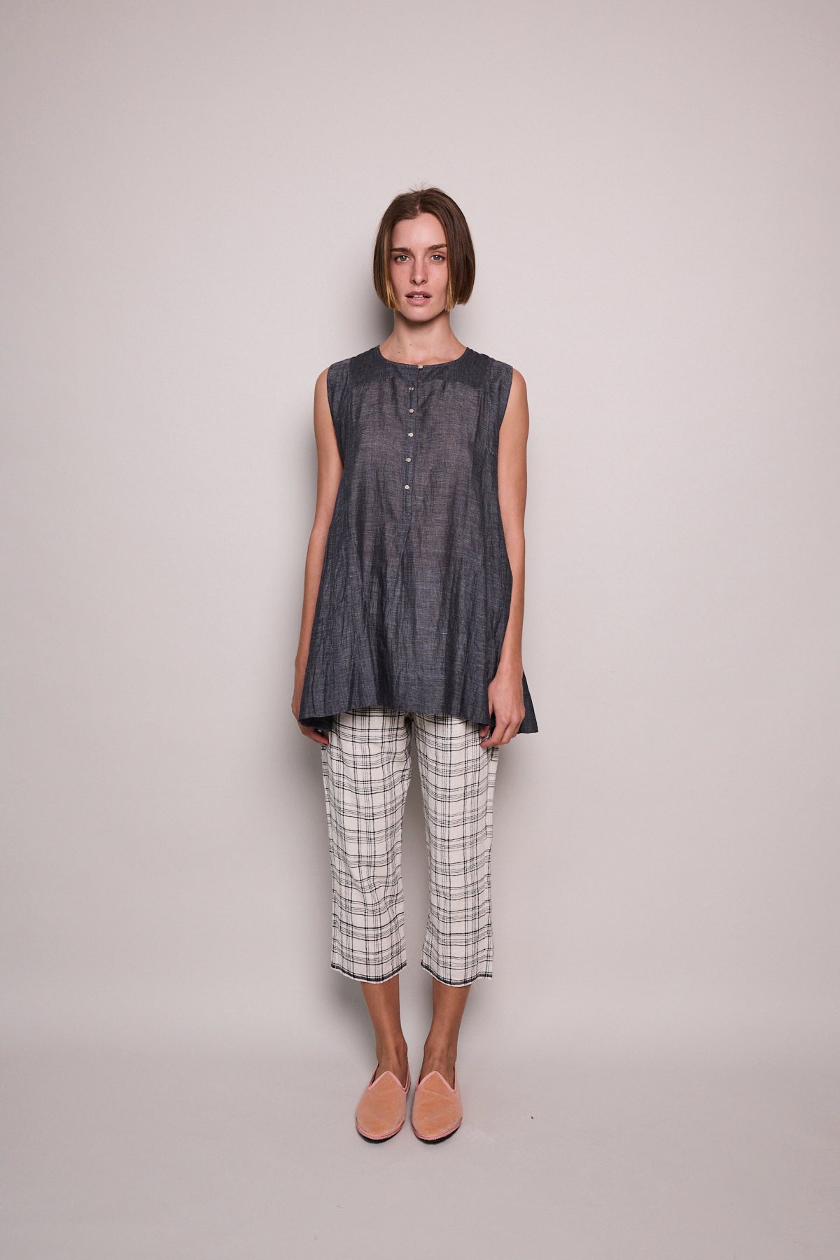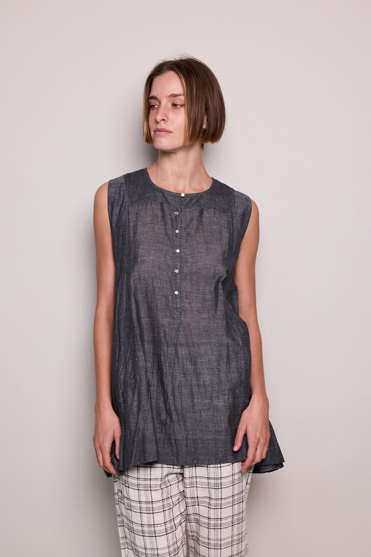 A sleeveless A-line blouse. A high round neck with button up front. Silver metal buttons with contrast white hand stitched button holes. Features pleated sides made from multiple panels pieced together. Box pleat on front.