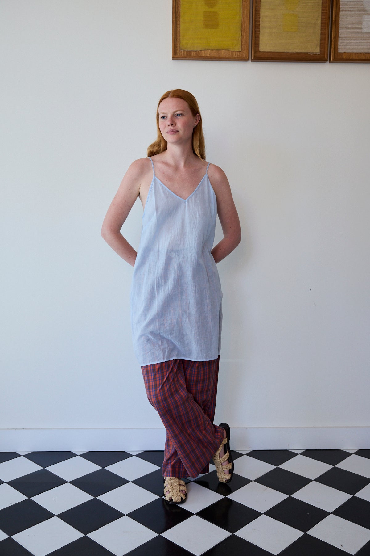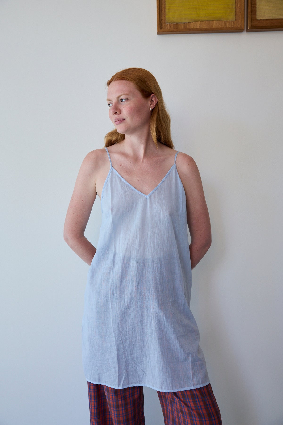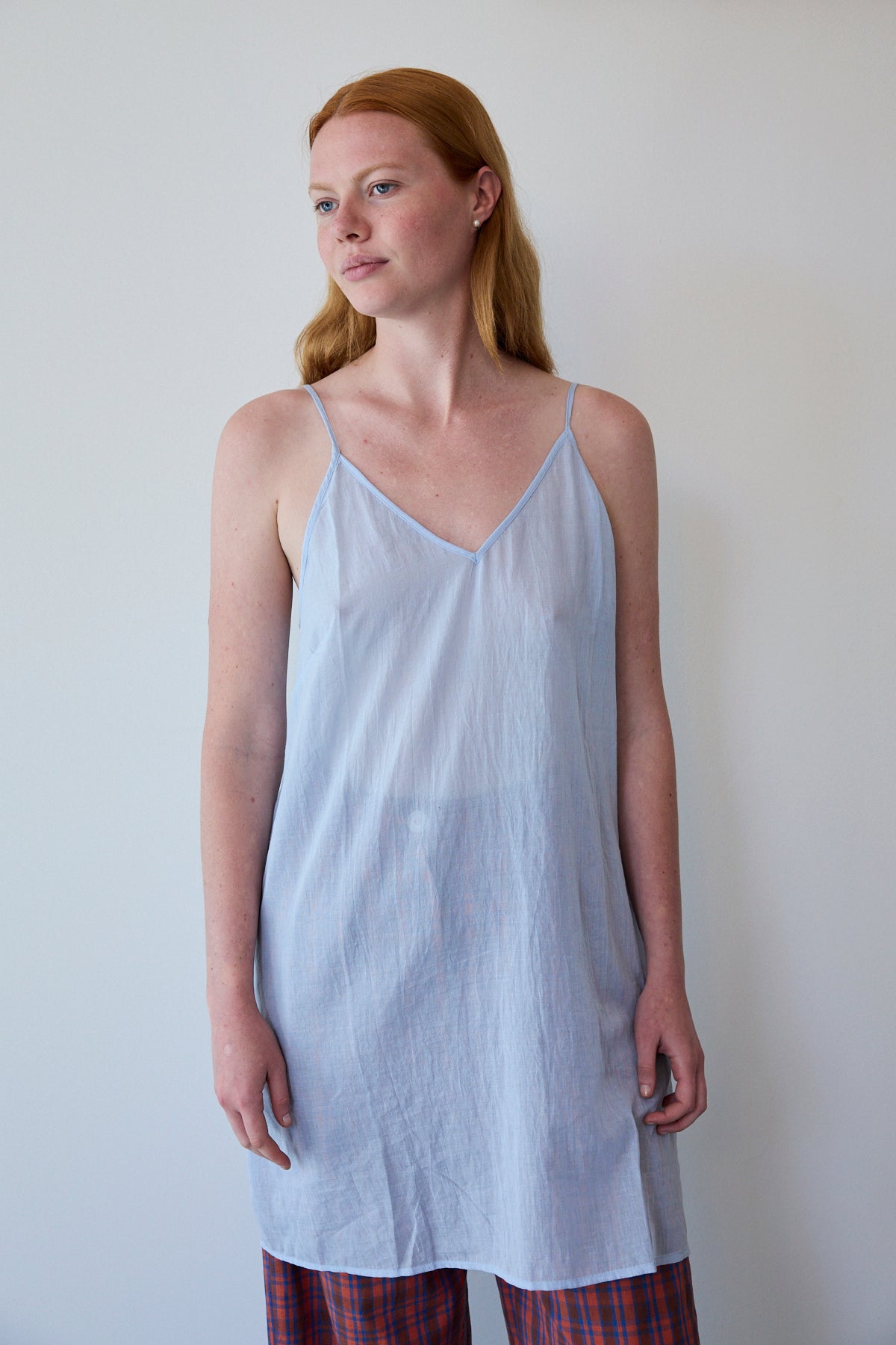 A cotton slip with adjustable straps, front V neck. A straight cut with side slits. Midlength.