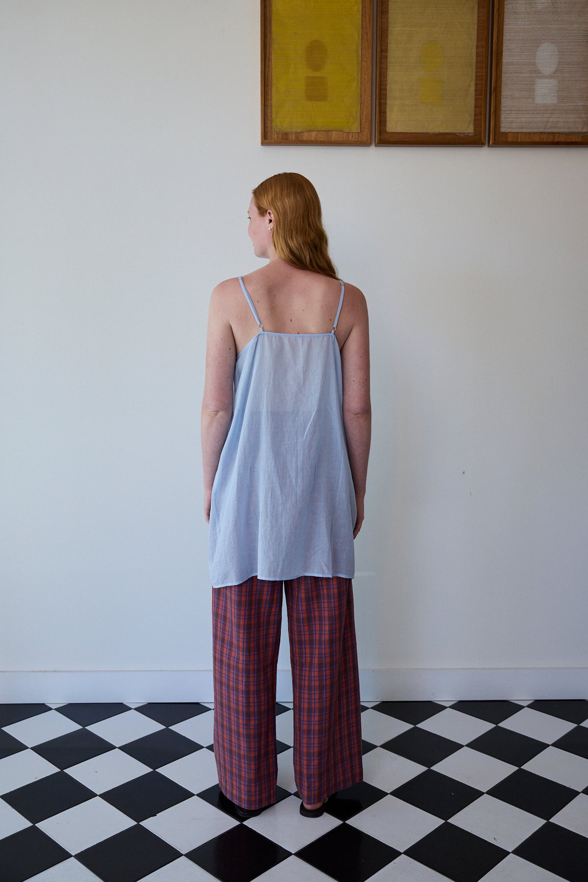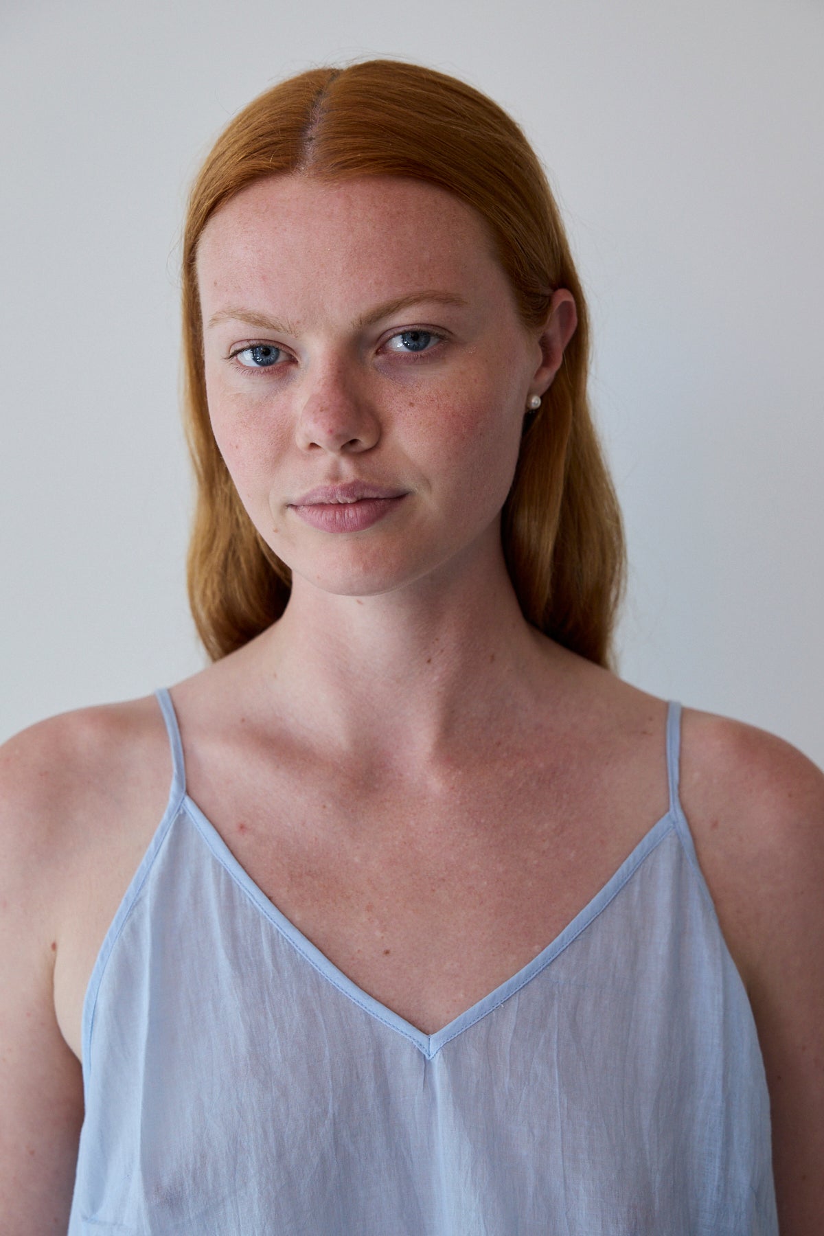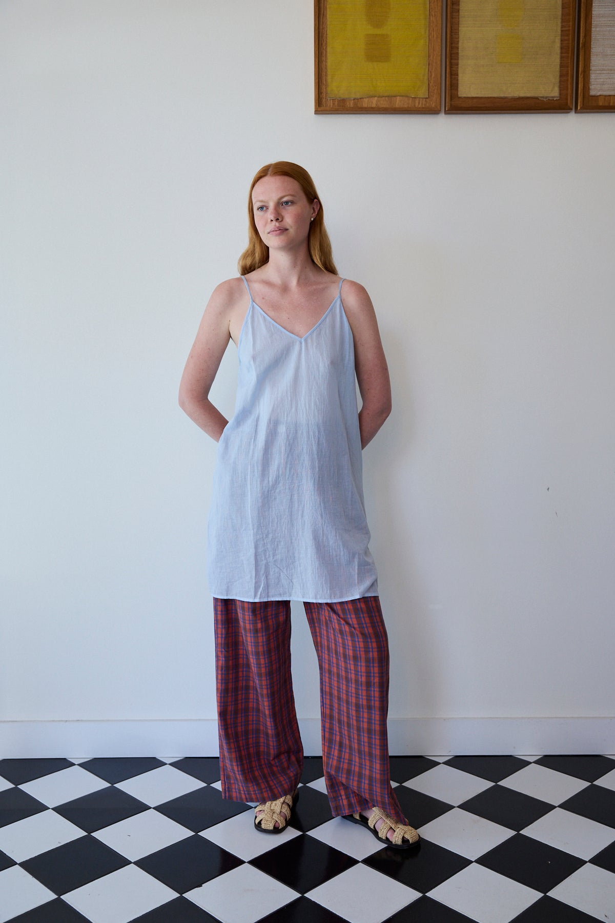 A cotton slip with adjustable straps, front V neck. A straight cut with side slits. Midlength.