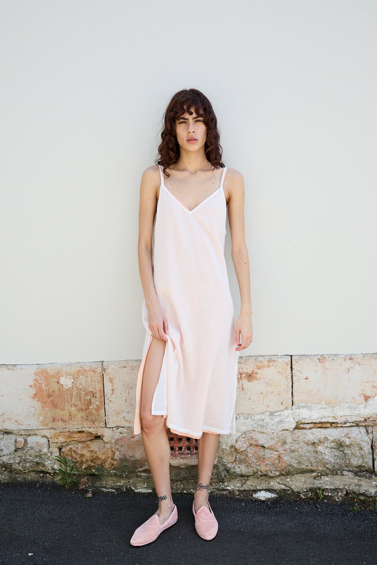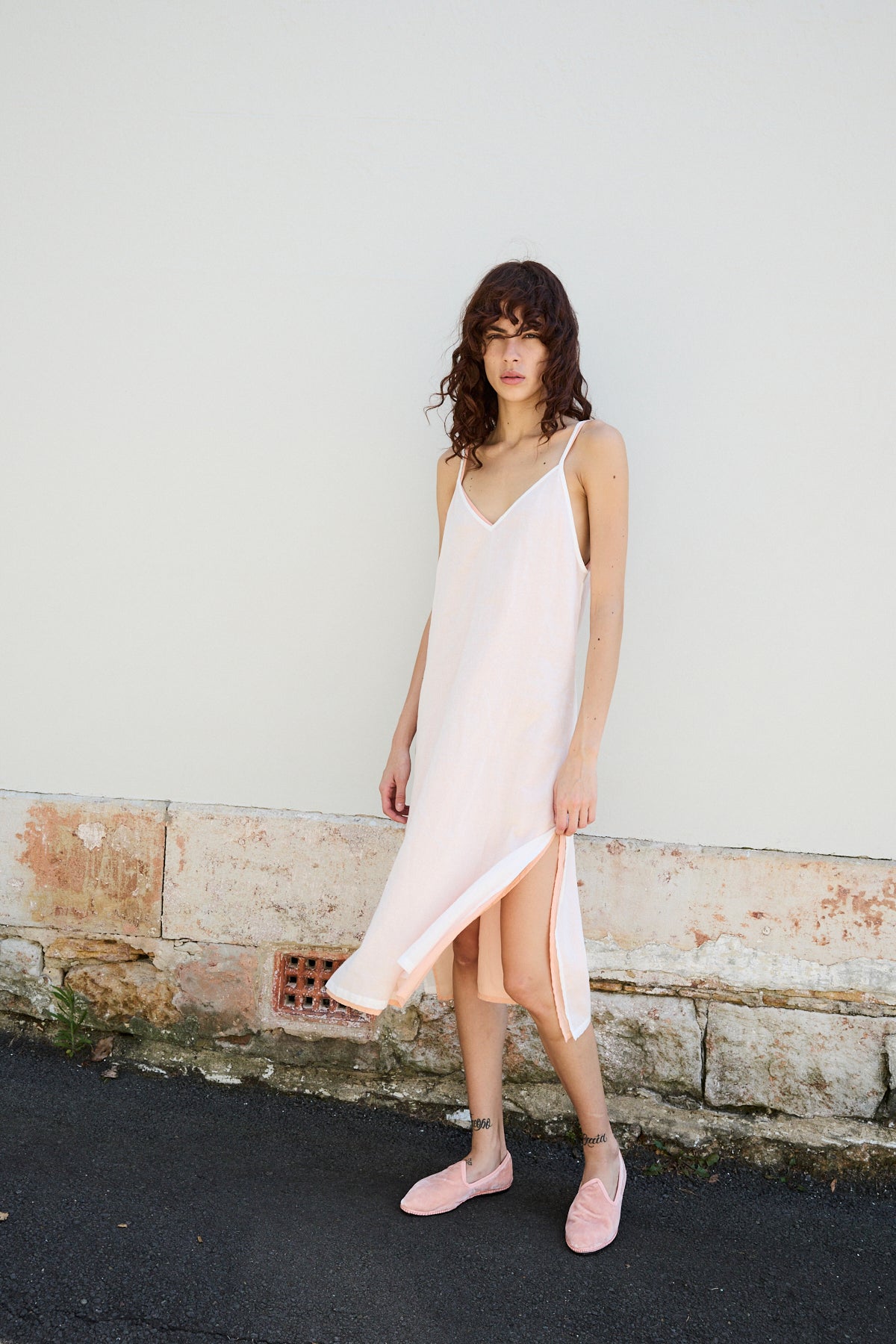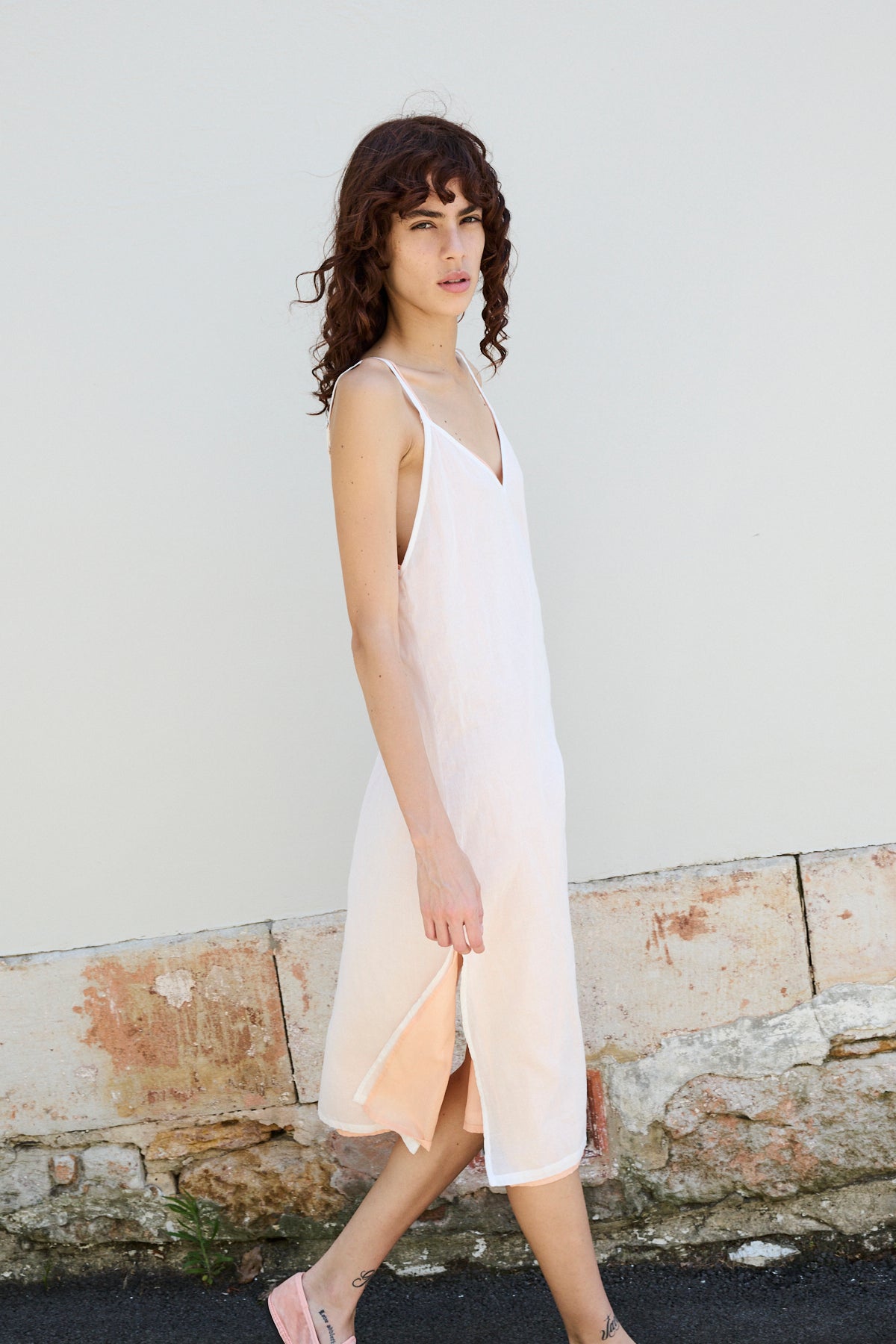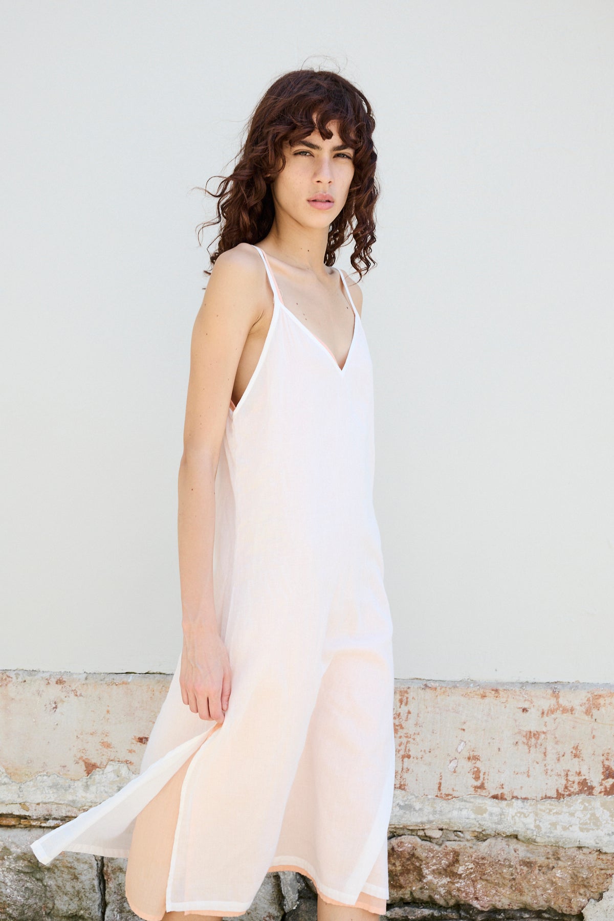 A cotton slip with adjustable straps, front V neck. A straight cut with side slits.