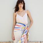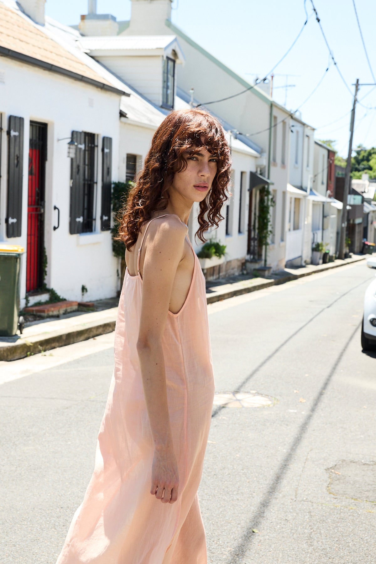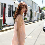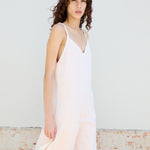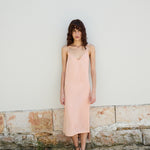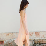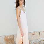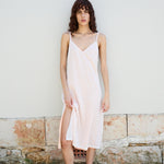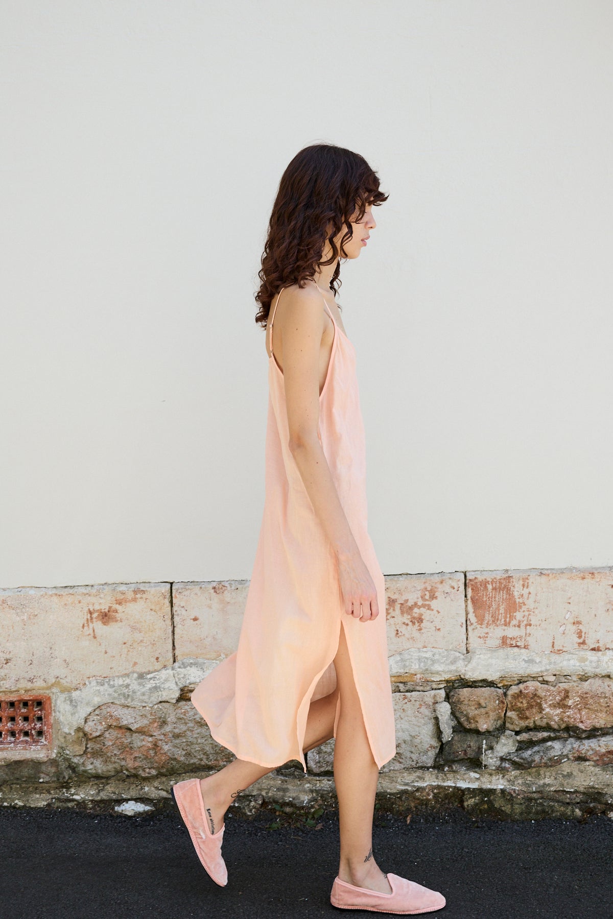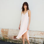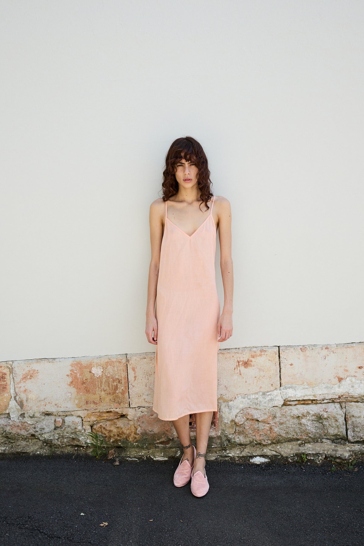 A cotton slip with adjustable straps, front V neck. A straight cut with side slits.