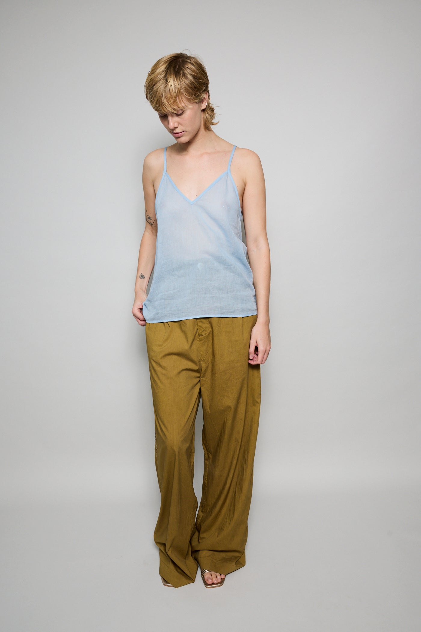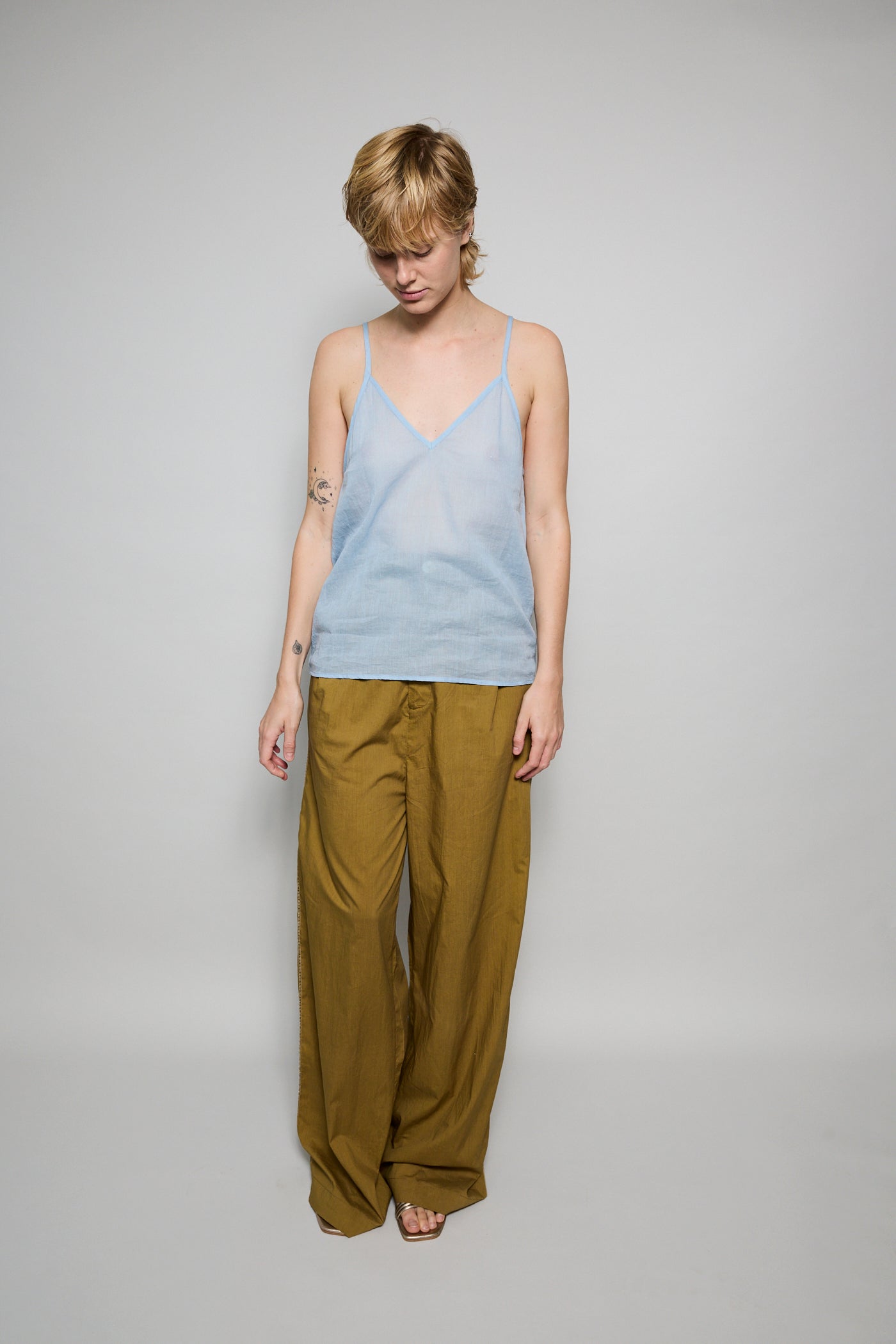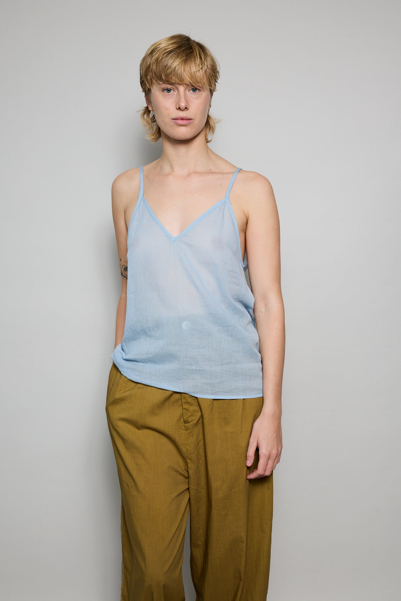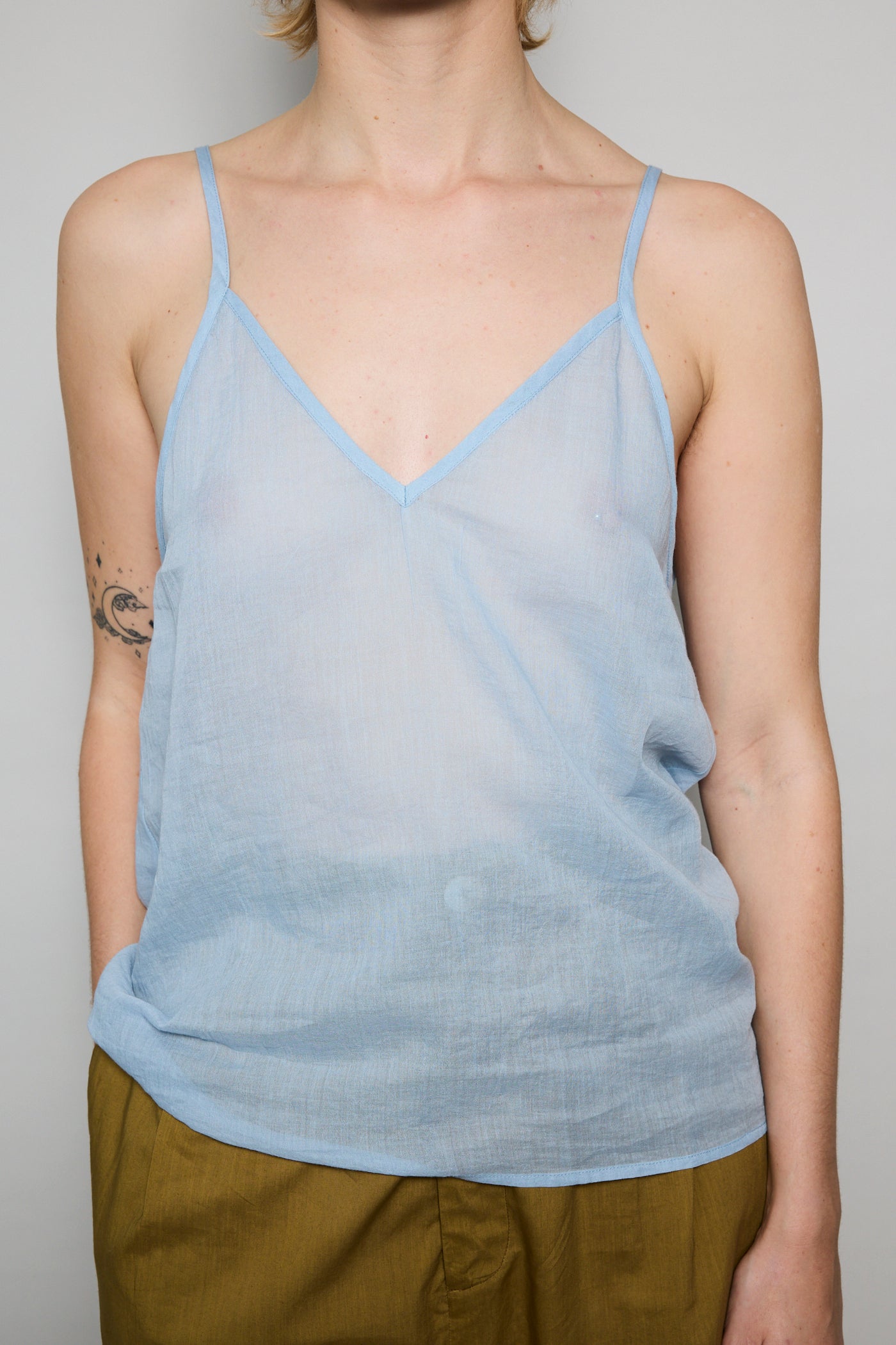 A cotton tank with adjustable straps and front V neck. A straight cut with sheer finish. Can be worn on it's own or layered.