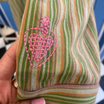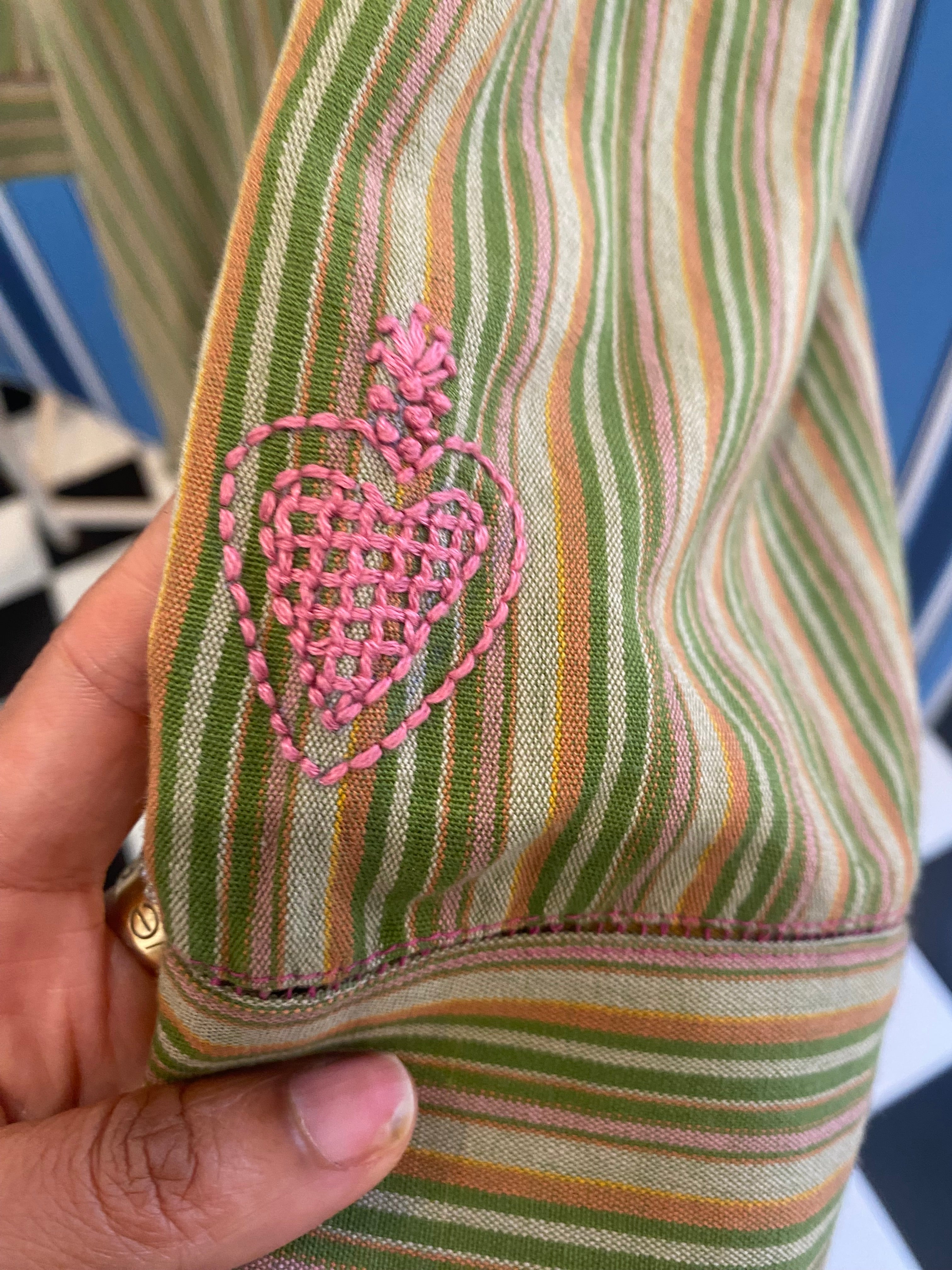 A mini tunic crafted from handloom cotton. Features front collar with woven vertical and horizontal stripes. Side slits and side pockets. Our signature heart embroidery detail on cuff.