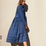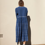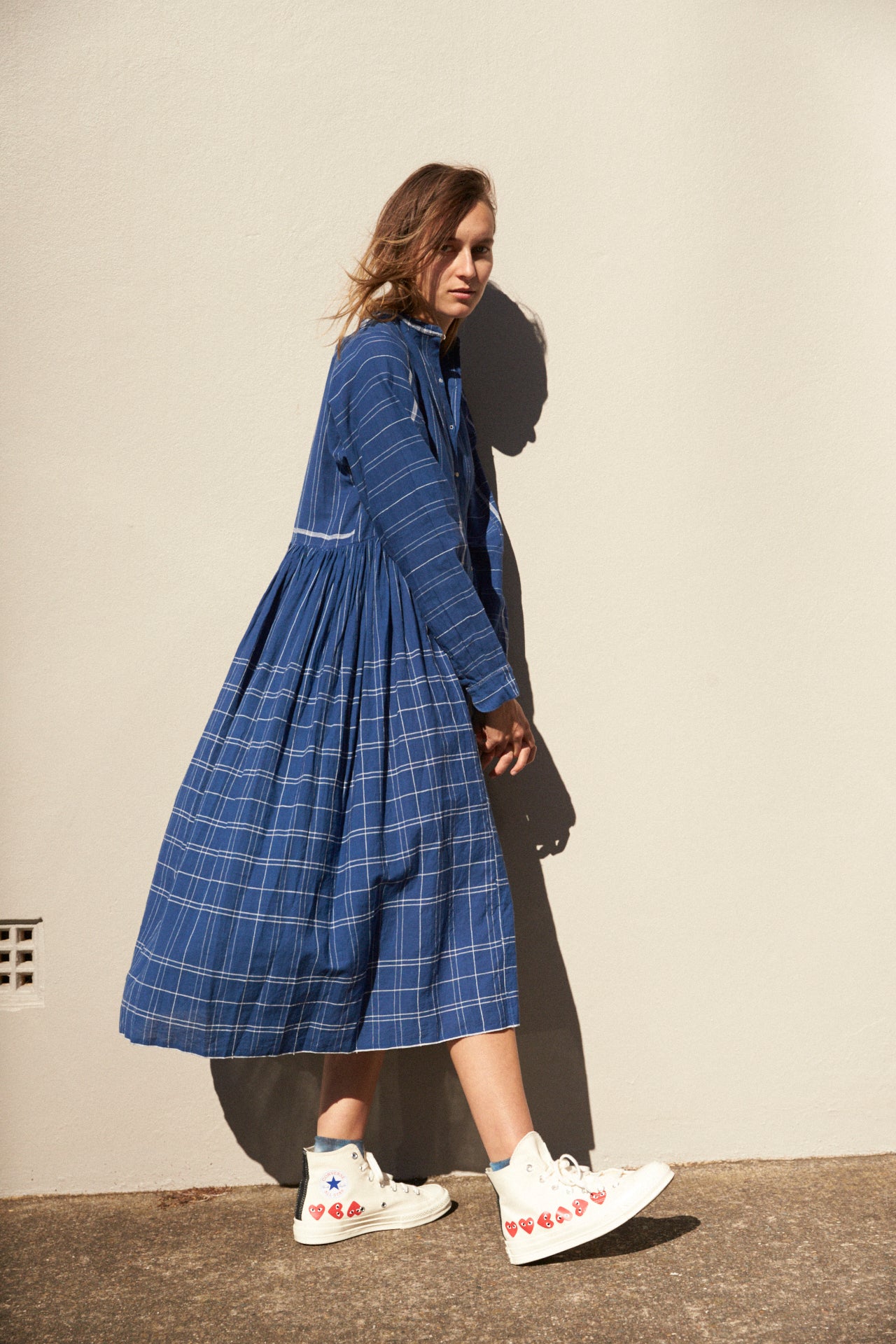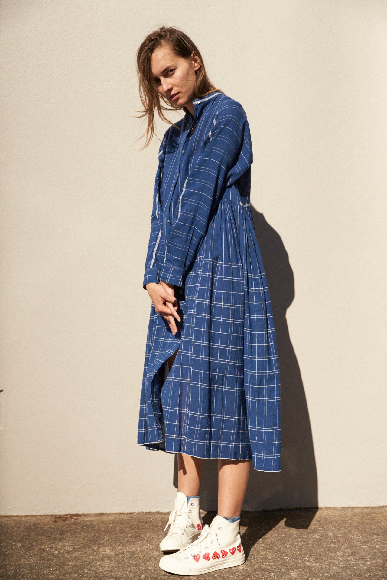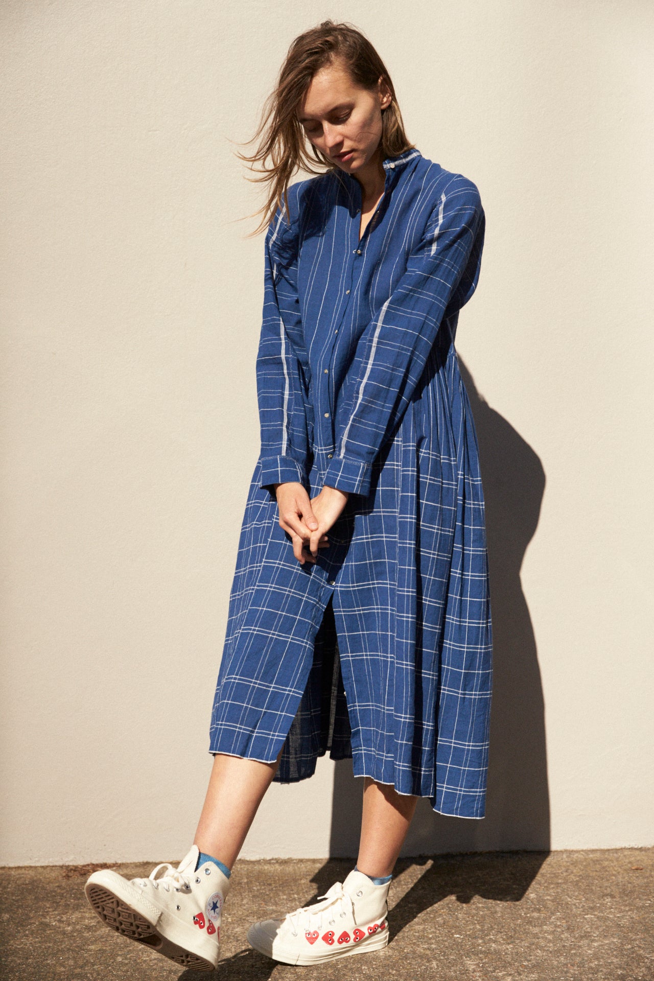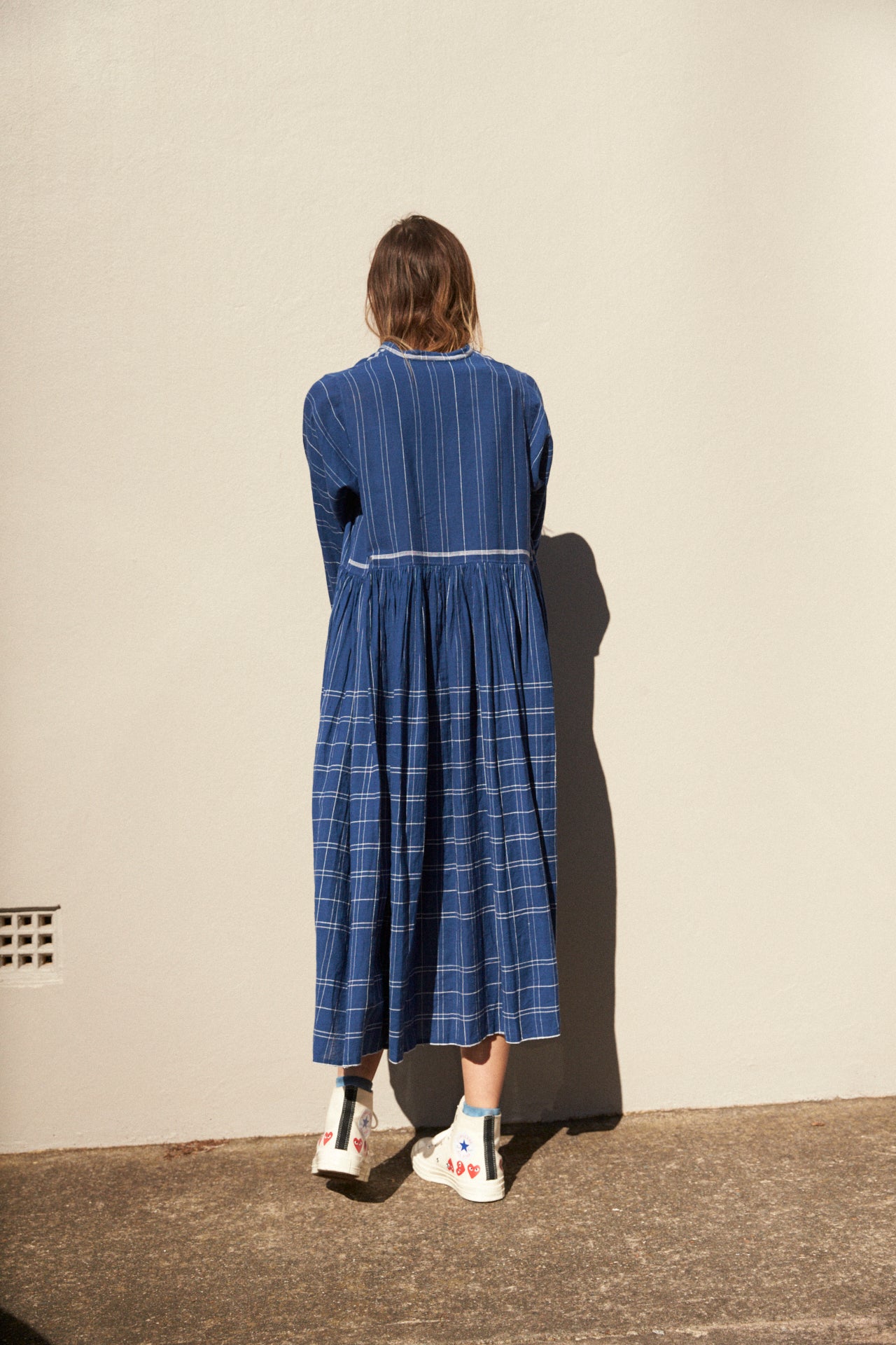 A handloom cotton shirt style dress. Featuring a high neck, front open with metallic buttons for closure. Contrast white stitching on button holes. Long sleeved with side slit pockets. Pleat detail on either side. Asymmetric in design, slightly longer at the back than front.