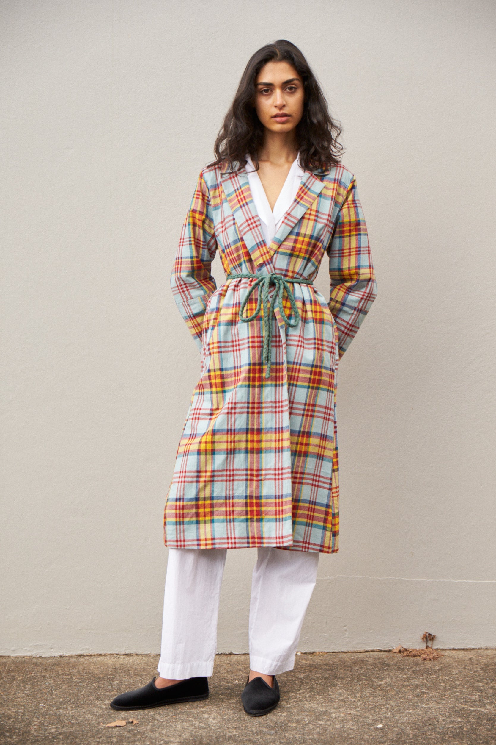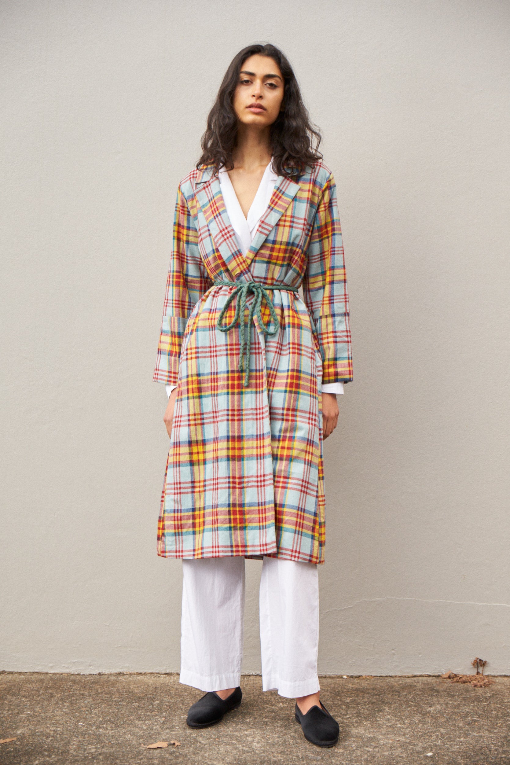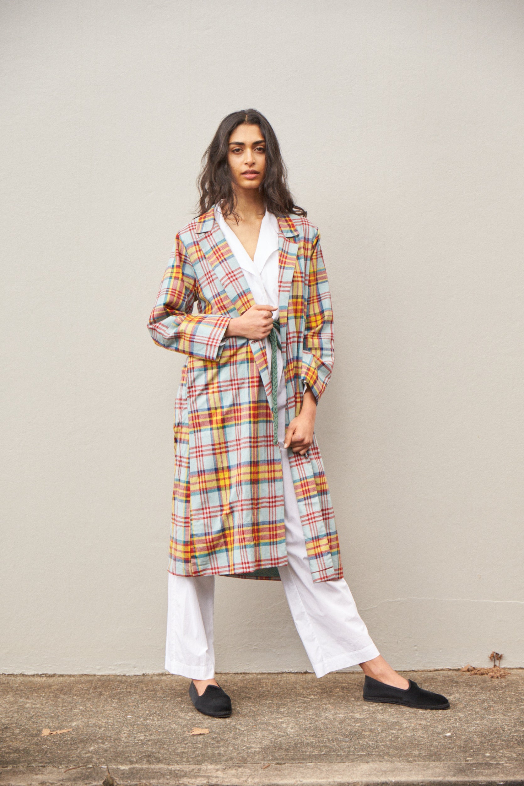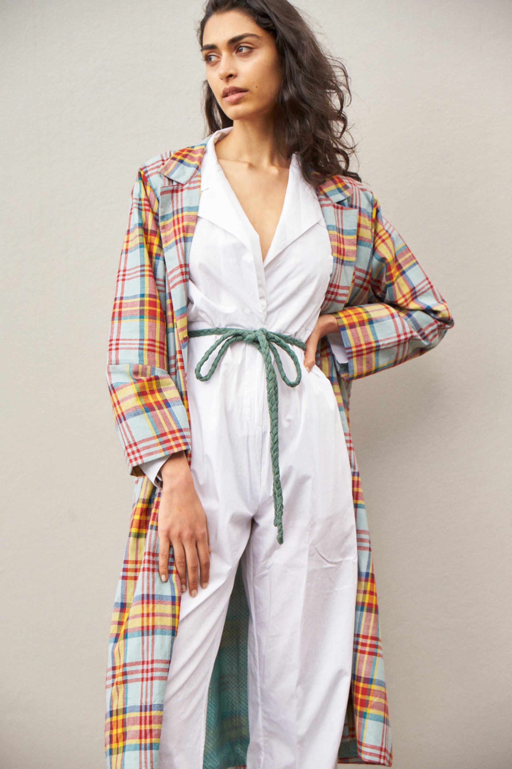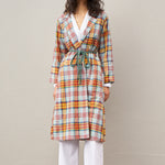 A delicate coat made from 100% hand woven wool. An oversized style with front collar. Multicolor checkered and stripe pattern through the coat. Long sleeved with side slit pockets. A single  button at the centre for fastening. Fully lined in 100% silk.