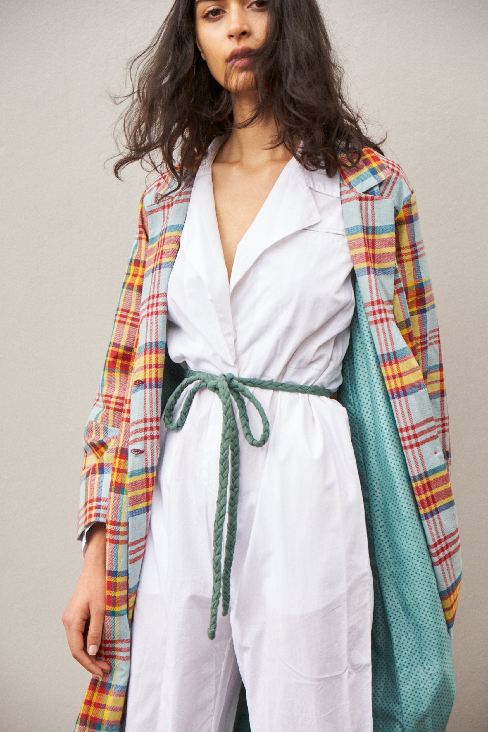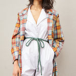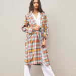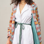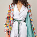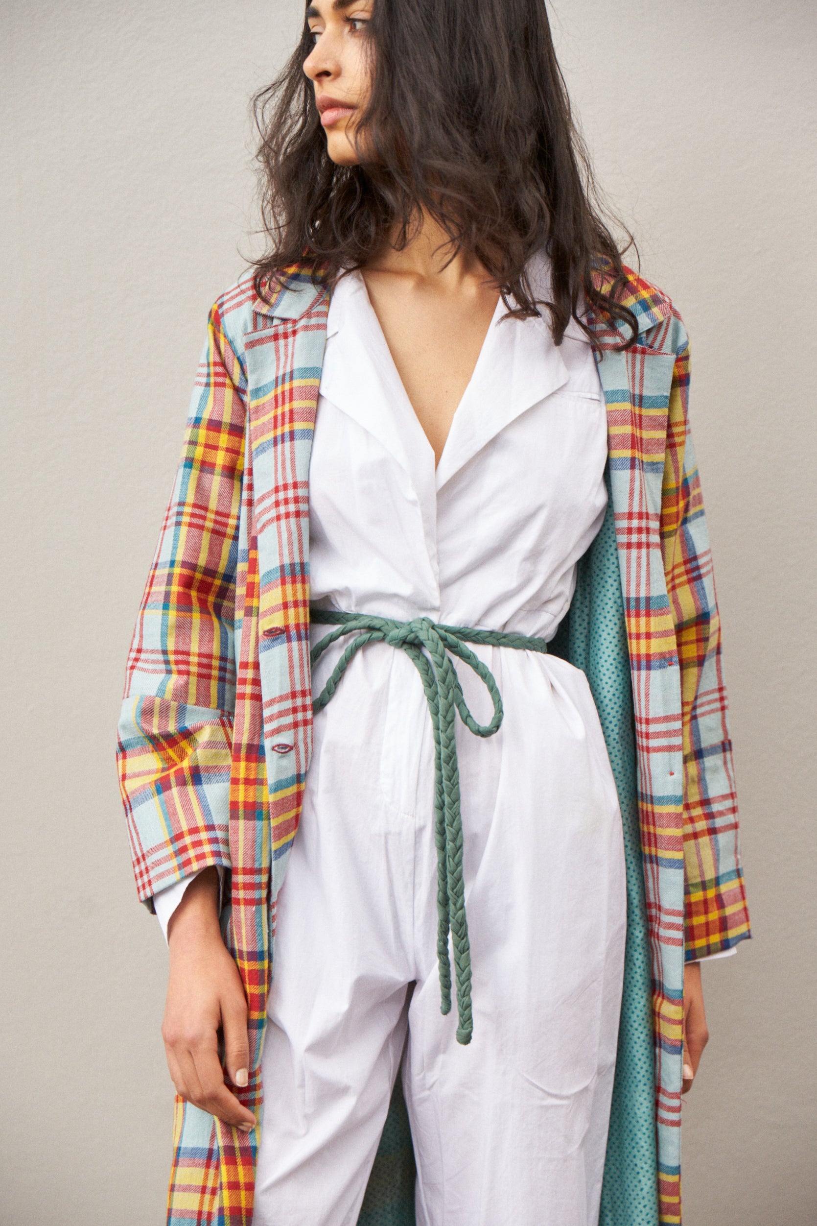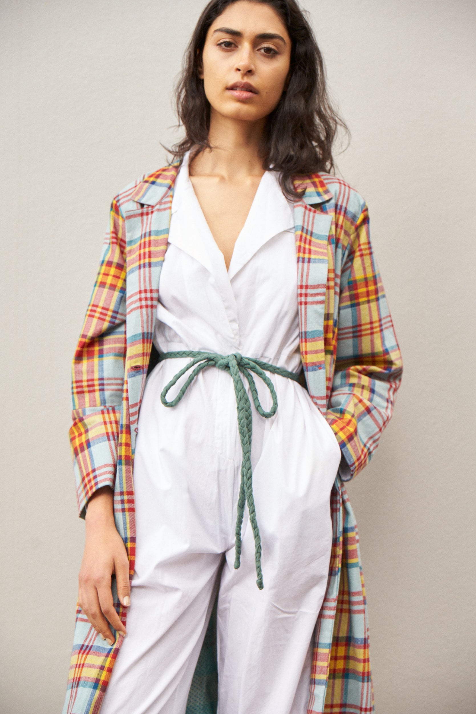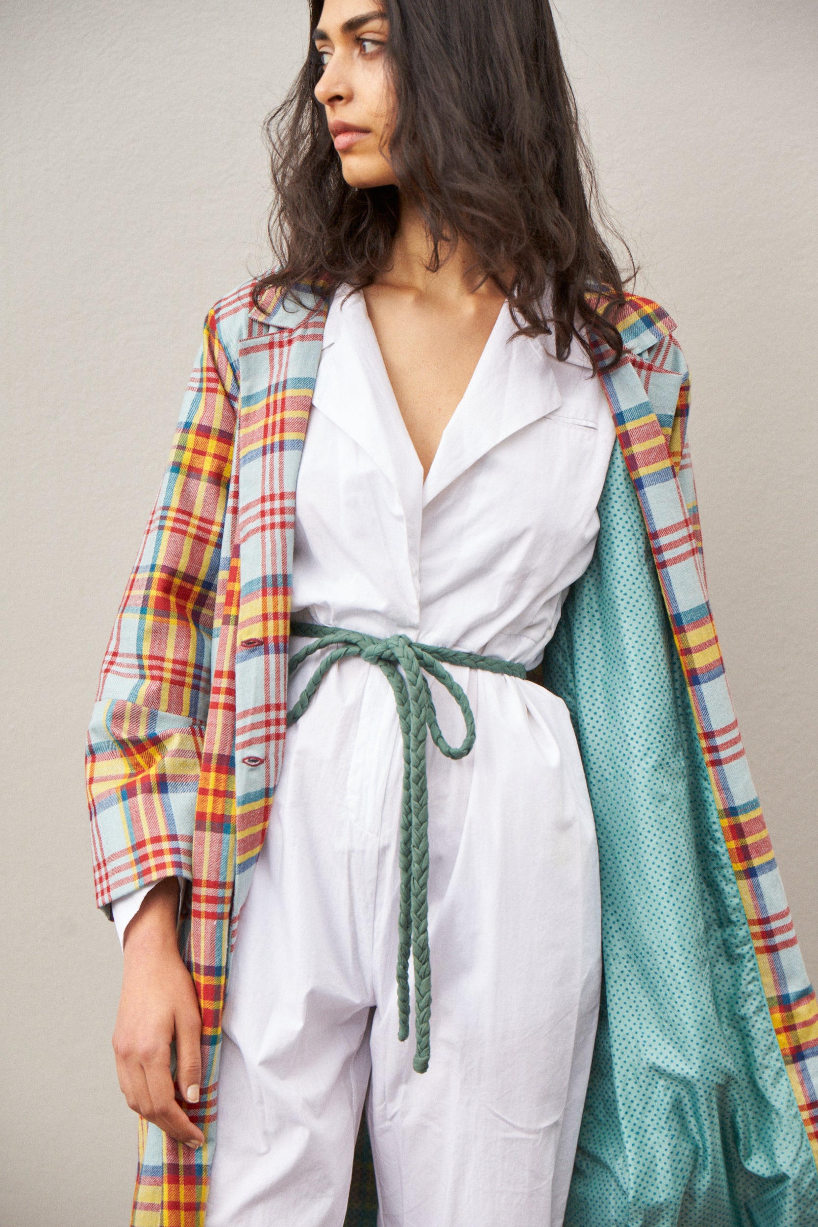 A delicate coat made from 100% hand woven wool. An oversized style with front collar. Multicolor checkered and stripe pattern through the coat. Long sleeved with side slit pockets. A single  button at the centre for fastening. Fully lined in 100% silk.