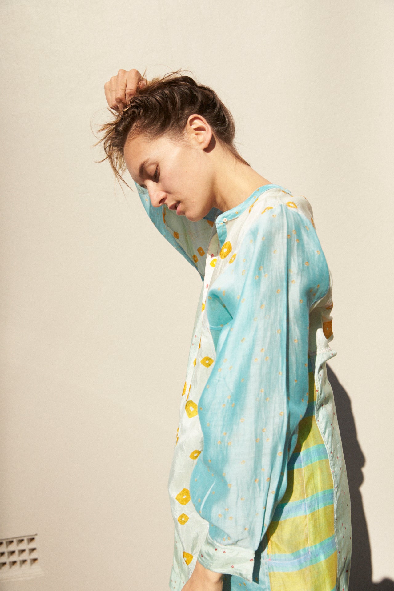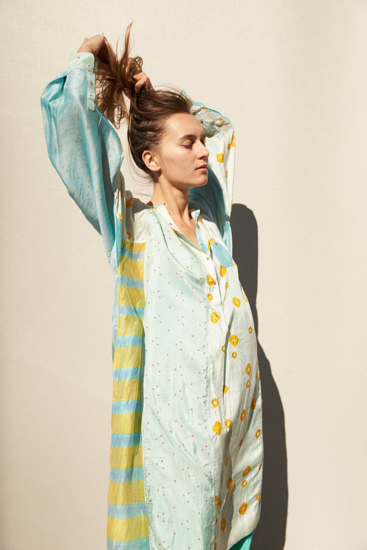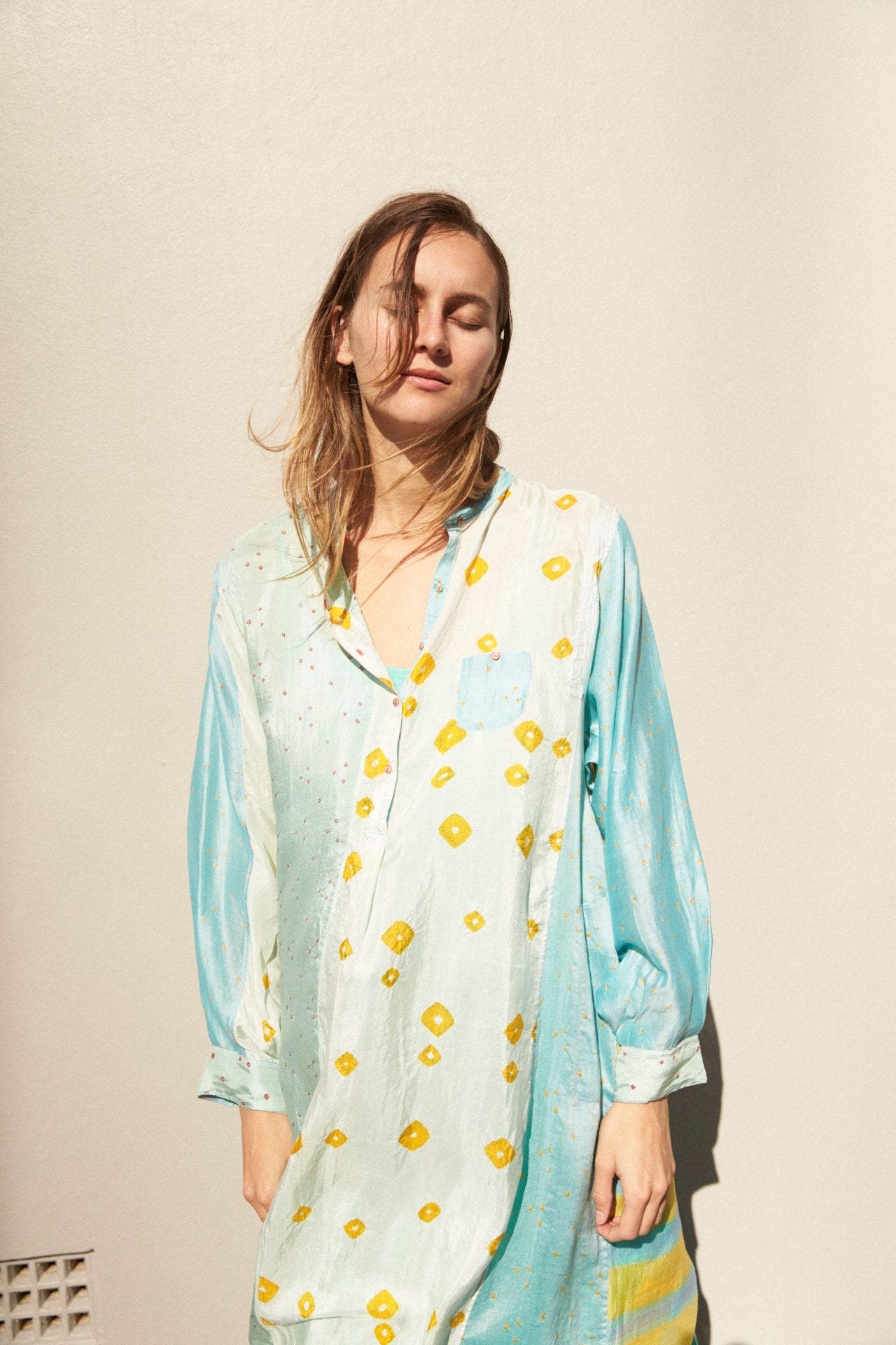 A delicate 50% silk, 50% cotton kurta featuring intricate weaving and hand tie&dye detail through the fabric. High neck with small gold buttons on body for fastening. Contrast pink stitch on buttons and button holes. Multiple coloured panels with sides and back featuring yellow, blue, green woven stripes and bhandini tie&dye. Long sleeved with double button on cuff. A sheer and delicate finish. Side slit pockets. Asymmetric in design, slightly longer at the back than front.