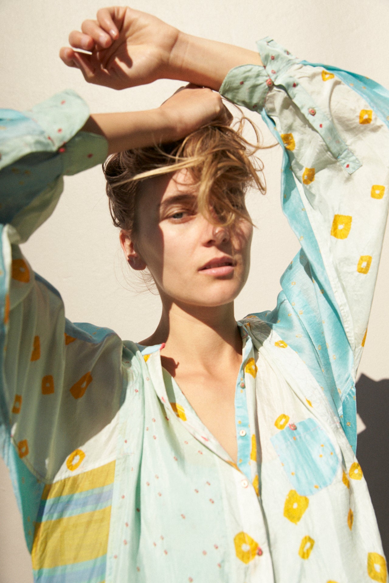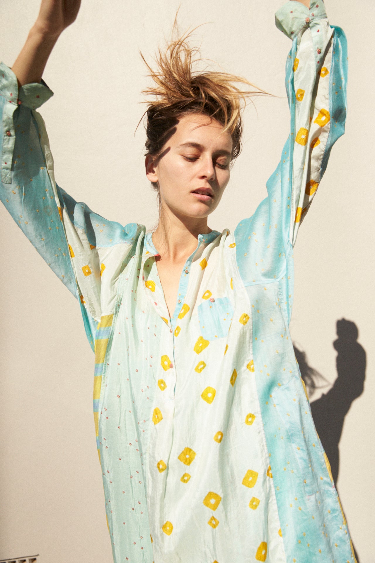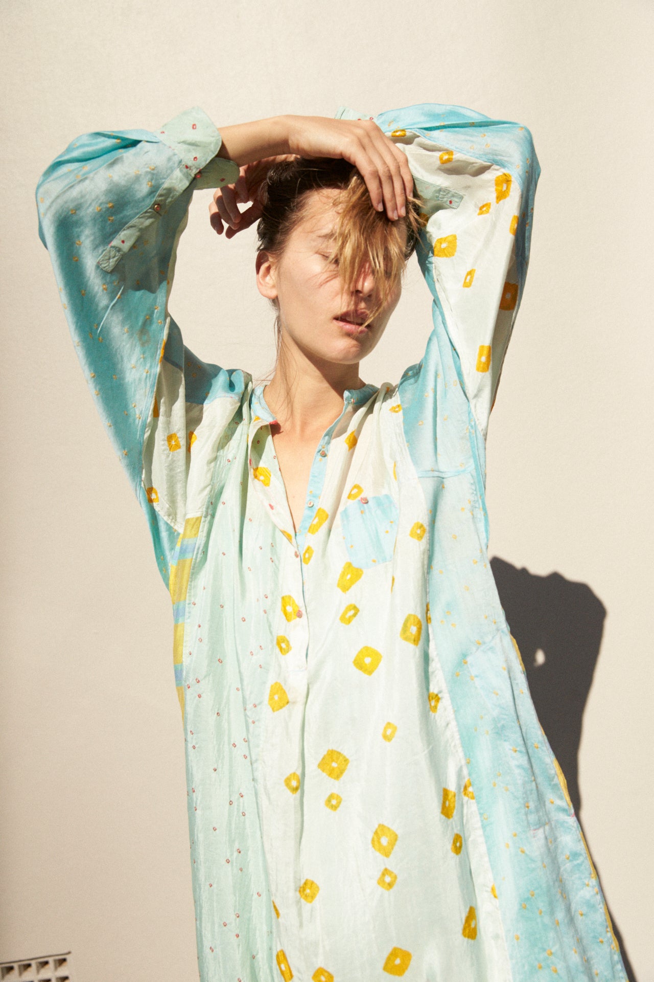 A delicate 50% silk, 50% cotton kurta featuring intricate weaving and hand tie&dye detail through the fabric. High neck with small gold buttons on body for fastening. Contrast pink stitch on buttons and button holes. Multiple coloured panels with sides and back featuring yellow, blue, green woven stripes and bhandini tie&dye. Long sleeved with double button on cuff. A sheer and delicate finish. Side slit pockets. Asymmetric in design, slightly longer at the back than front.