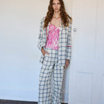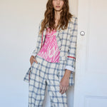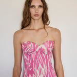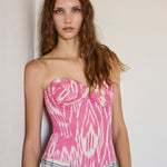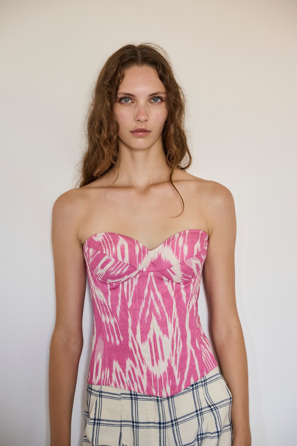 A handwoven corset with boning structure and ikat patterned throughout. Sweetheart neckline. Features  rivets with string detail at back for adjusting. Side zip closure.