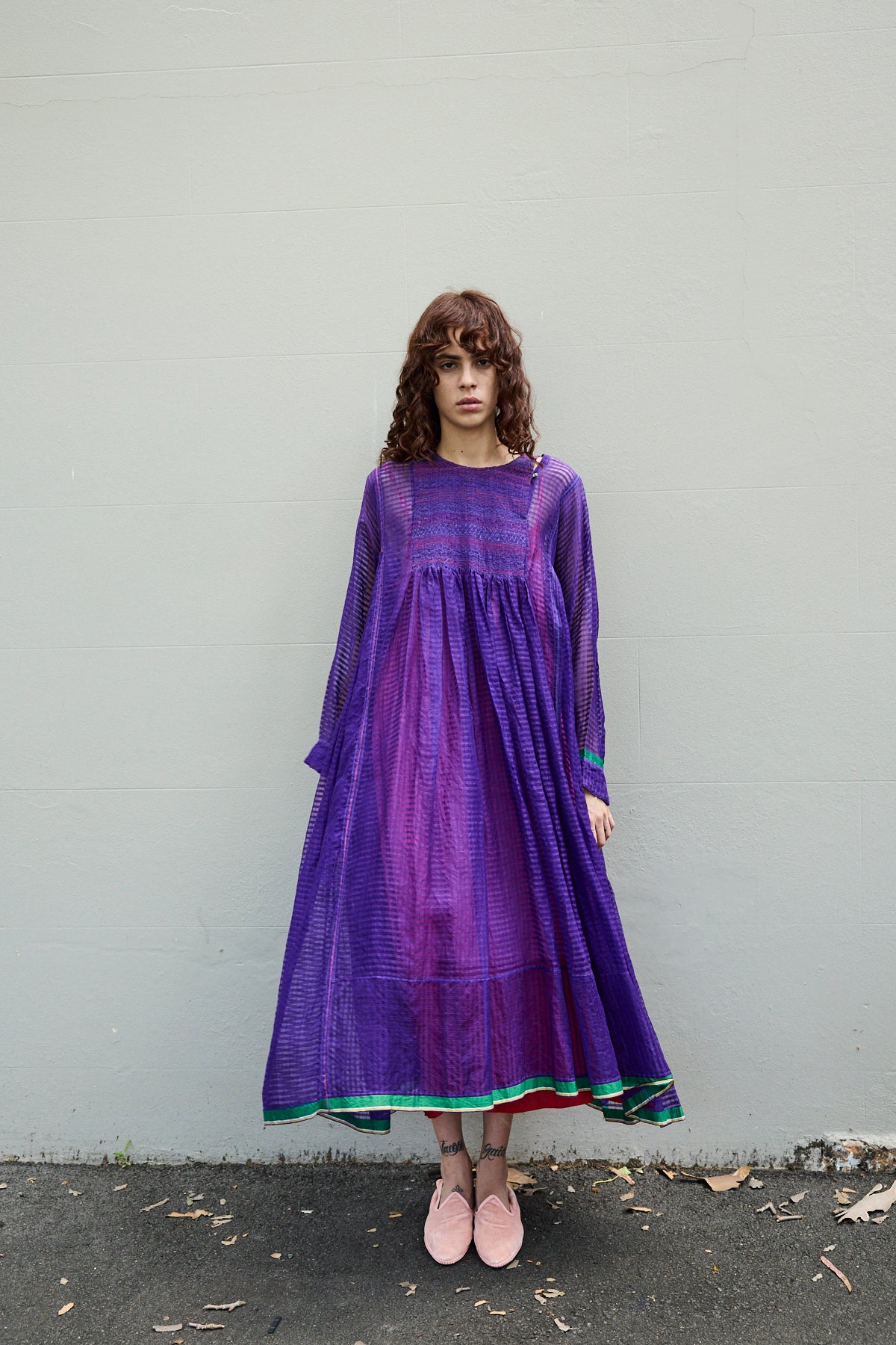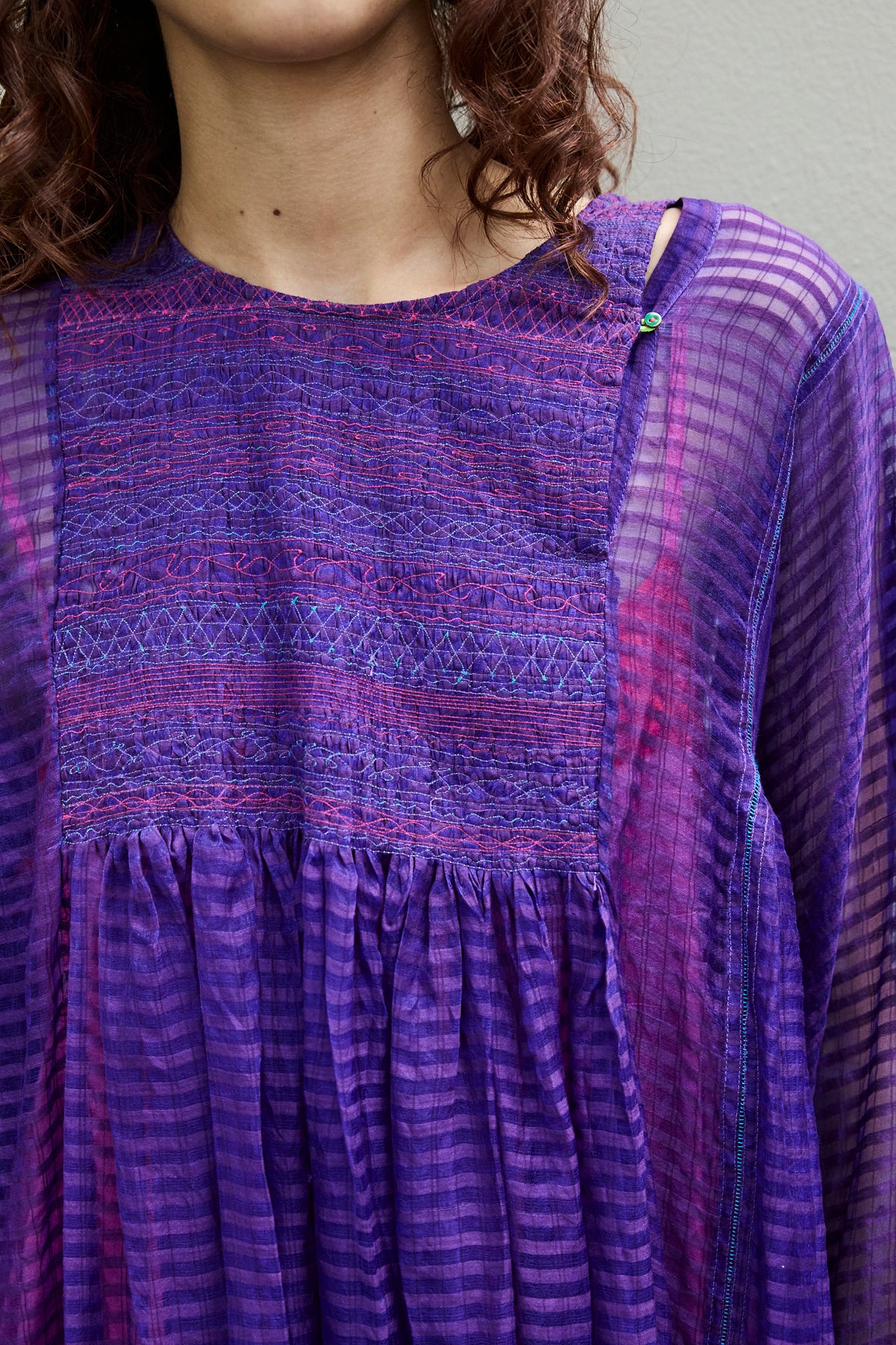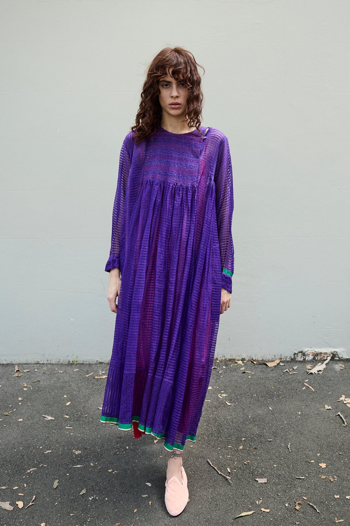 An intricately made handloom cotton silk dress. Features a fully embroidered yolk panel on the front and back. Side pleat detail with front and back ruching. Purple sheer stripes through the dress with interlock embroidery detail. A round neck with contrast metallic button closure in blue and green. Bold green stripe along hemline.  A sheer finish. Side pockets.