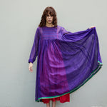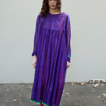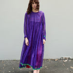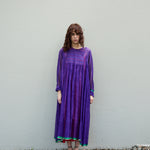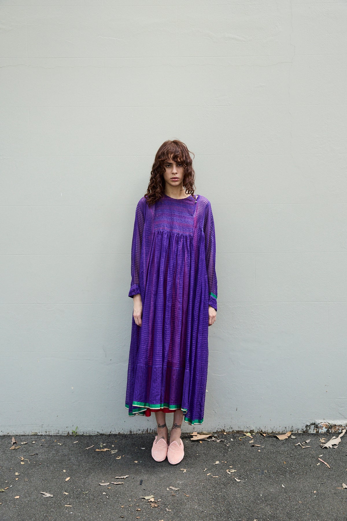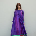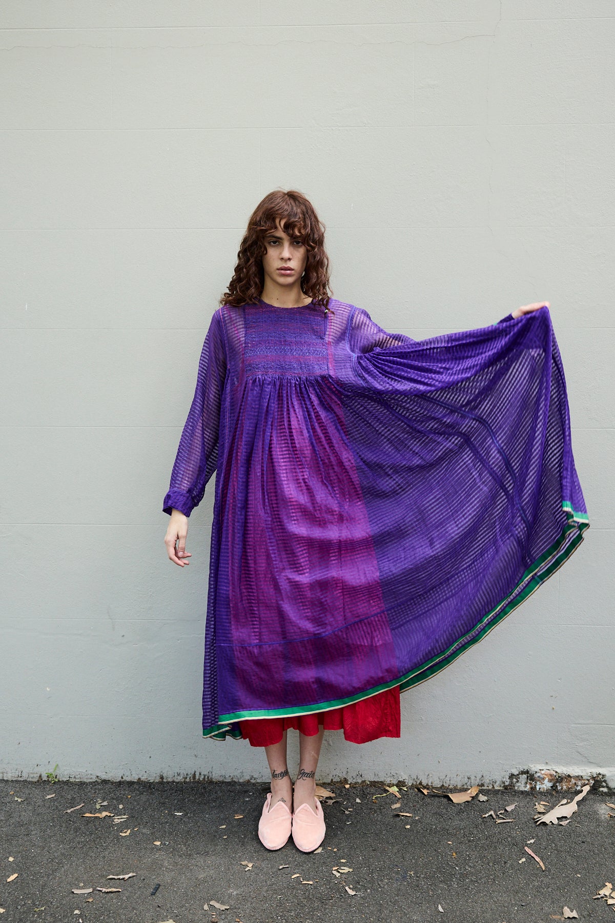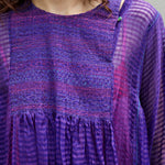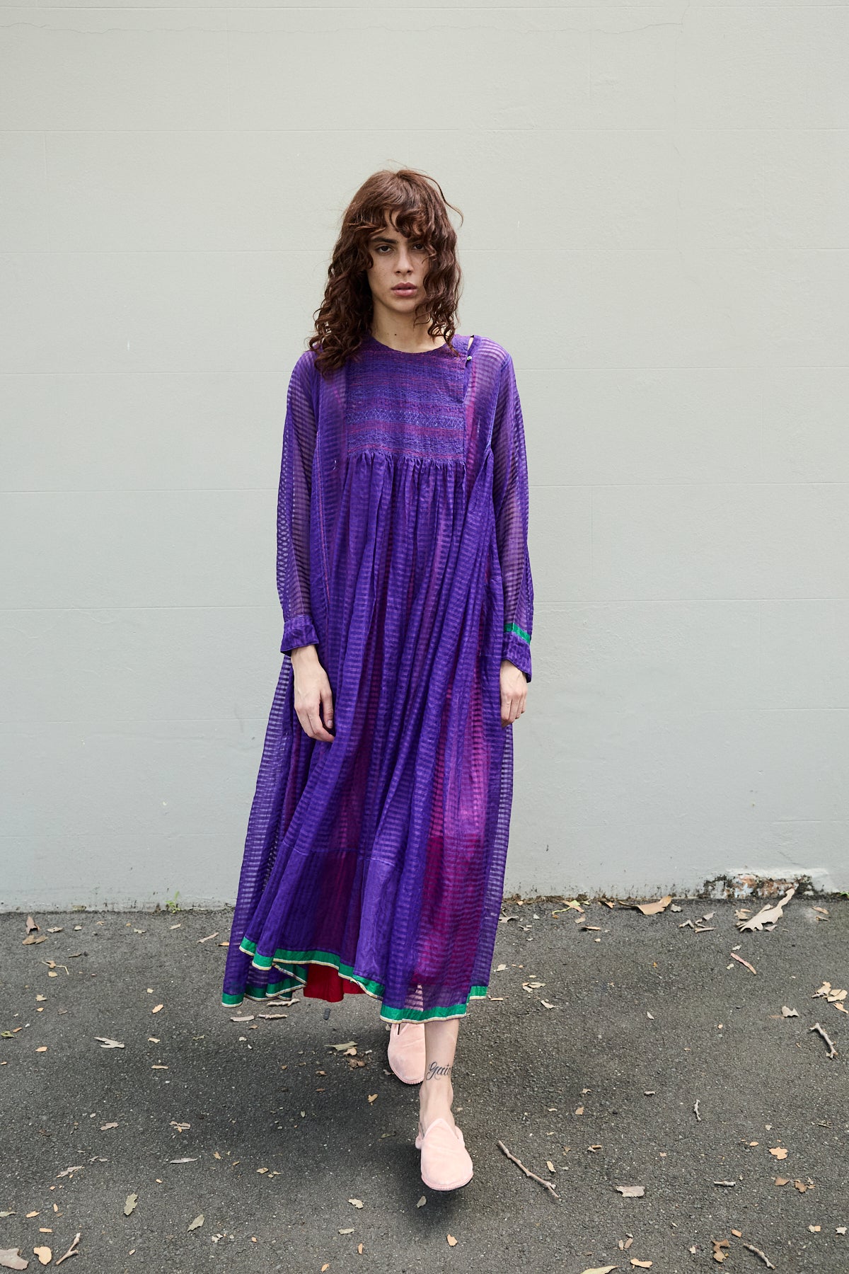 An intricately made handloom cotton silk dress. Features a fully embroidered yolk panel on the front and back. Side pleat detail with front and back ruching. Purple sheer stripes through the dress with interlock embroidery detail. A round neck with contrast metallic button closure in blue and green. Bold green stripe along hemline.  A sheer finish. Side pockets.