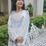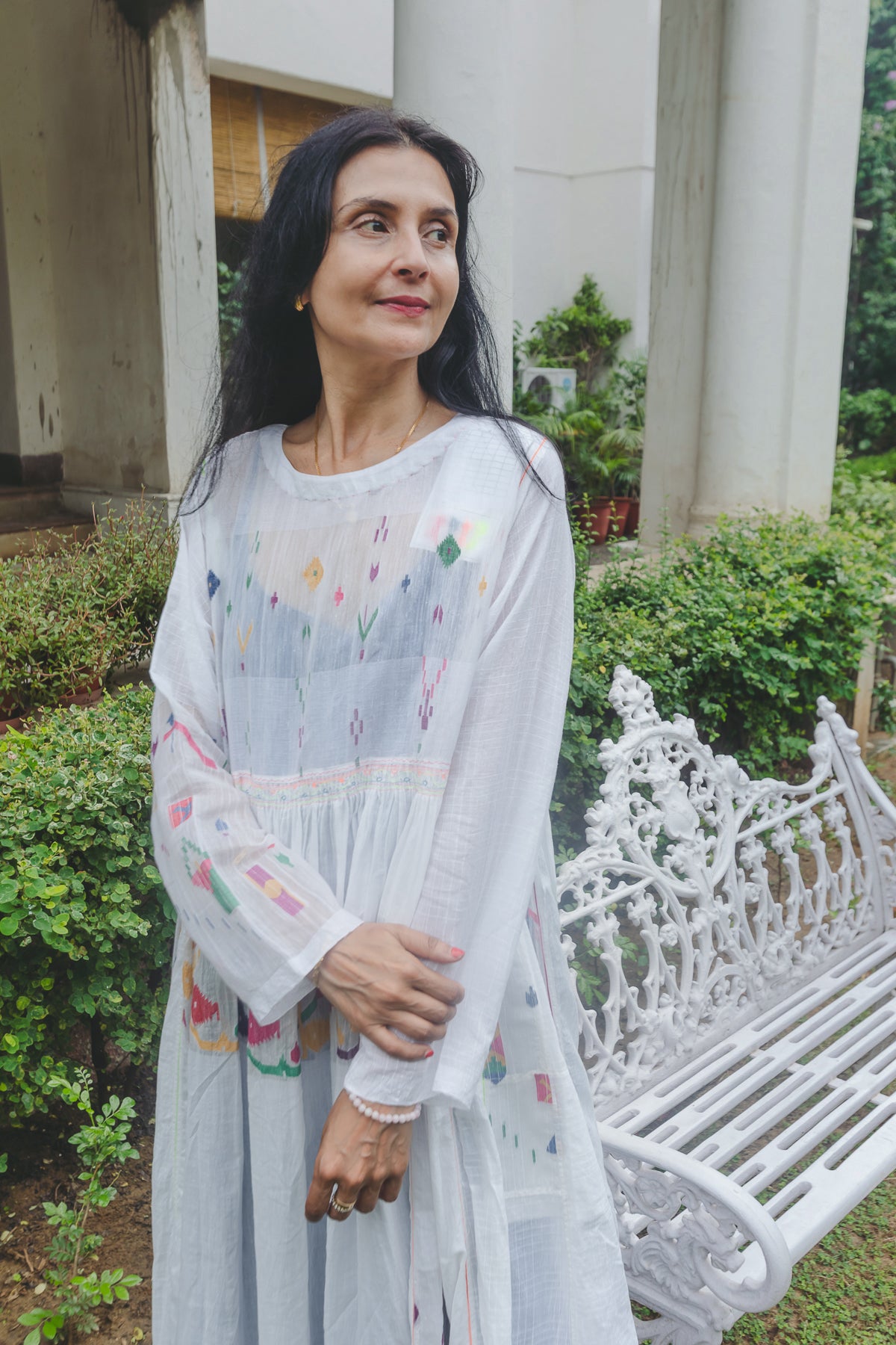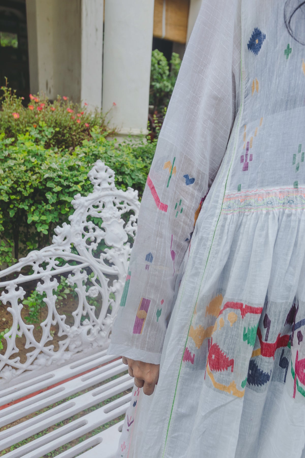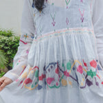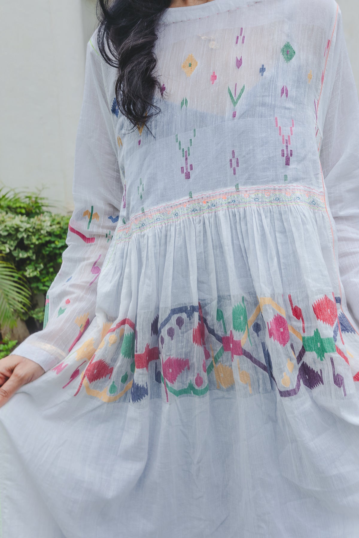 An intricately made baby doll style dress. Features contrast multicolor handwoven jamdani pattern through the dress. Ruching below waistline. Delicate embroidery panel on chest. A round neck with single side button closure and pink hand stitch. Metallic button with single pink loop for fastening. Contrast interlock embroidery through the dress. A sheer finish. Side pockets.