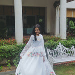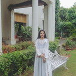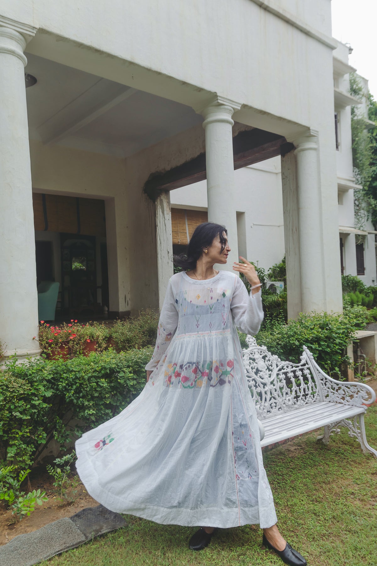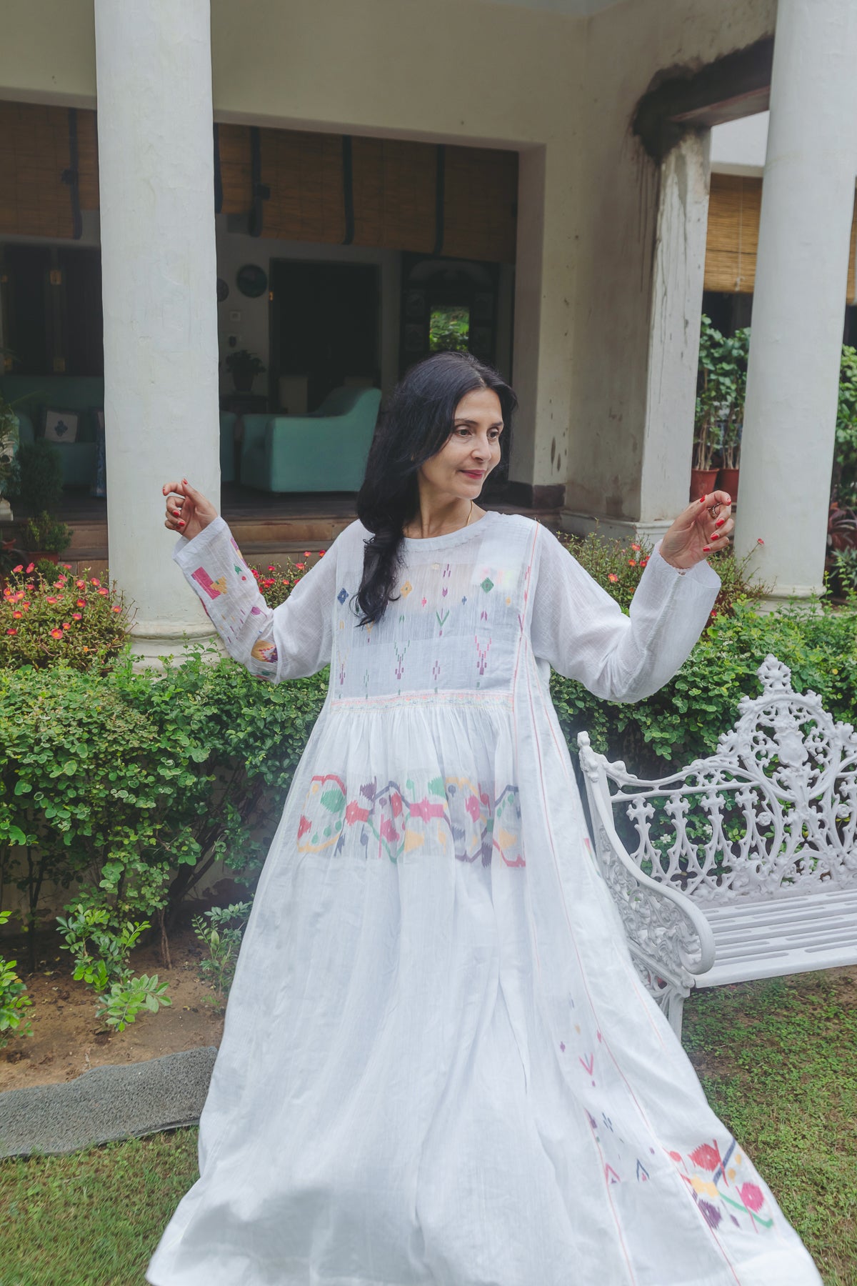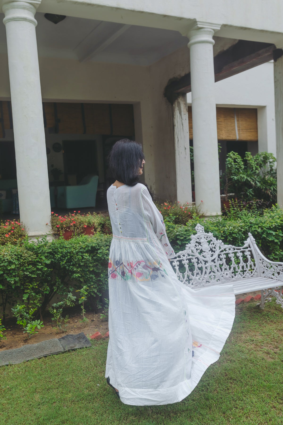 An intricately made baby doll style dress. Features contrast multicolor handwoven jamdani pattern through the dress. Ruching below waistline. Delicate embroidery panel on chest. A round neck with single side button closure and pink hand stitch. Metallic button with single pink loop for fastening. Contrast interlock embroidery through the dress. A sheer finish. Side pockets.