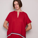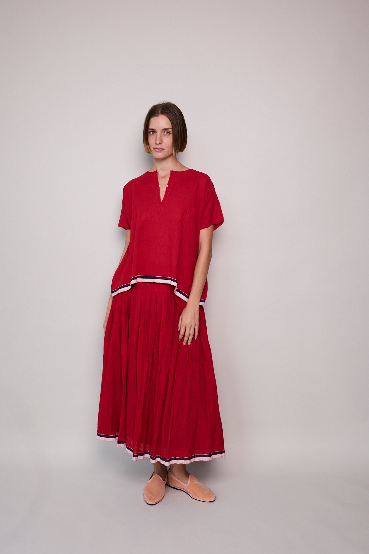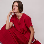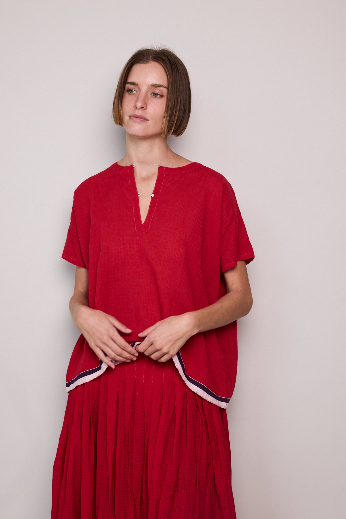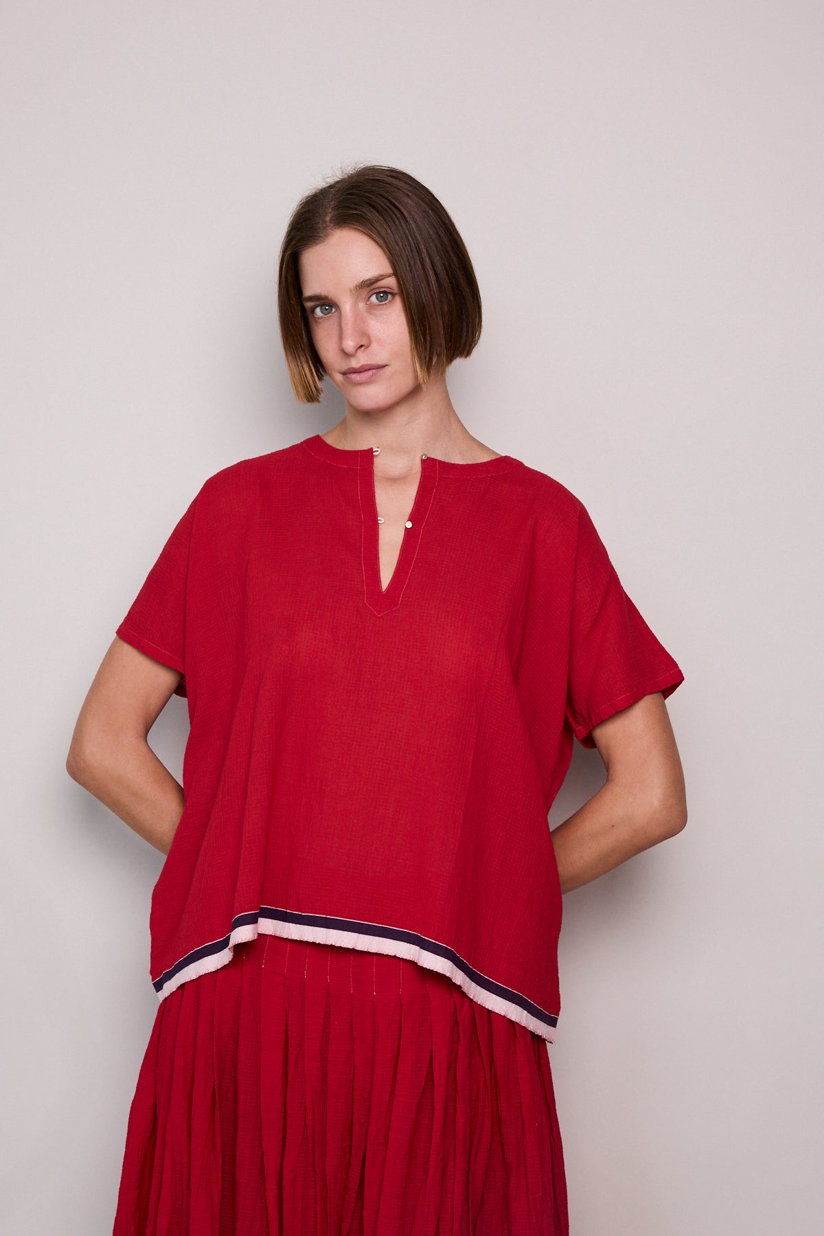 A boxy fit handloom 100% cotton shirt. Features a scoop neck with front open and double button with loop detail. Contrast white stitching and silver hardware buttons. Features a navy blue and white selvedge stripe along hemline. Short sleeved.
