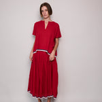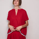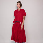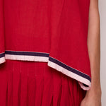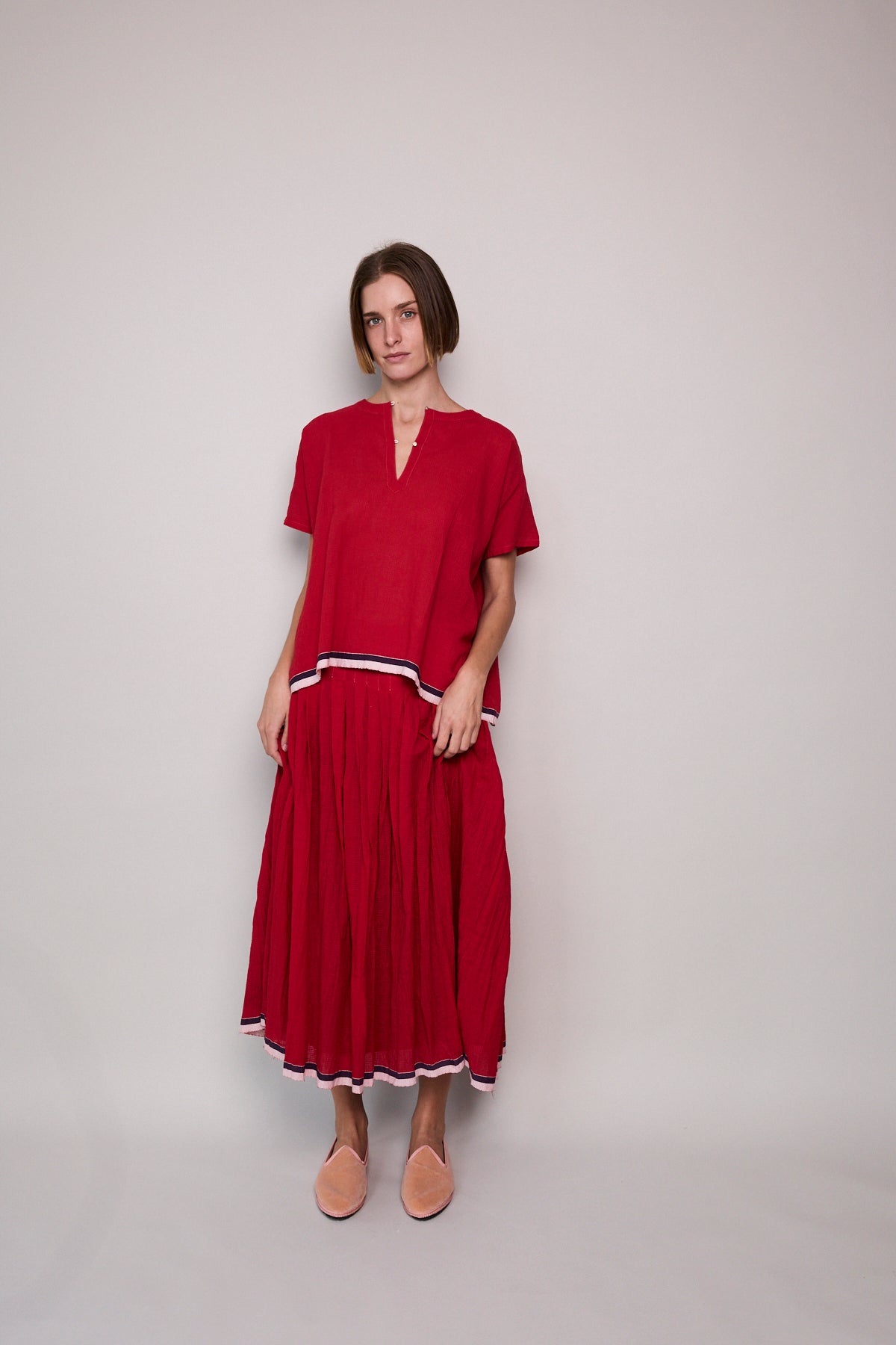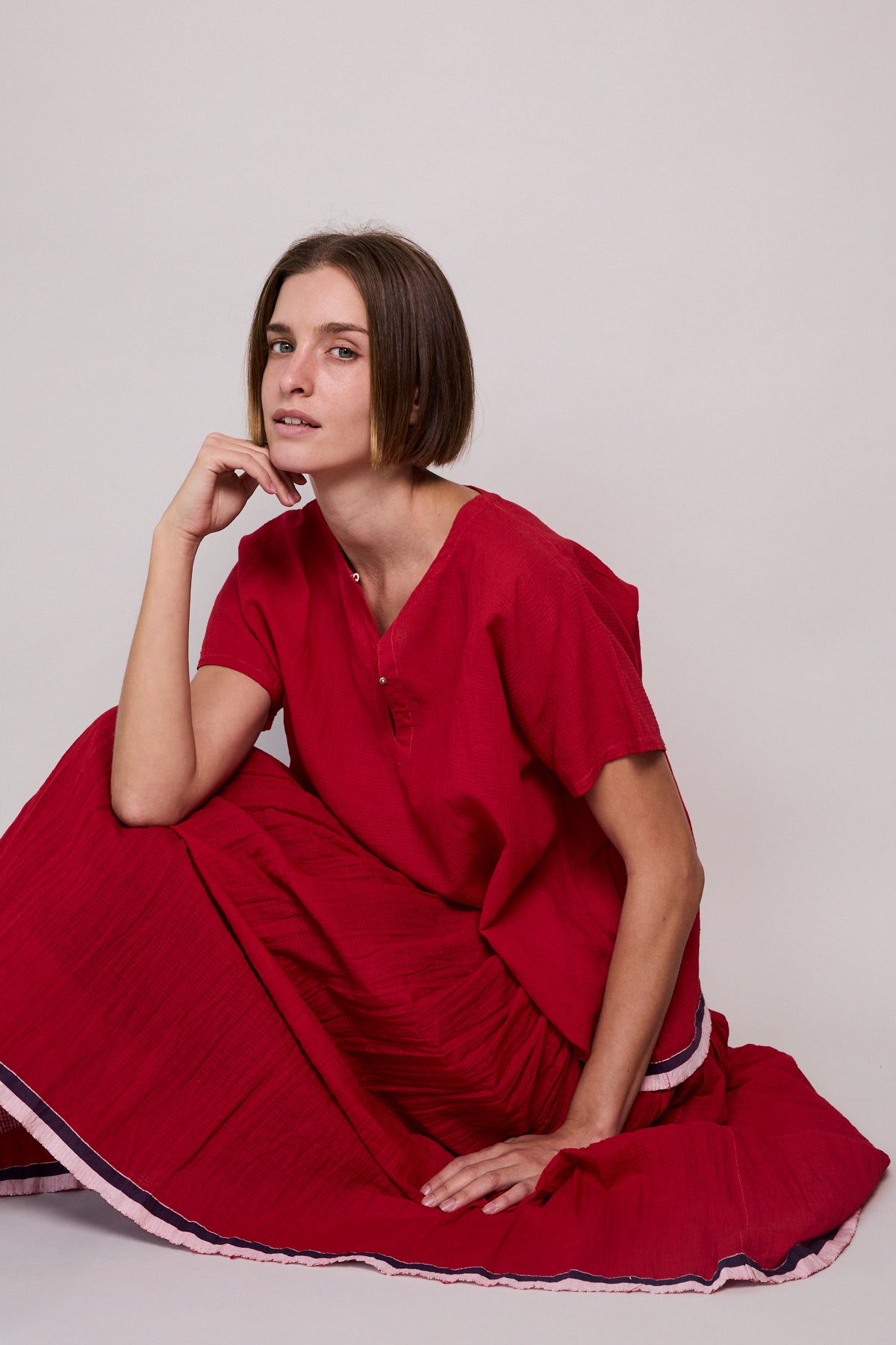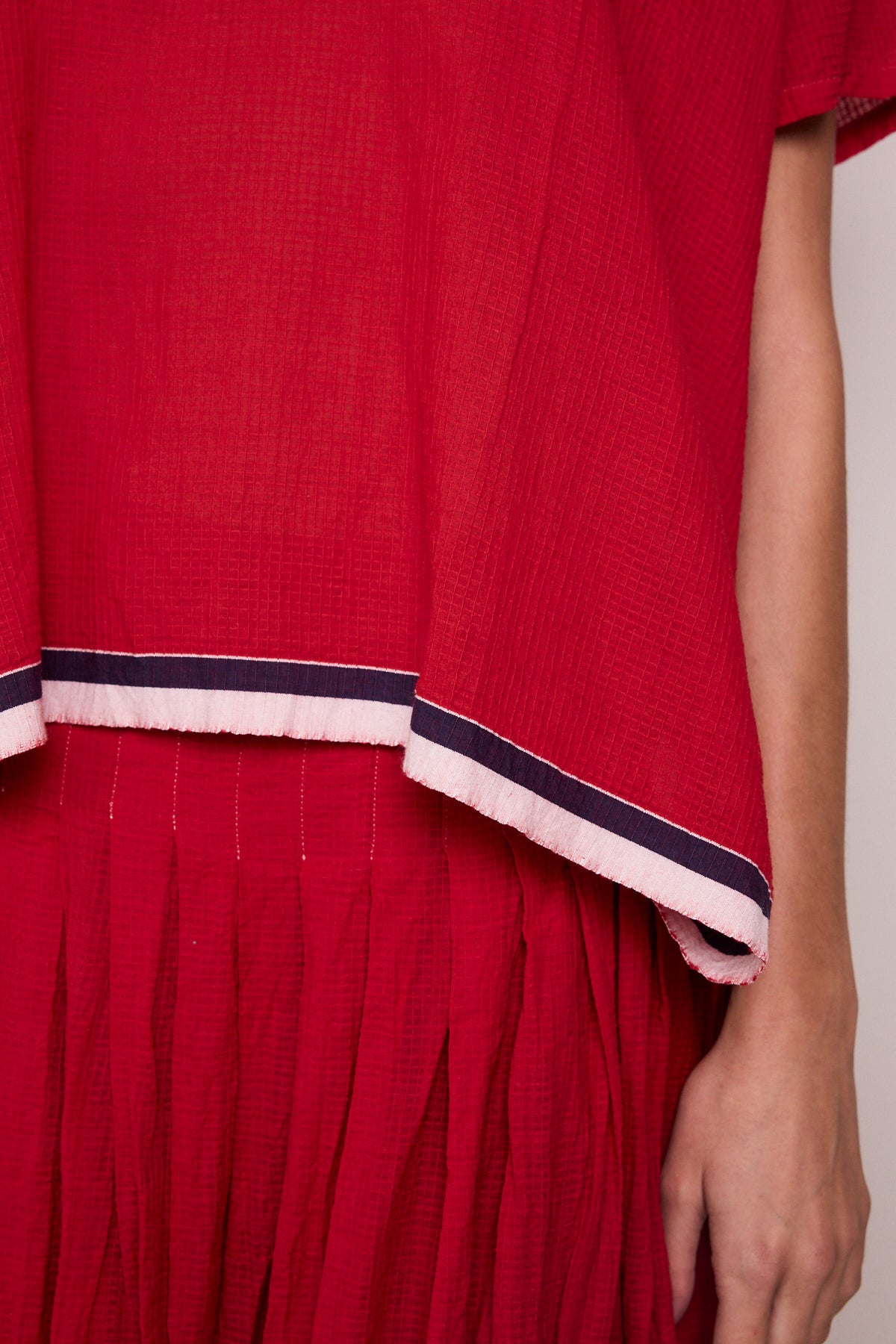 A boxy fit handloom 100% cotton shirt. Features a scoop neck with front open and double button with loop detail. Contrast white stitching and silver hardware buttons. Features a navy blue and white selvedge stripe along hemline. Short sleeved.