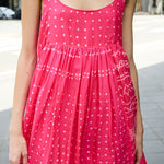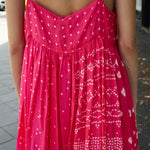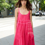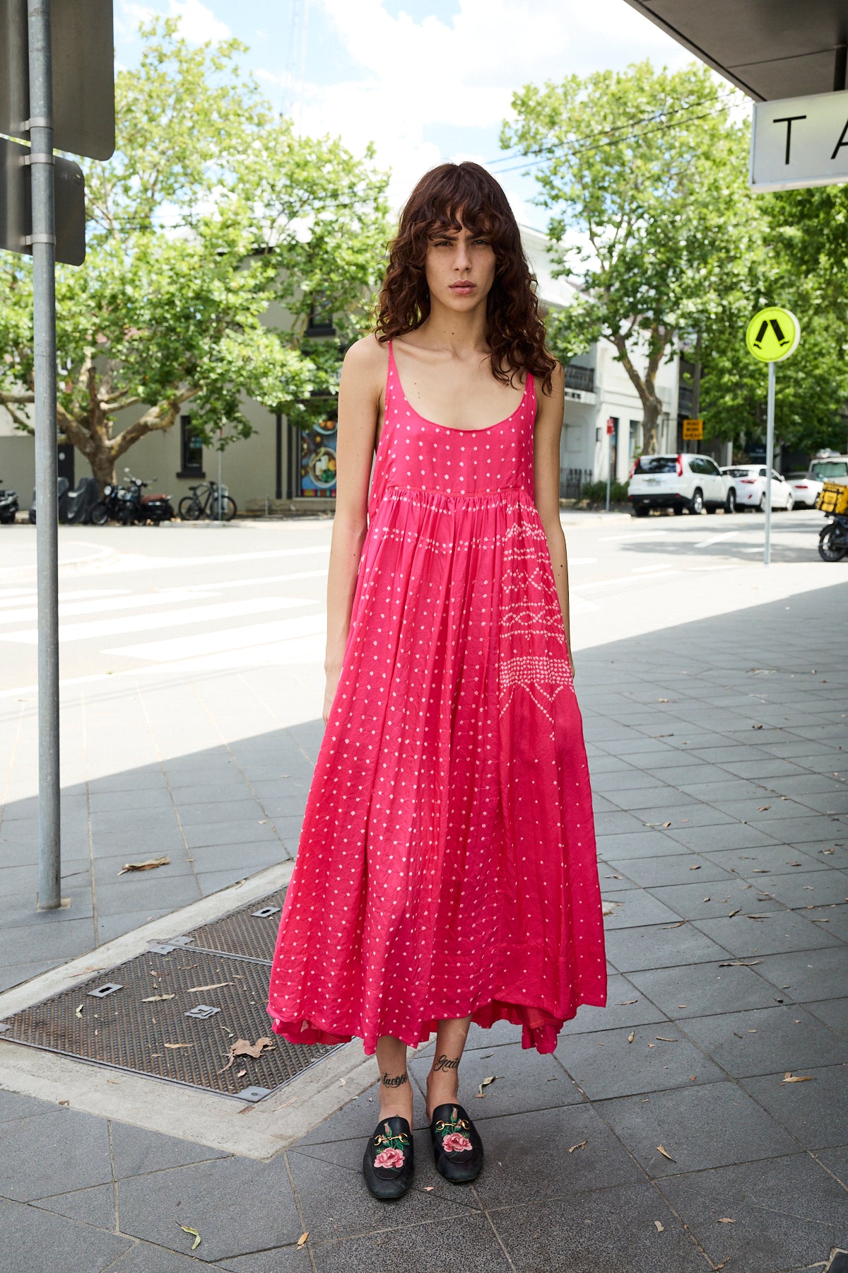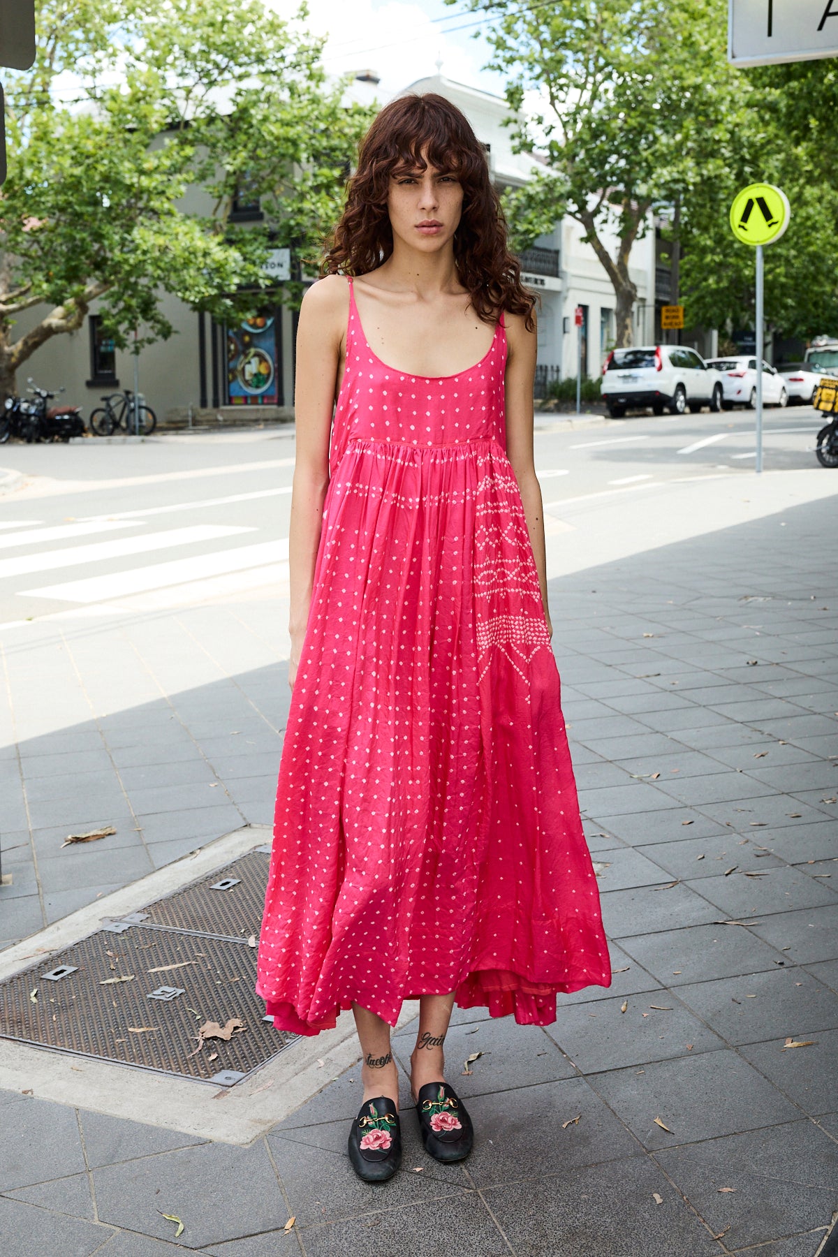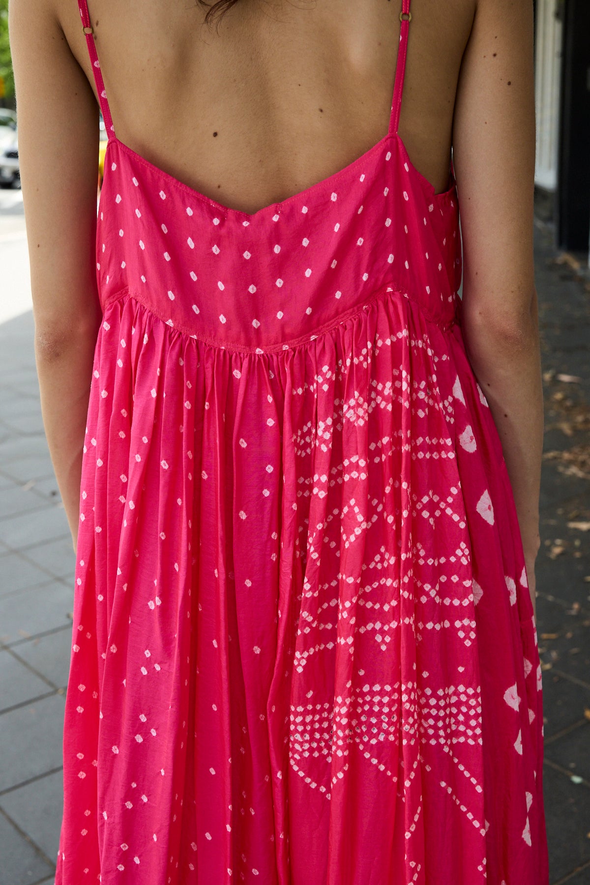 A intricately made silk babydoll style slip dress. Featuring a deep round neck with thin adjustable strap detail. Maxi length with gathers under the chest. Crafted with bandhini tie&dye polka dot patterns through the fabric. Lightweight style. Inside slip.