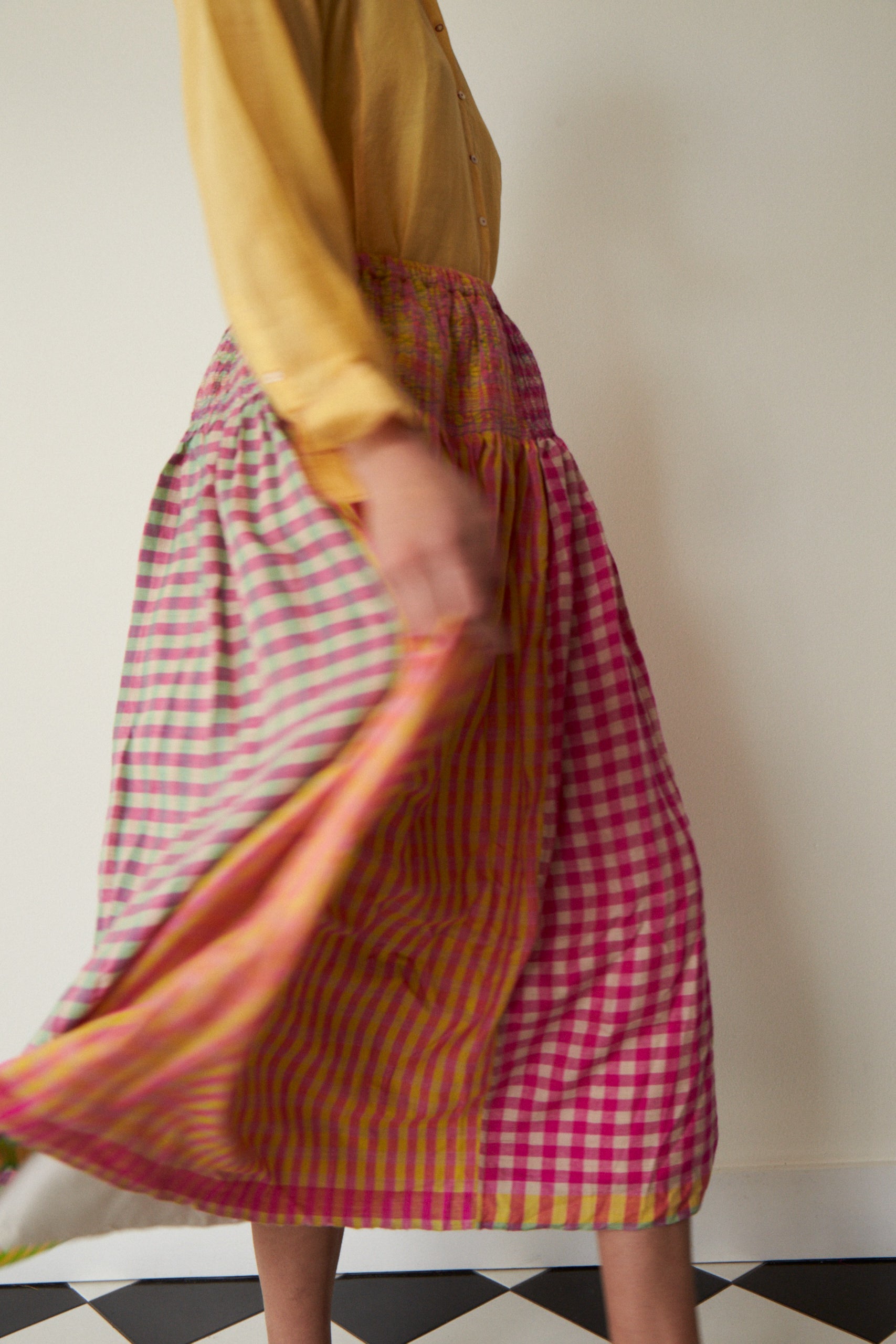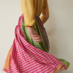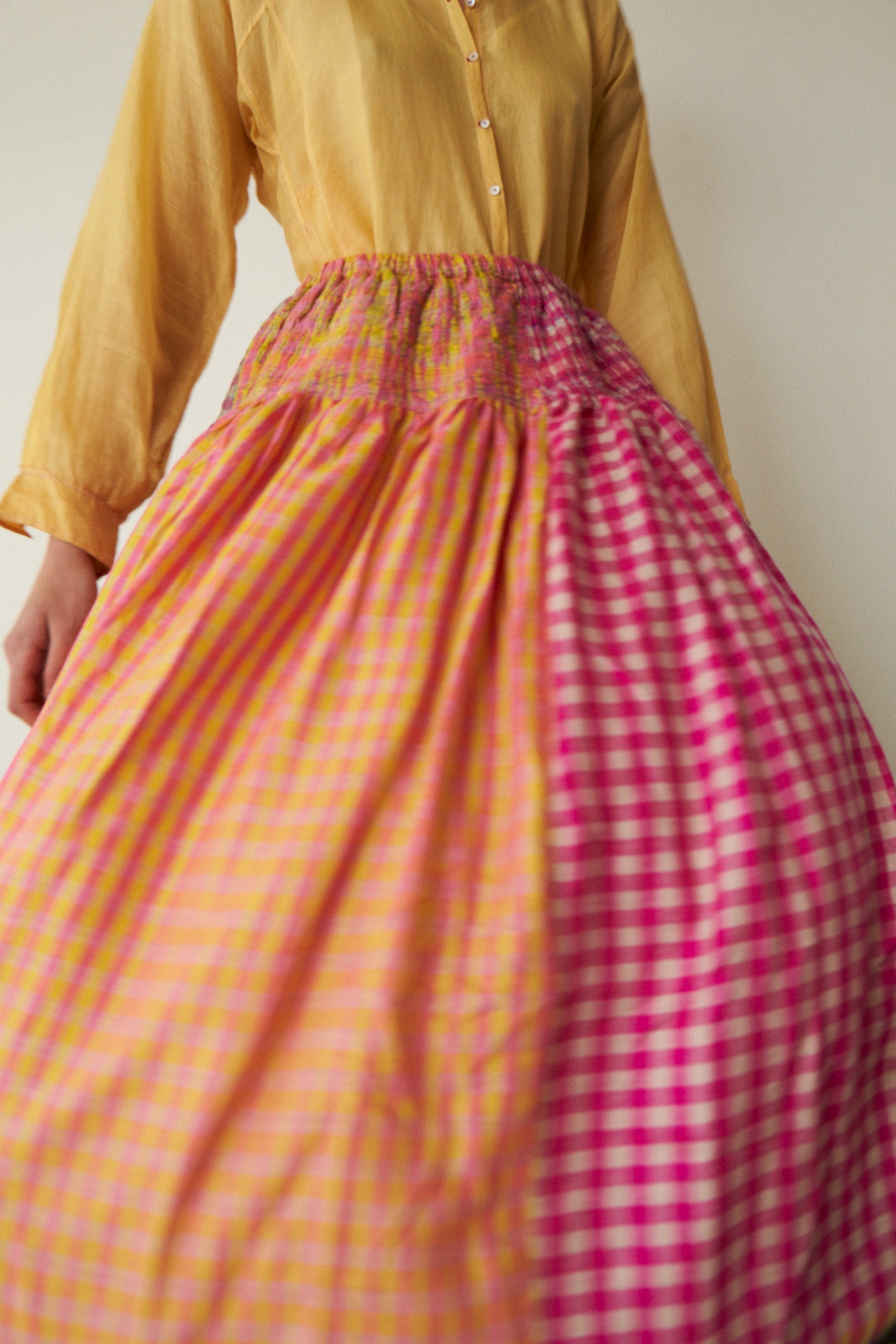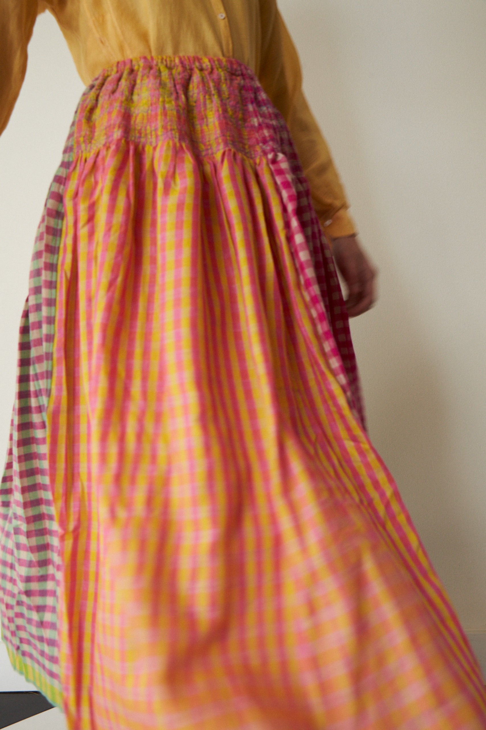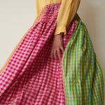 A delicate cashmere handloom smocked skirt. Features a lively mix of gingham coloured panels in contrast pink, green and orange. Embroidered multicolour stitching patterns with pleat detail below elasticated waist. Midi in length. 100% handwoven silk lining.