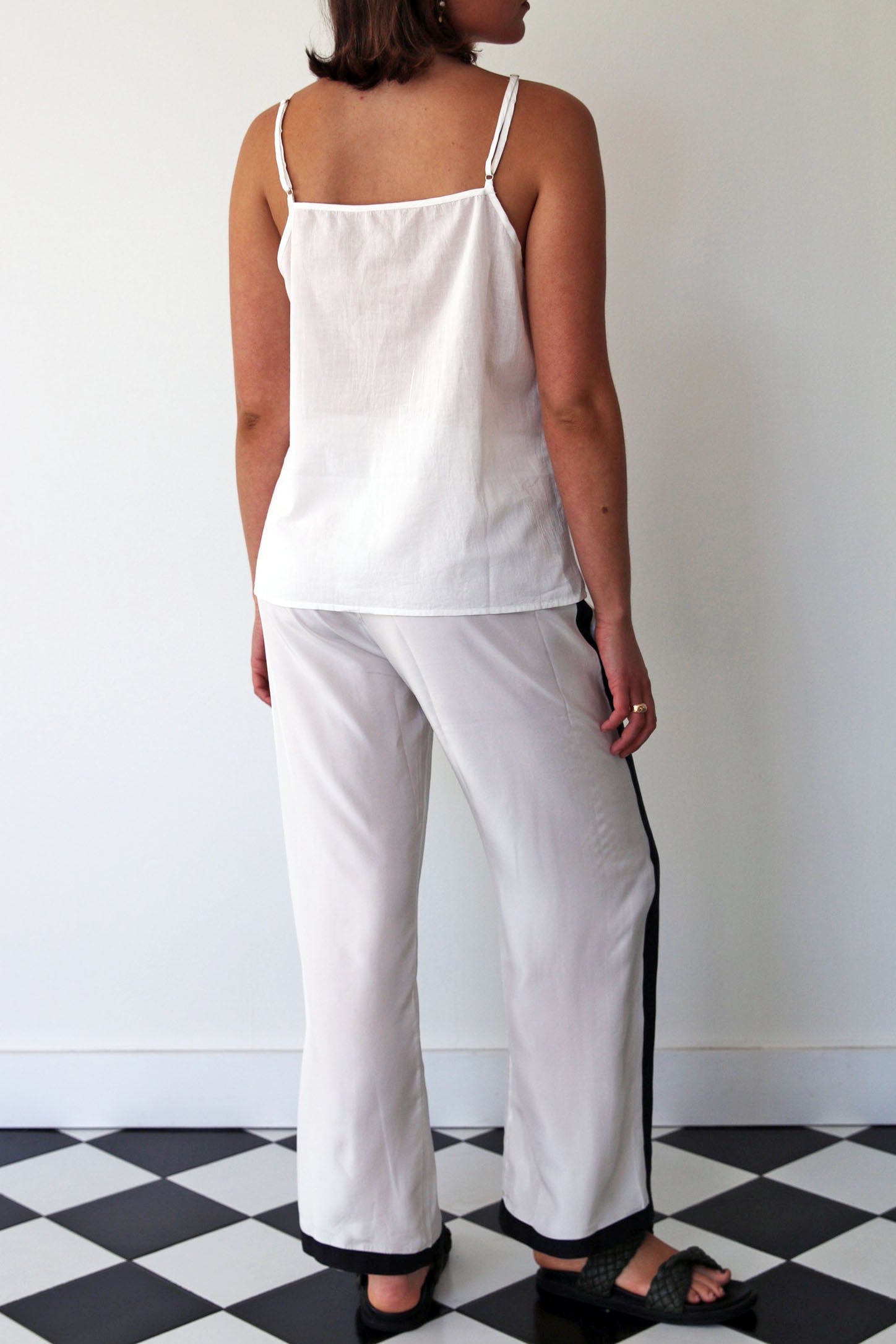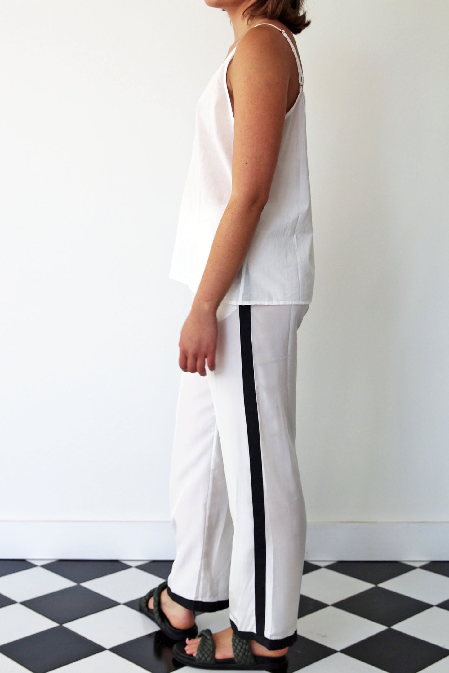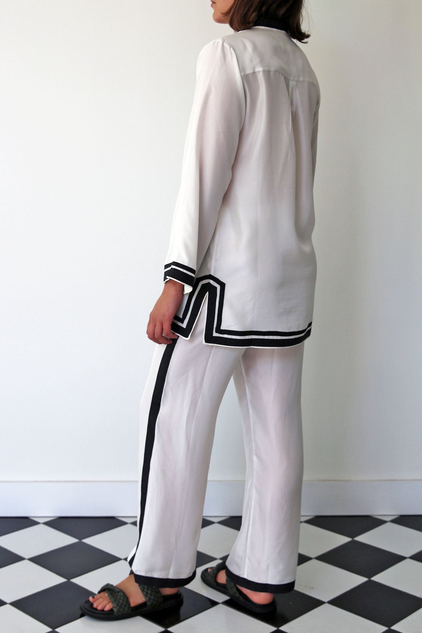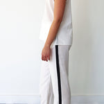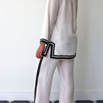 A tailored-straight leg pant in 100% silk. Features an elastic waist with drawstring fastening. Contrast black trim detail along sides and hem. Side pockets.