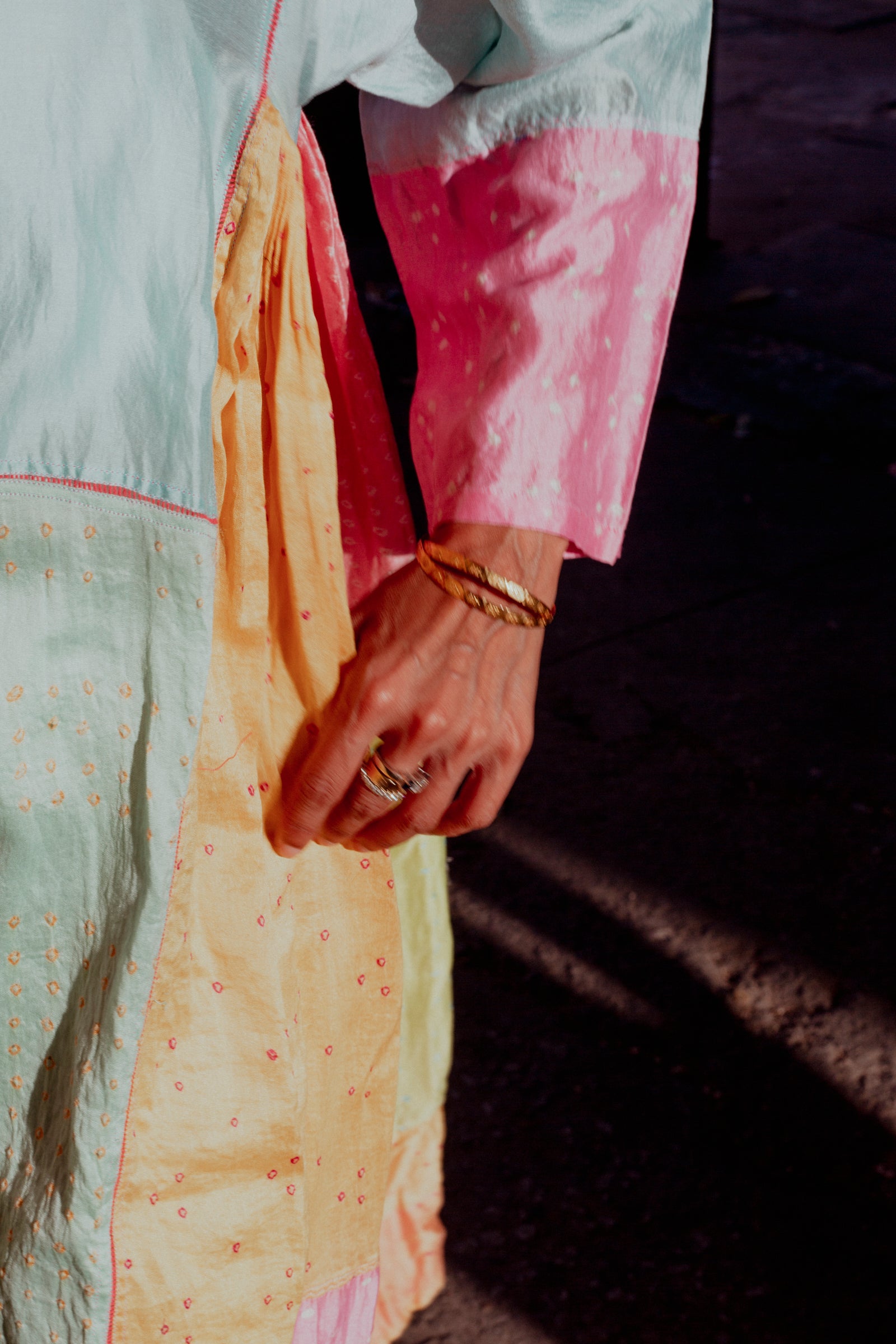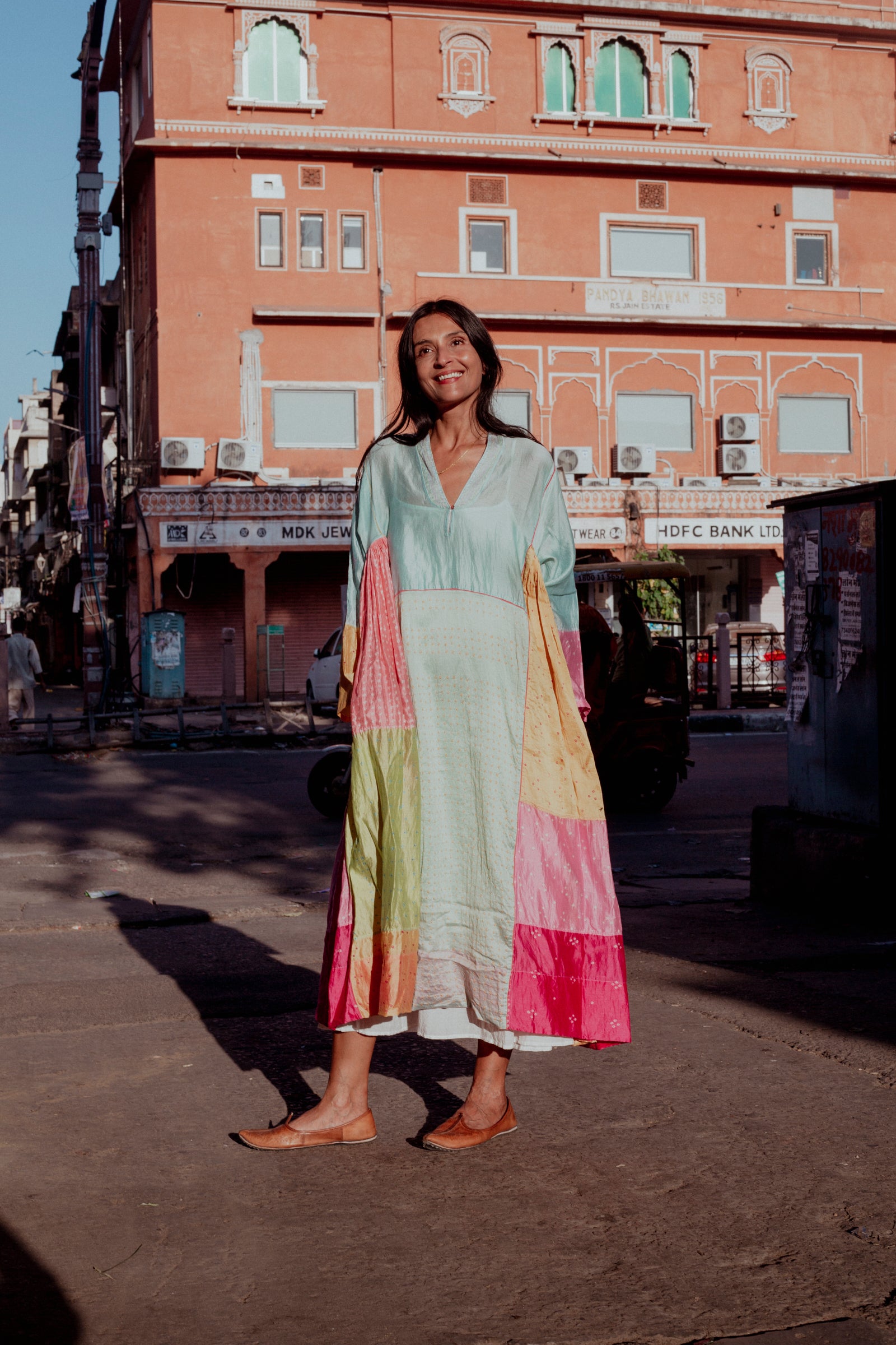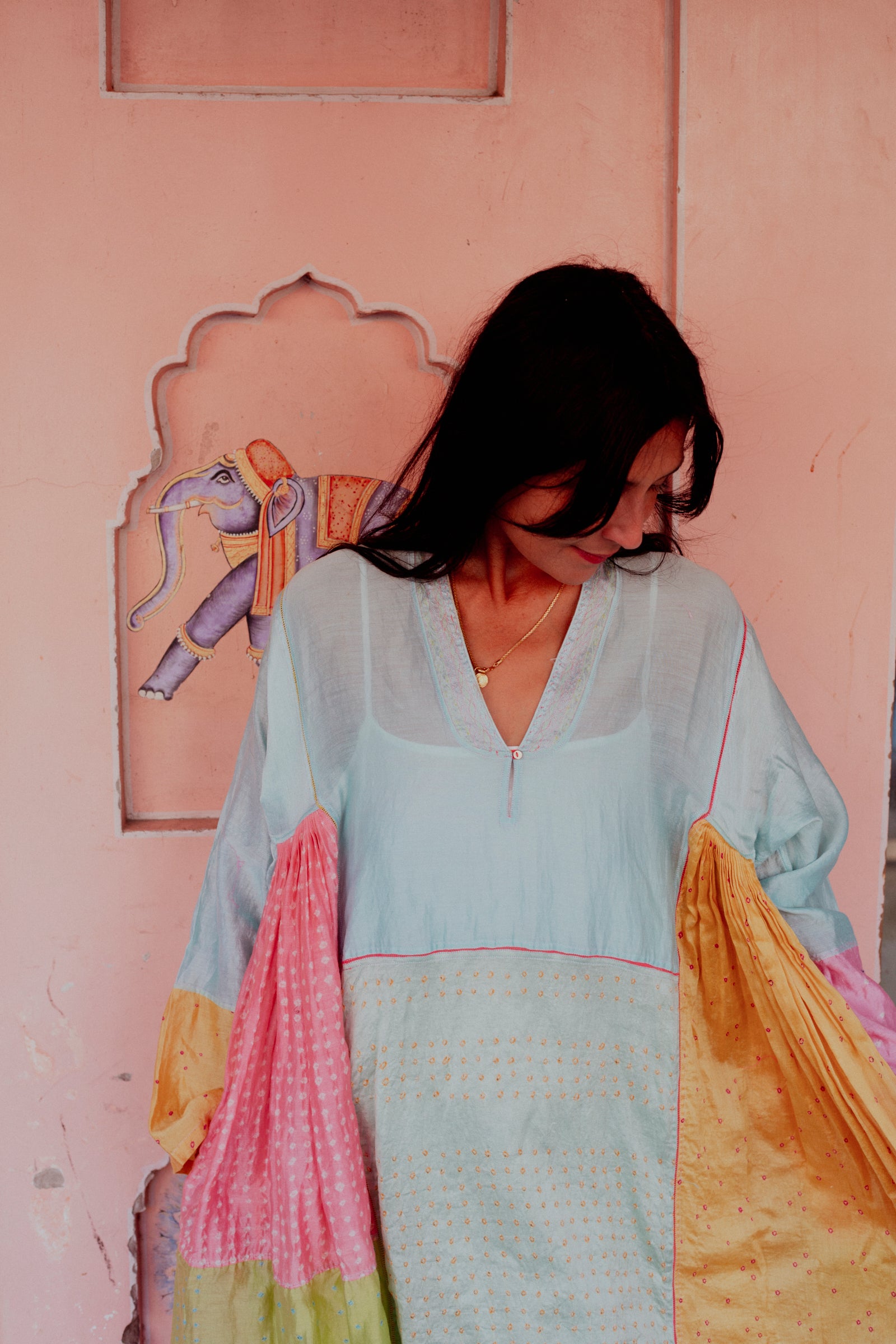 A silk caftan dress, featuring intricate hand tie dye bhandini panels on sky blue. Features a front V neck with embroidery and single metallic button closure. Long sleeved with contrast mulitcolor pleat detail under arms. Assymetric in design, slightly longer in the back than front. Side pocket detail. A sheer finish.