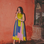An A-line sleeveless dress. A high neck with metallic button closure. Features ombre tie&dye in contrast mutlicolor cobalt blue, green, lime, purple and pink through the dress. Side pleat detail under armhole. Side pockets. A sheer and delicate finish.