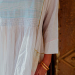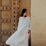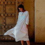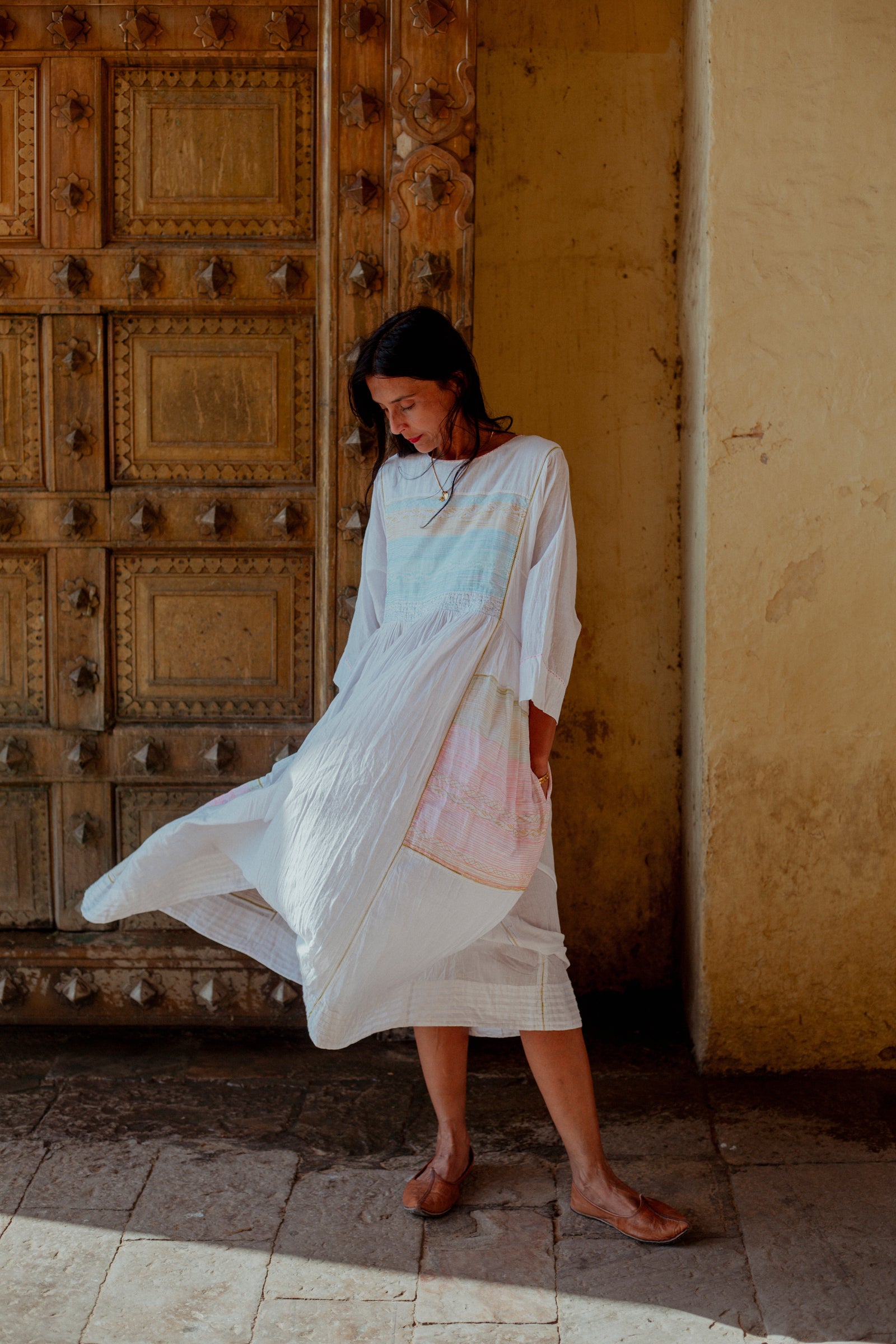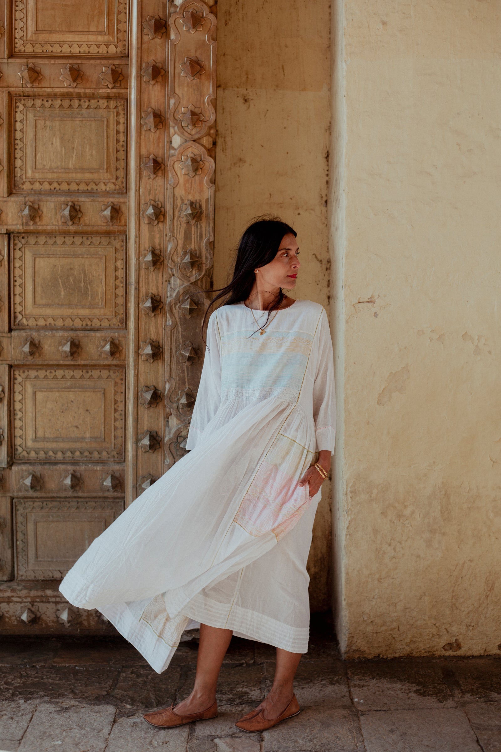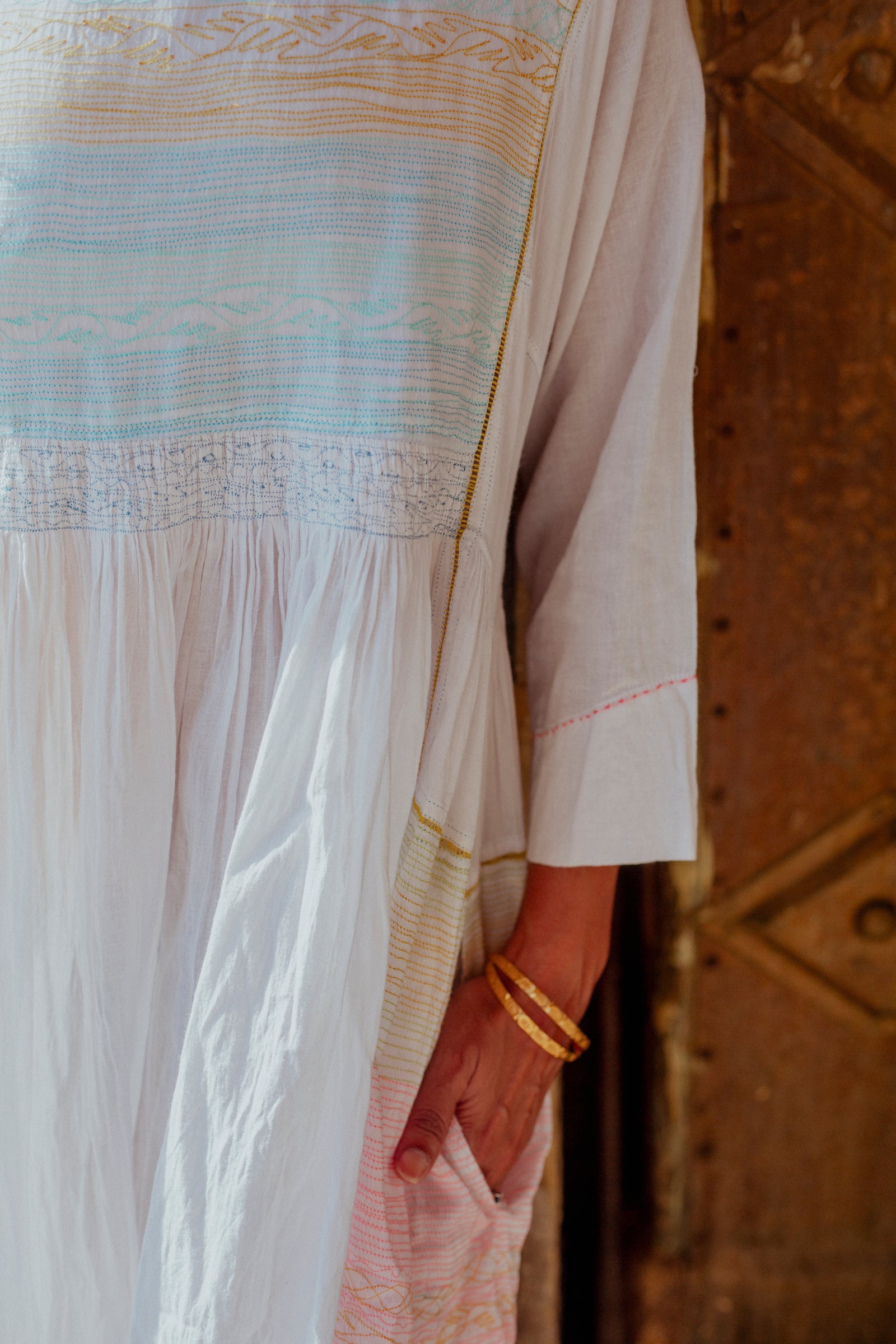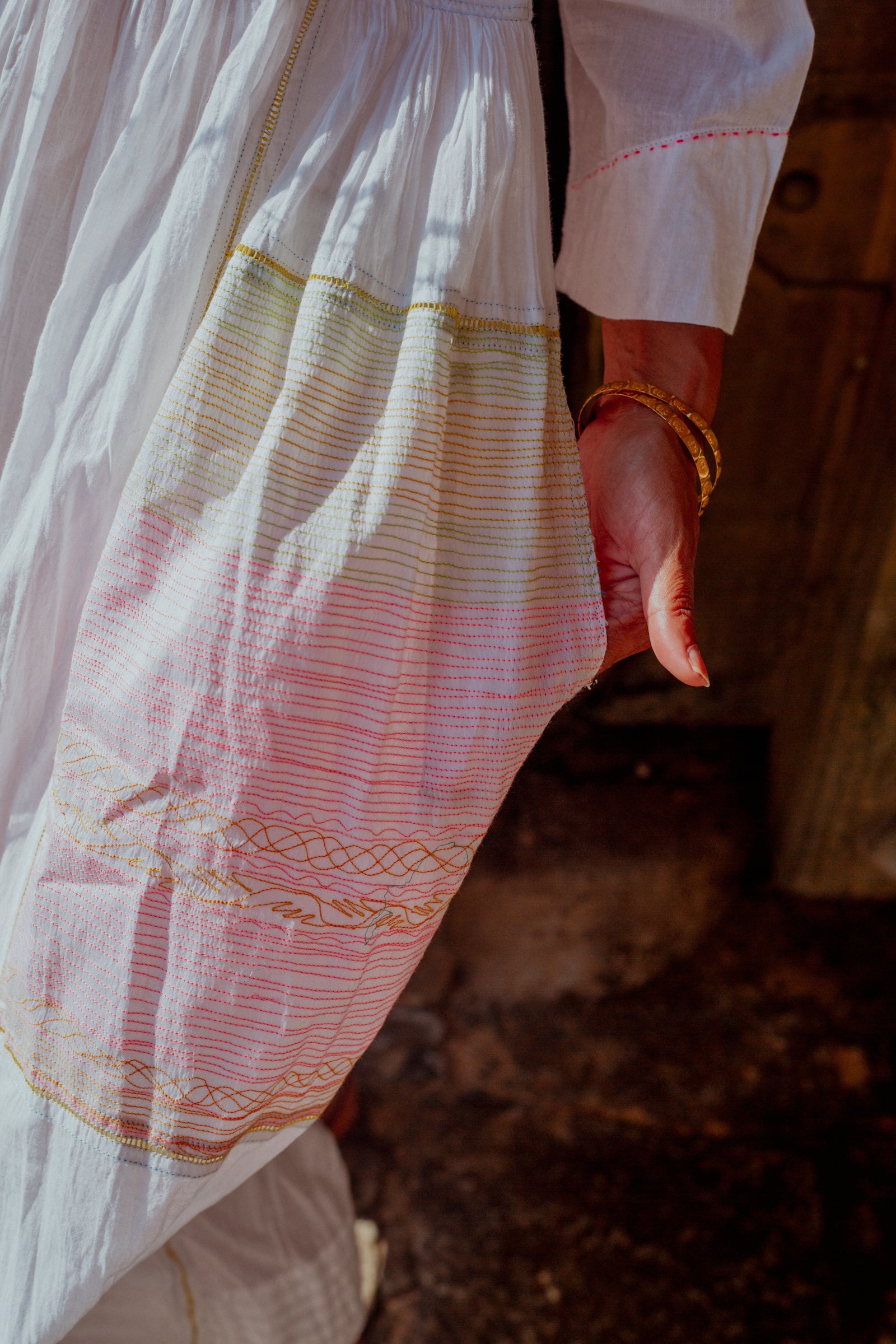 A delicately handwoven 50% cotton 50% silk full sleeved dress. High round neck with side ruching detail. Features intricate patterned embroidery on the front, back and side panels in multicolour white, yellow, pink, orange and blue. Contrast fuchsia pink hand kantha stitch detail through the dress. Yellow interlock detail along all panels. A sheer and delicate finish in white muslin. Side slit pockets.