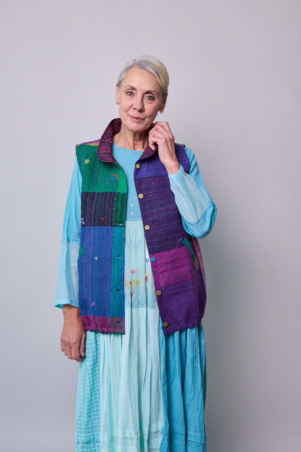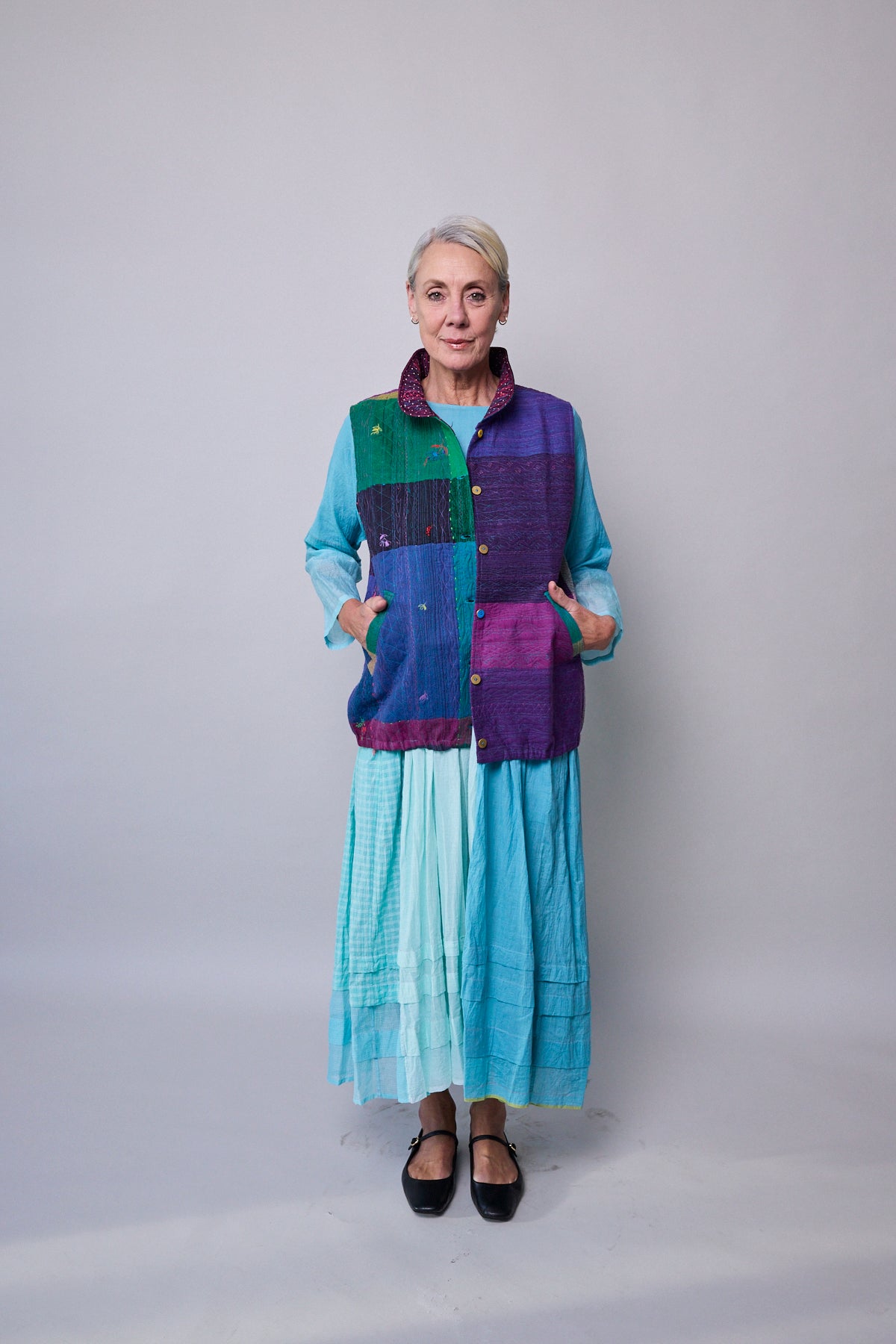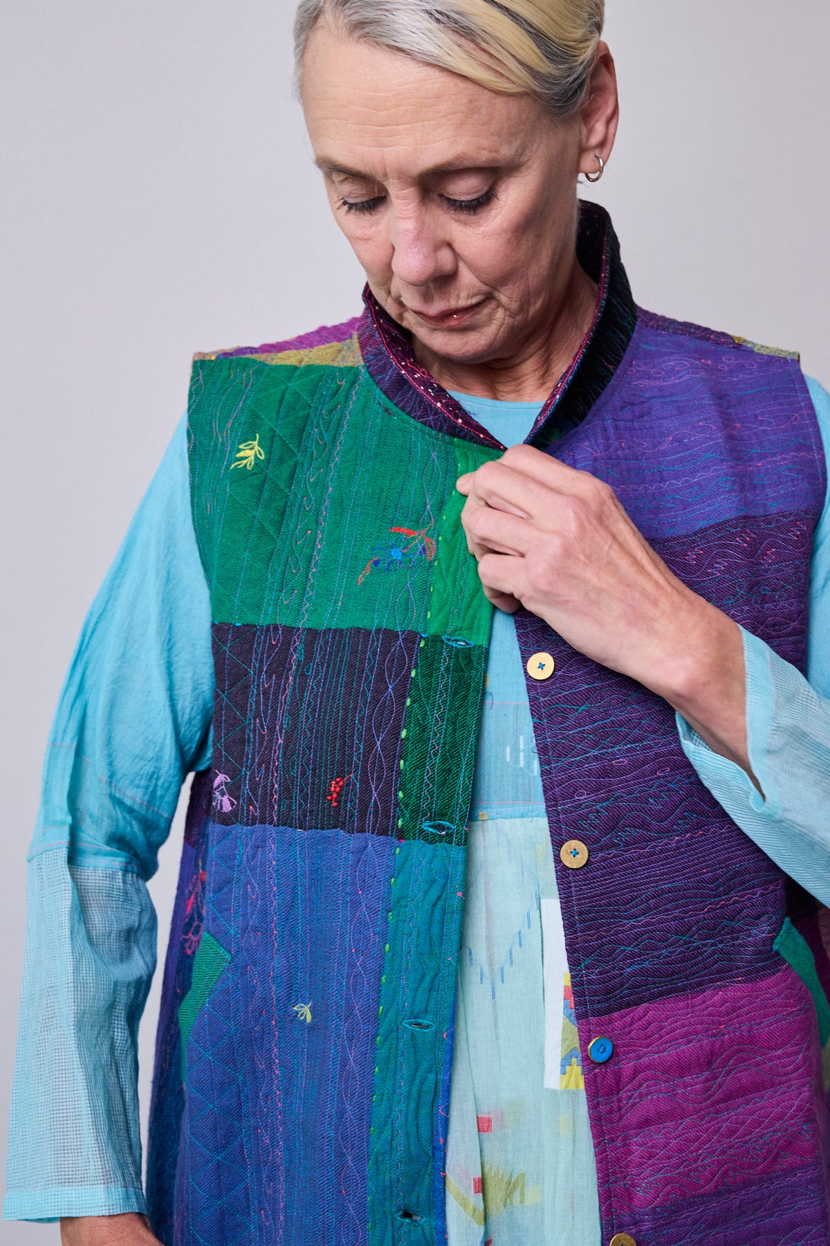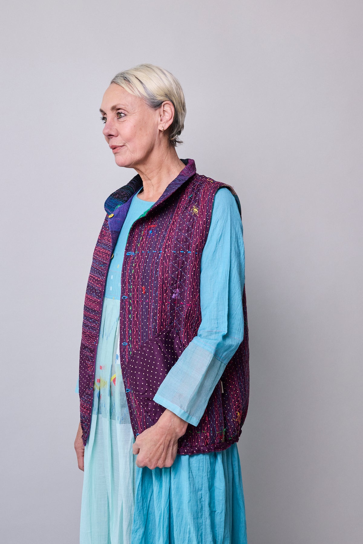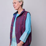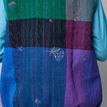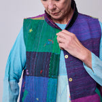 A statement collared vest handwoven from soft wool and silk. Multicolour with embroidered design  and motifs right through the vest. Front metal button closure in yellow, blue and gold with contrast embroidery. Front pockets on either side. Pink and green hand stitch detail. Elastic hem. Fully lined in luxurious purple polka dot silk. Reversible style.