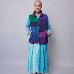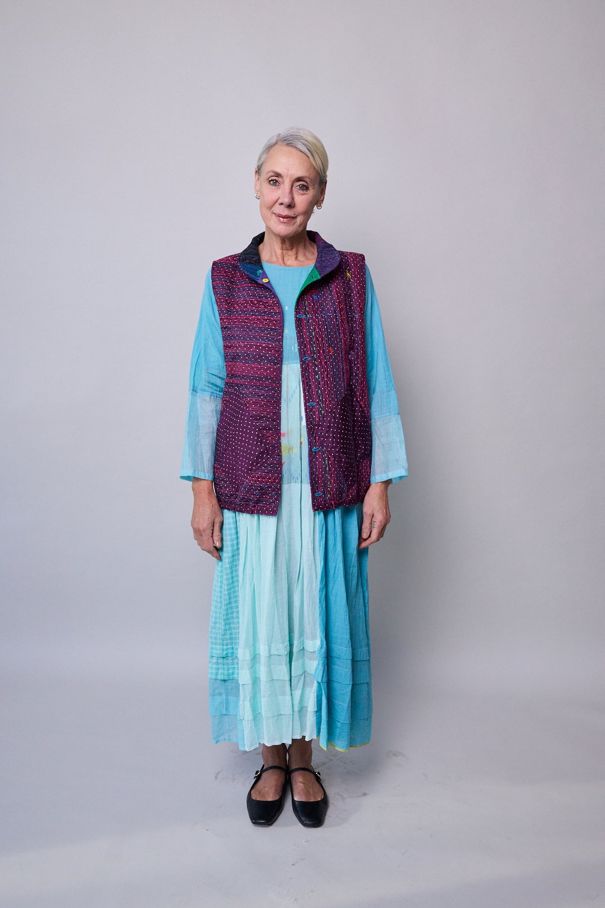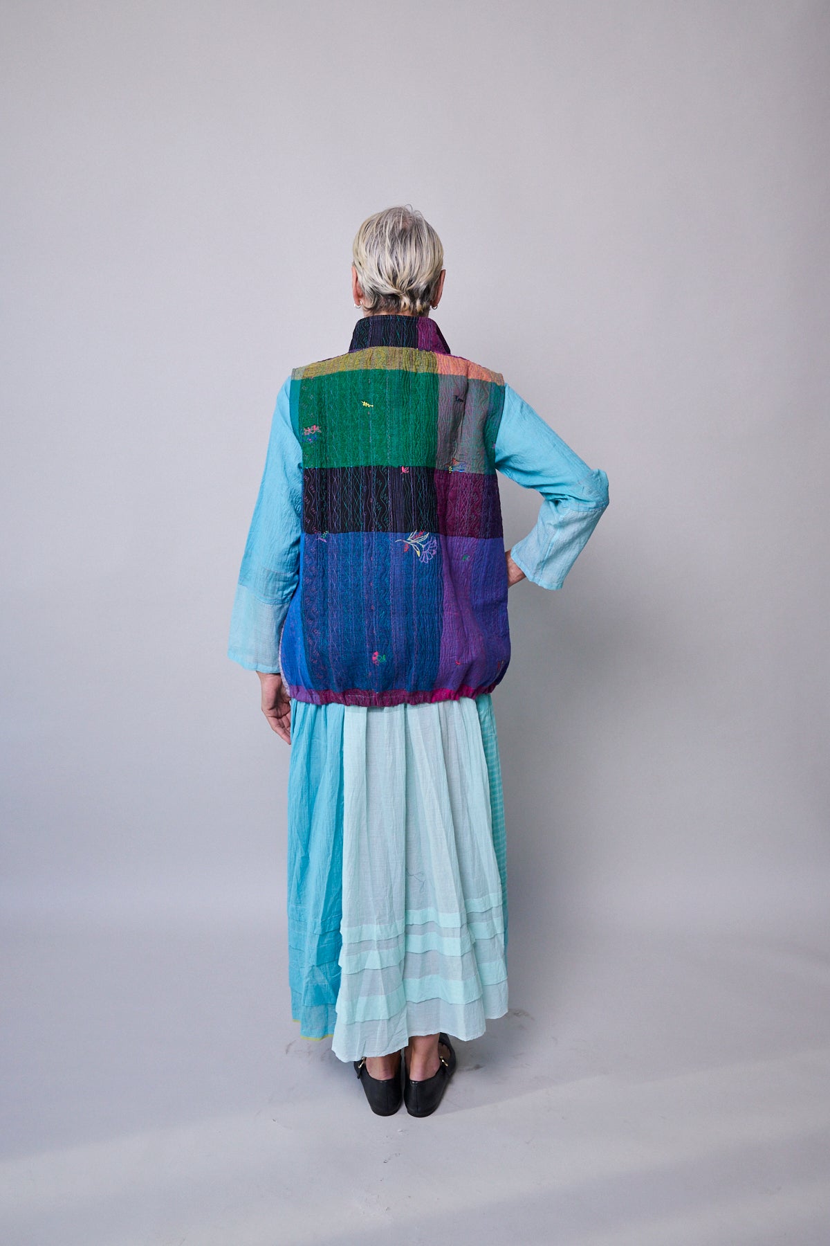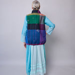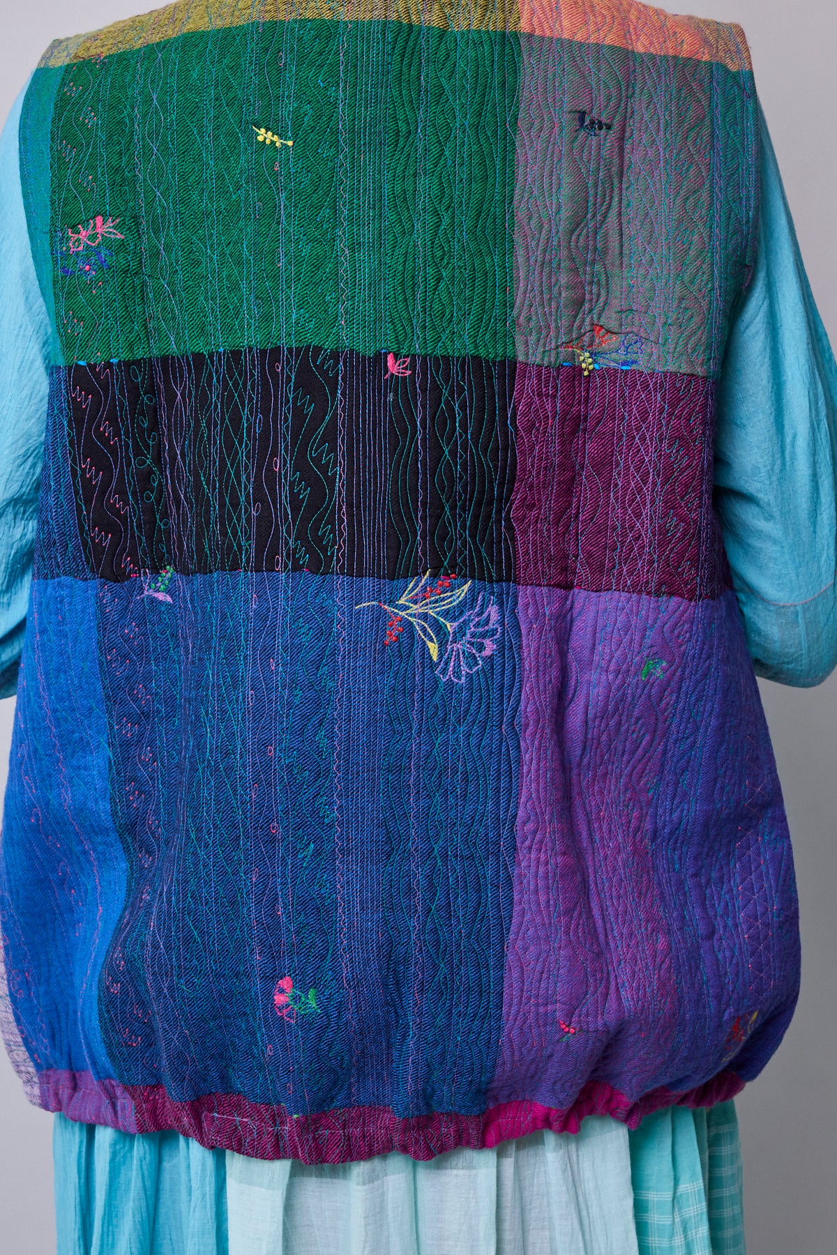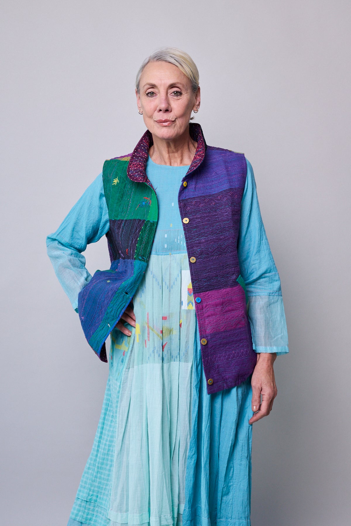 A statement collared vest handwoven from soft wool and silk. Multicolour with embroidered design  and motifs right through the vest. Front metal button closure in yellow, blue and gold with contrast embroidery. Front pockets on either side. Pink and green hand stitch detail. Elastic hem. Fully lined in luxurious purple polka dot silk. Reversible style.